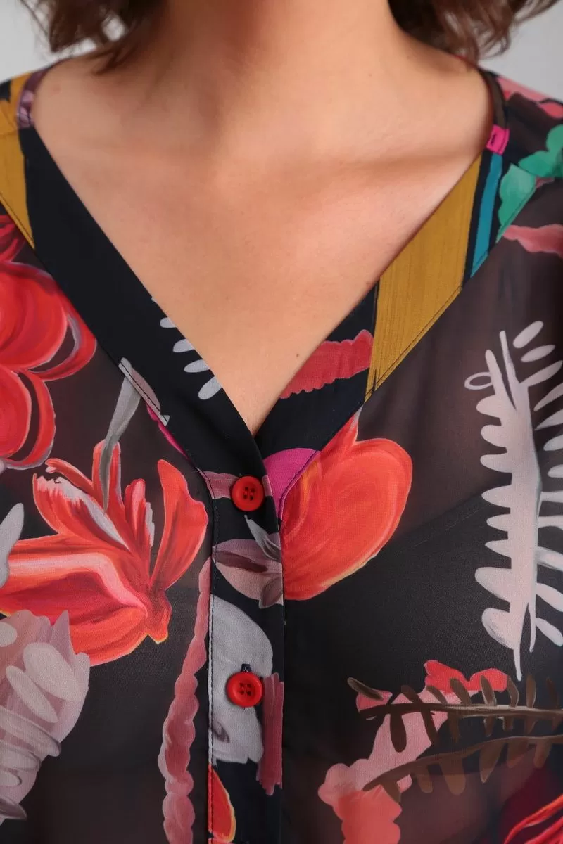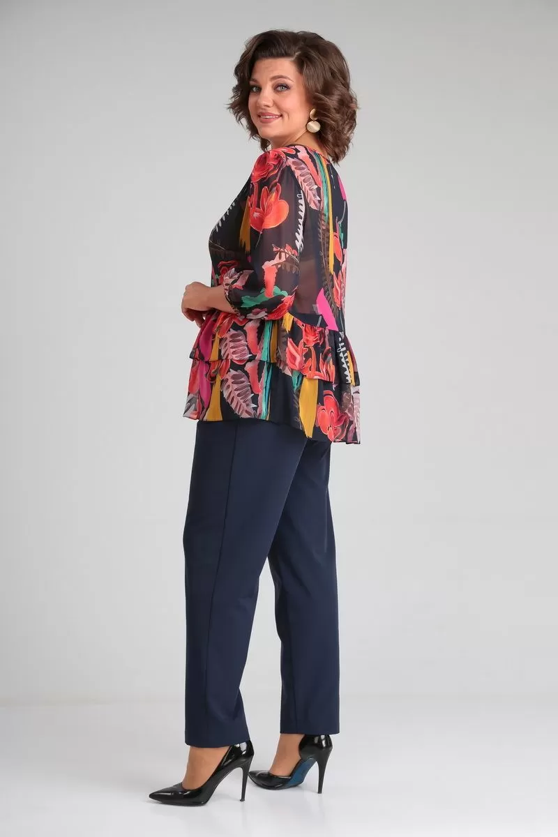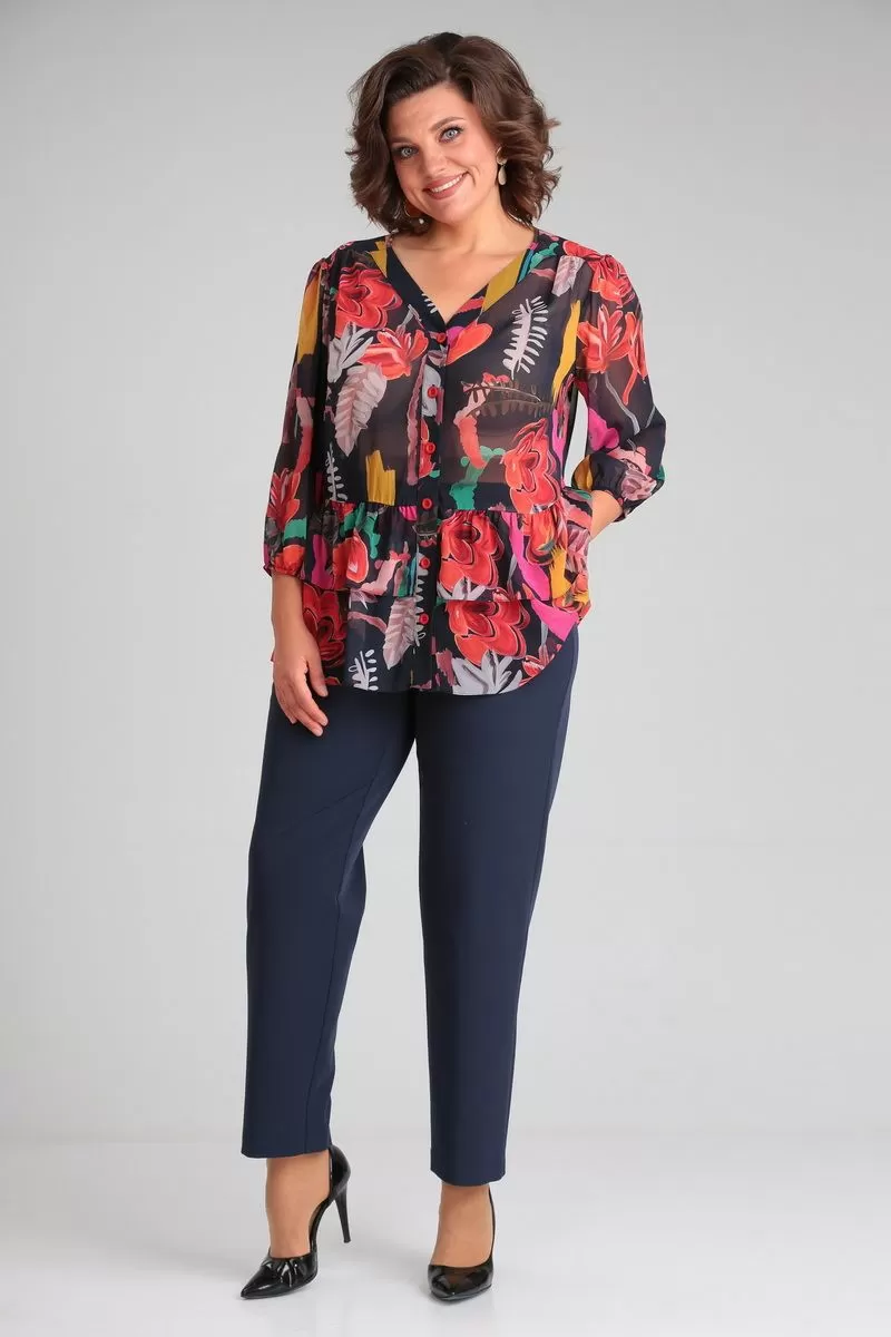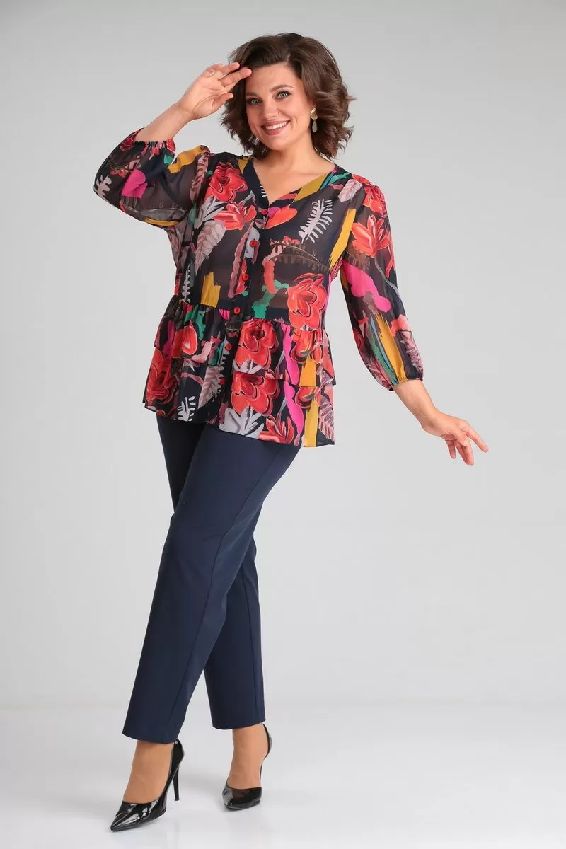 Блуза свободного силуэта, выполненная из легкой шифоновой ткани (не тянется) с модным, красочным принтом. Блуза отрезная чуть ниже линии талии. Верхняя часть переда с нагрудными вытачками, отрезной кокеткой, отрезной планкой. Застежка центральная на петли-пуговицы. Верхняя часть спинки со средним швом. Нижняя часть блузки оформлена двумя ярусами присборенных воланов. Рукав втачной, одношовный со сборкой по окату и резинкой по низу.