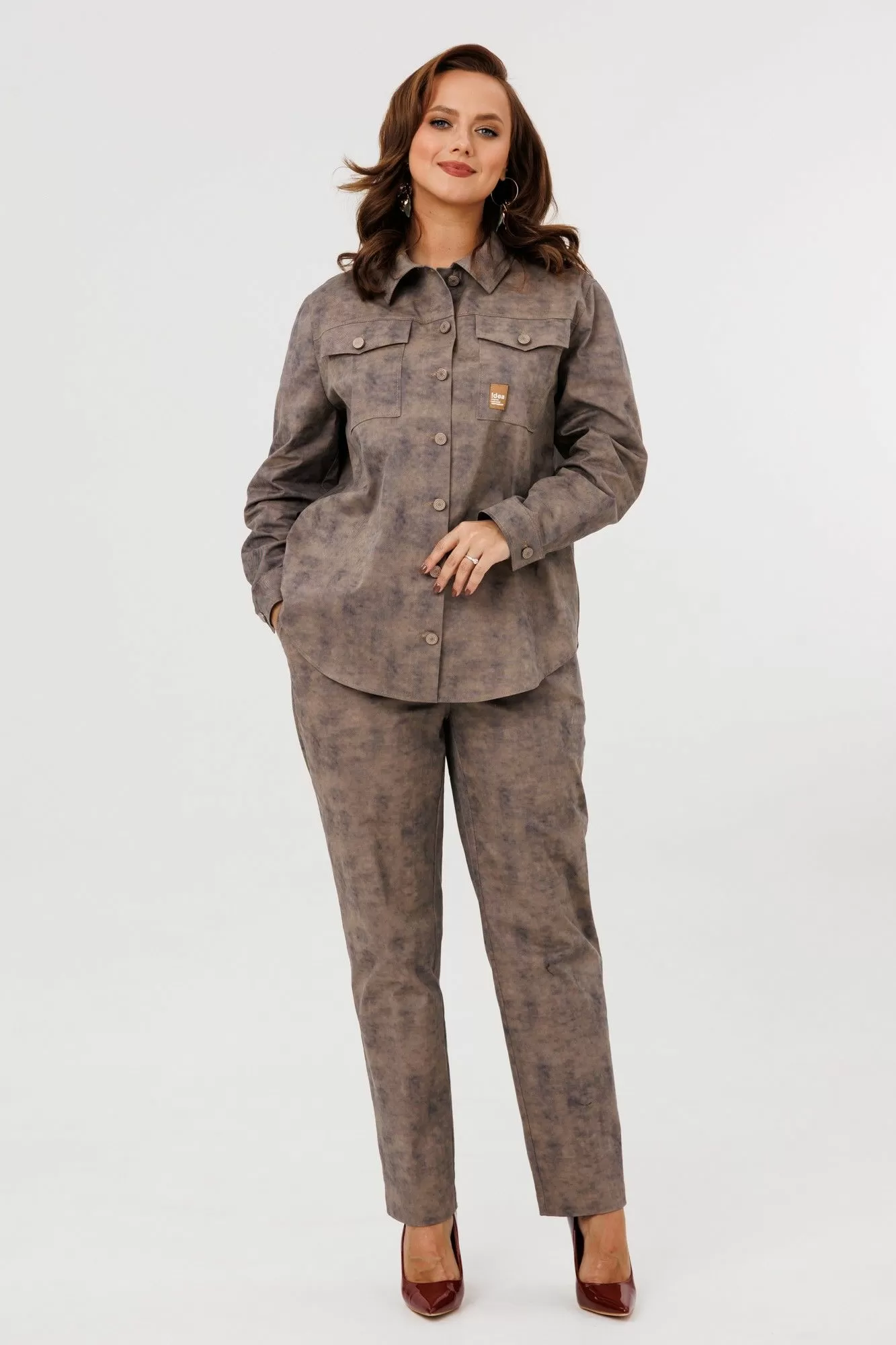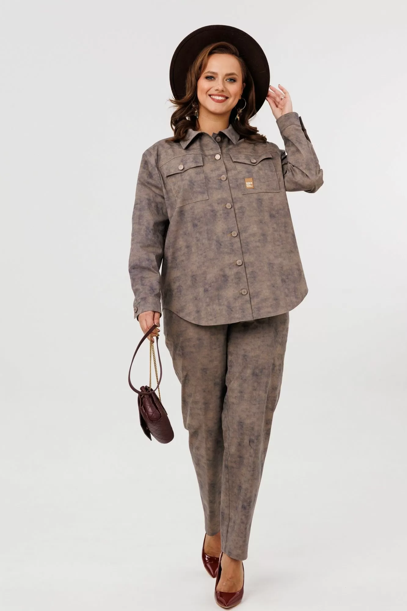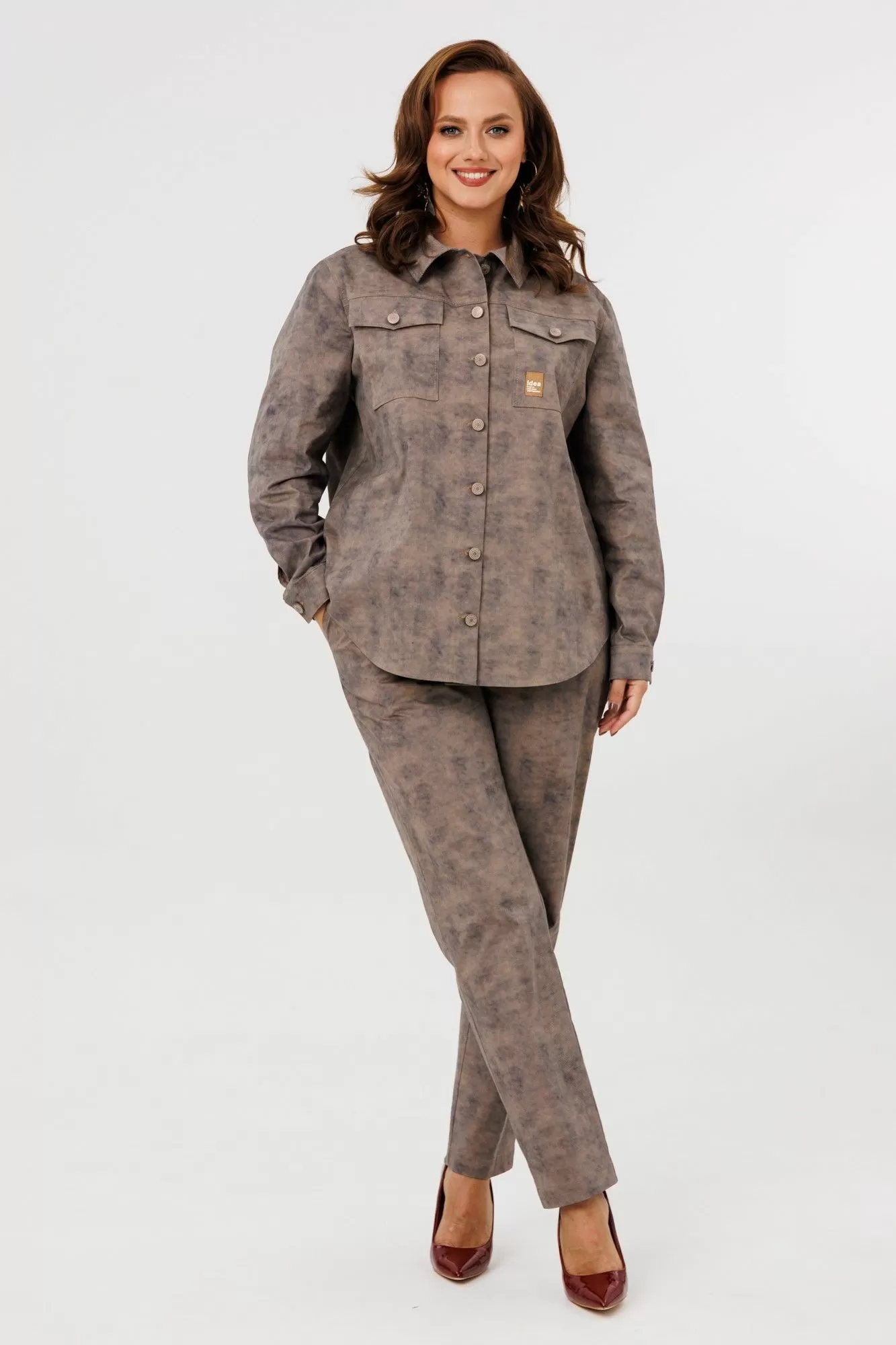 Стильный женский костюм состоит из рубашки и брюк, который выполнен из джинсовой ткани (не тянется). Рубашка прямого силуэта со спущенной линией плеча. По переду отрезные кокетки, в шов которых вставлен клапан, накладные карманы. По левому карману – пришивной лейбл. Застежка центральная на петли-пуговицы. Спинка с отрезной кокеткой, нижняя часть со средним швом. Рукава втачные, двухшовне, по низу с притачной манжетой, застегивающейся на пуговицу. Воротник отложной, рубашечного типа. По боковым швам разрезы, низ прямой, разноуровневый.