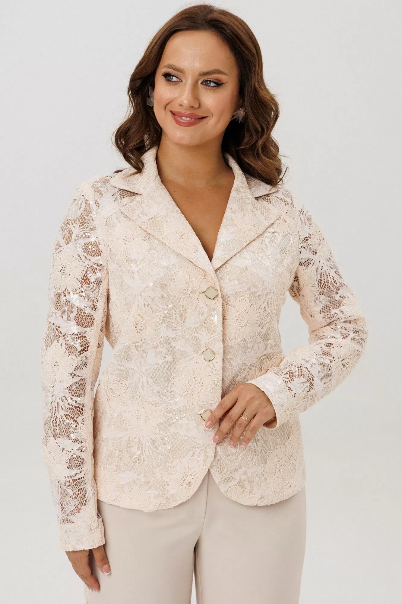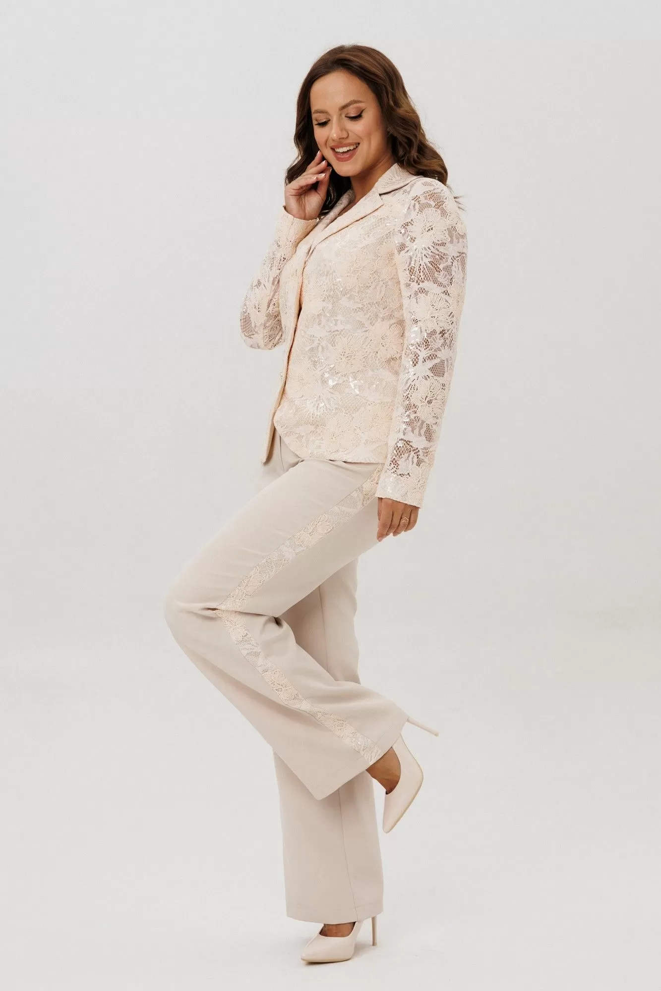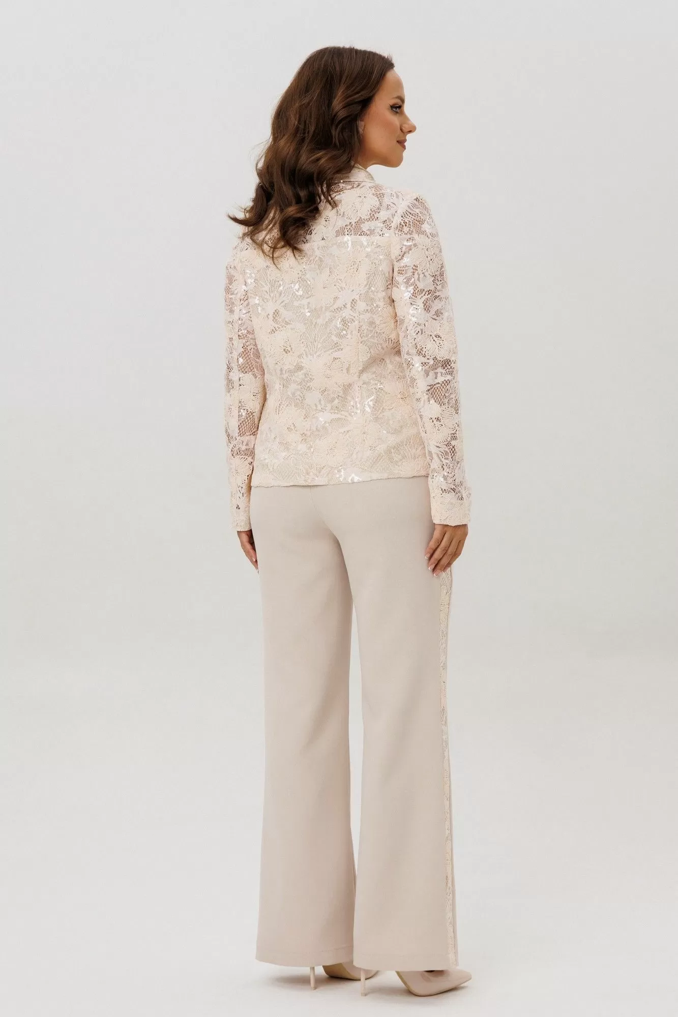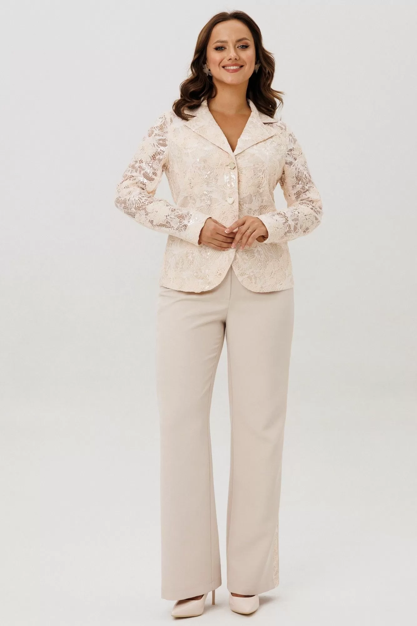 Нарядный женский костюм, состоящий из жакета и брюк, выполненный из костюмной ткани (тянется) и из гипюра с вышивкой и пайетками (не тянется).