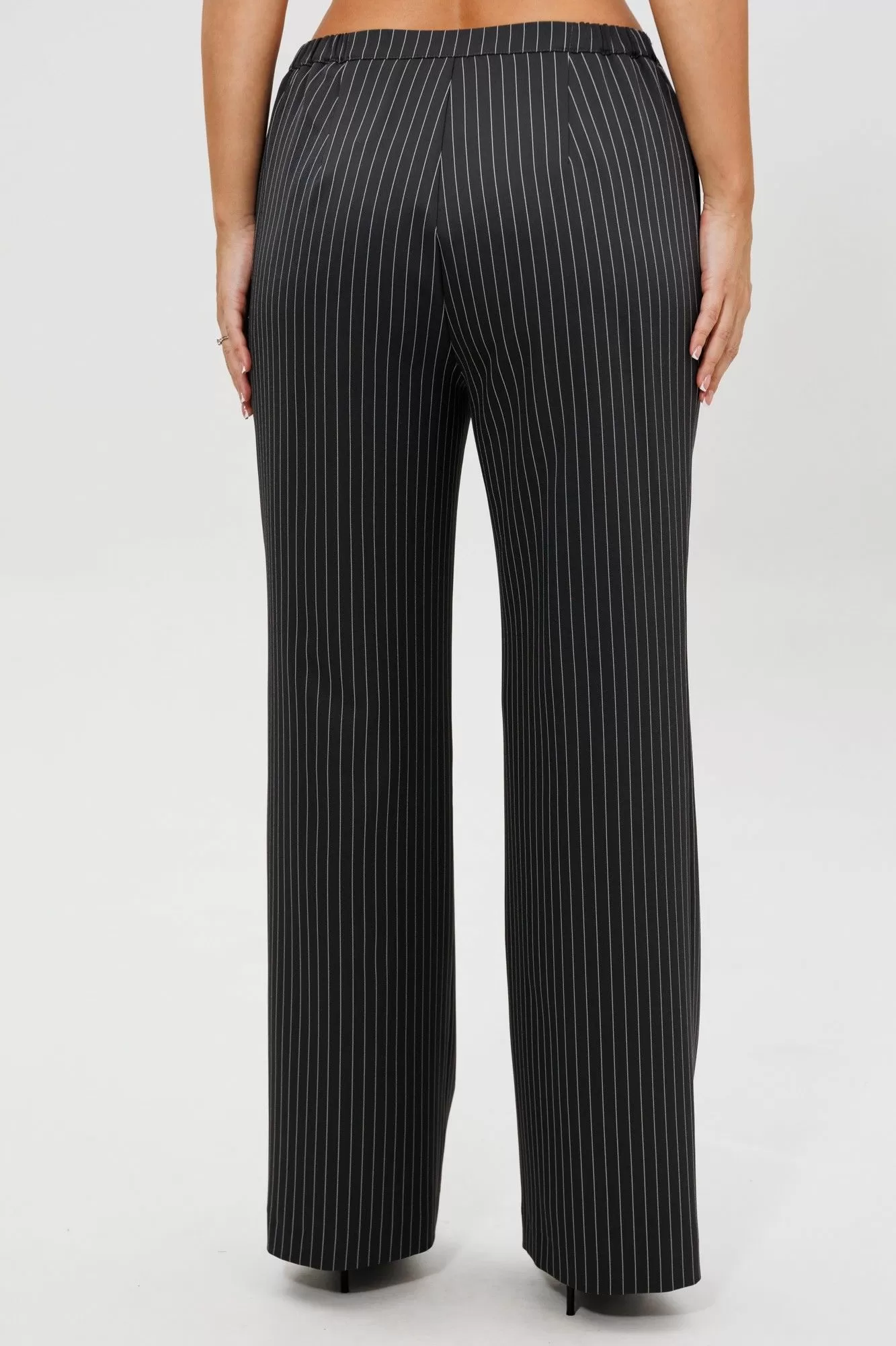 Брюки прямого кроя с высокой посадкой, выполненные из костюмной ткани в тонкую полоску (чуть тянется) с наклонными карманами в боковых швах. По срезу банта застежка-молния. Верхний срез оформлен поясом с эластичной резинкой по задней половинке.