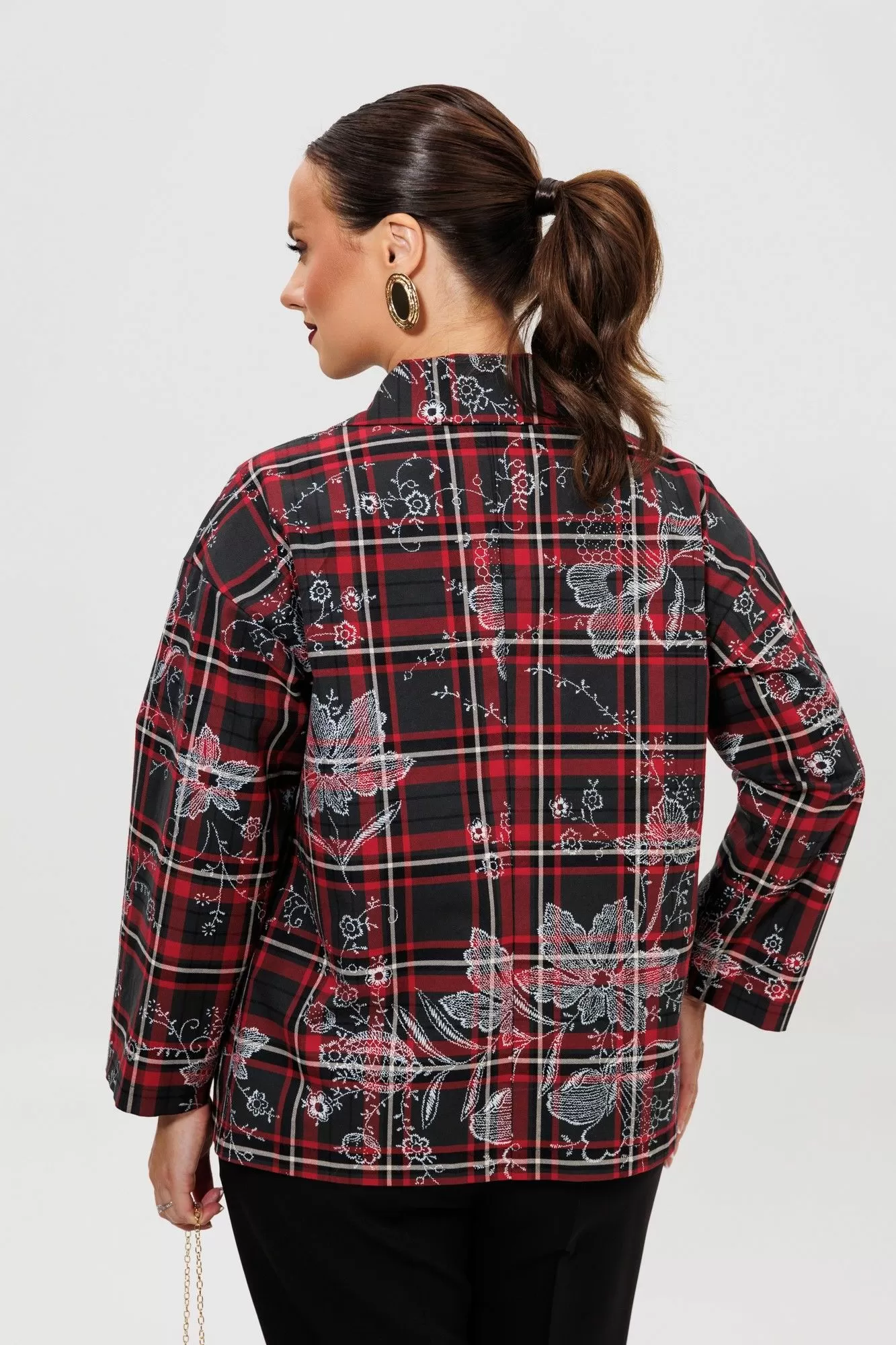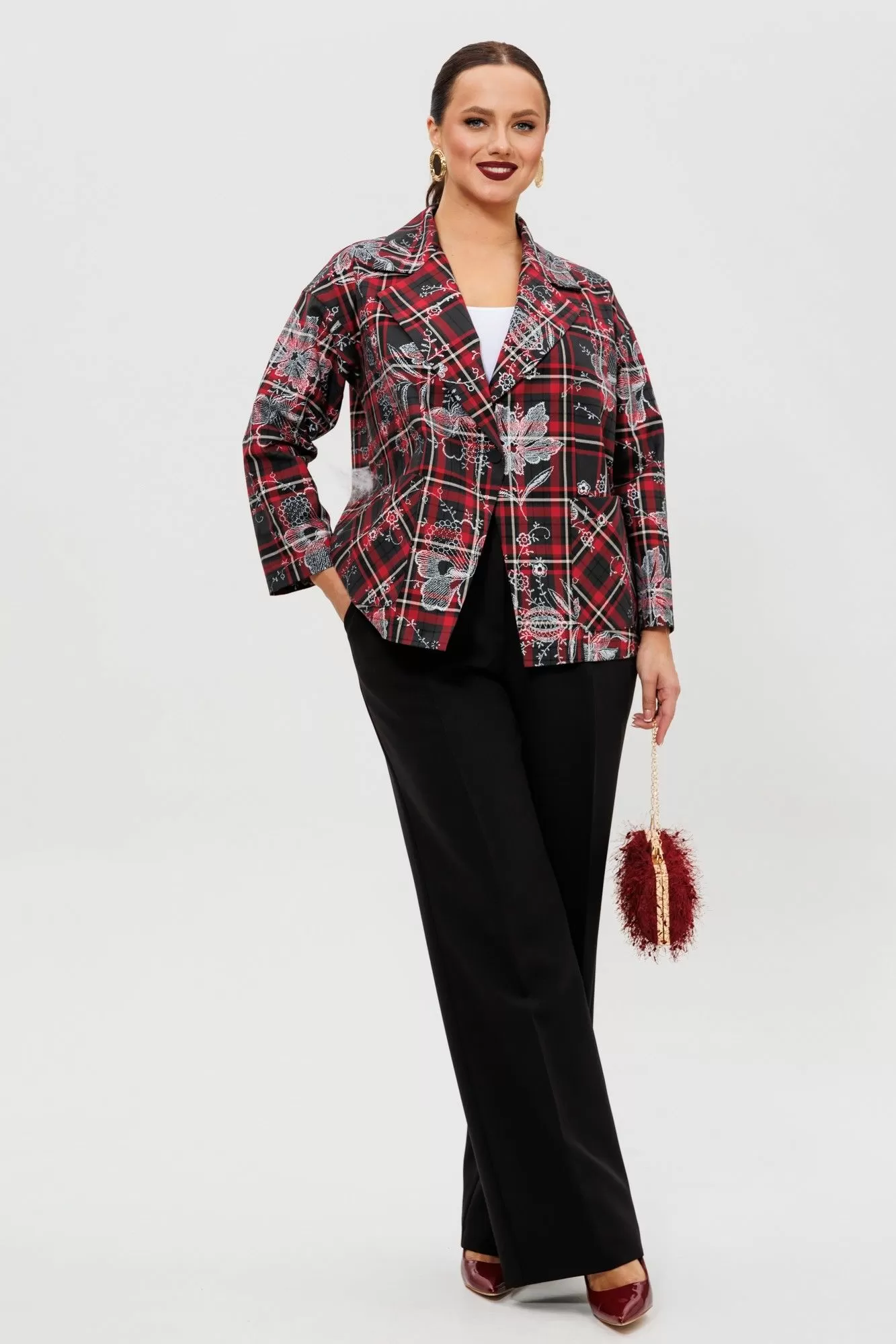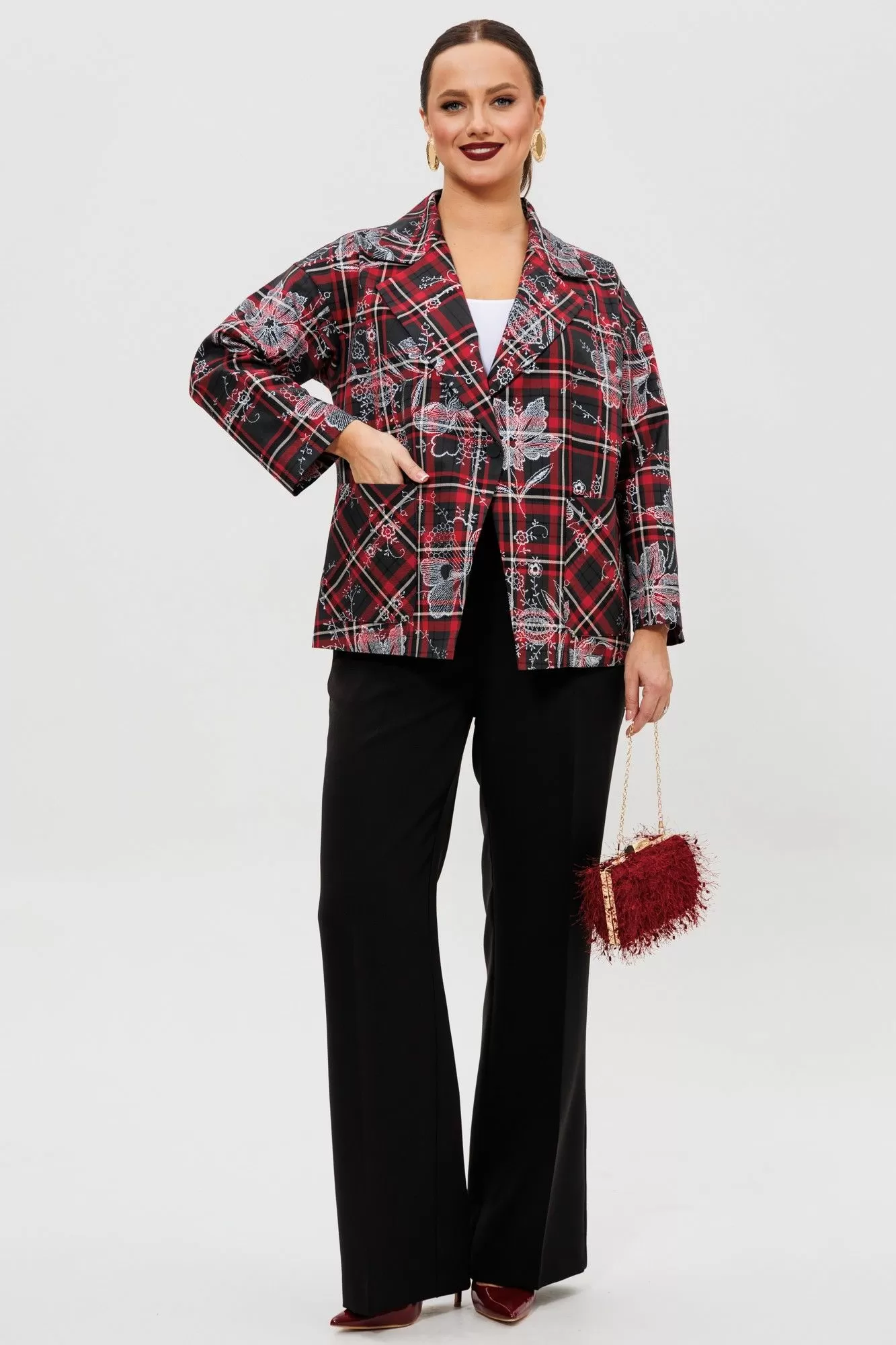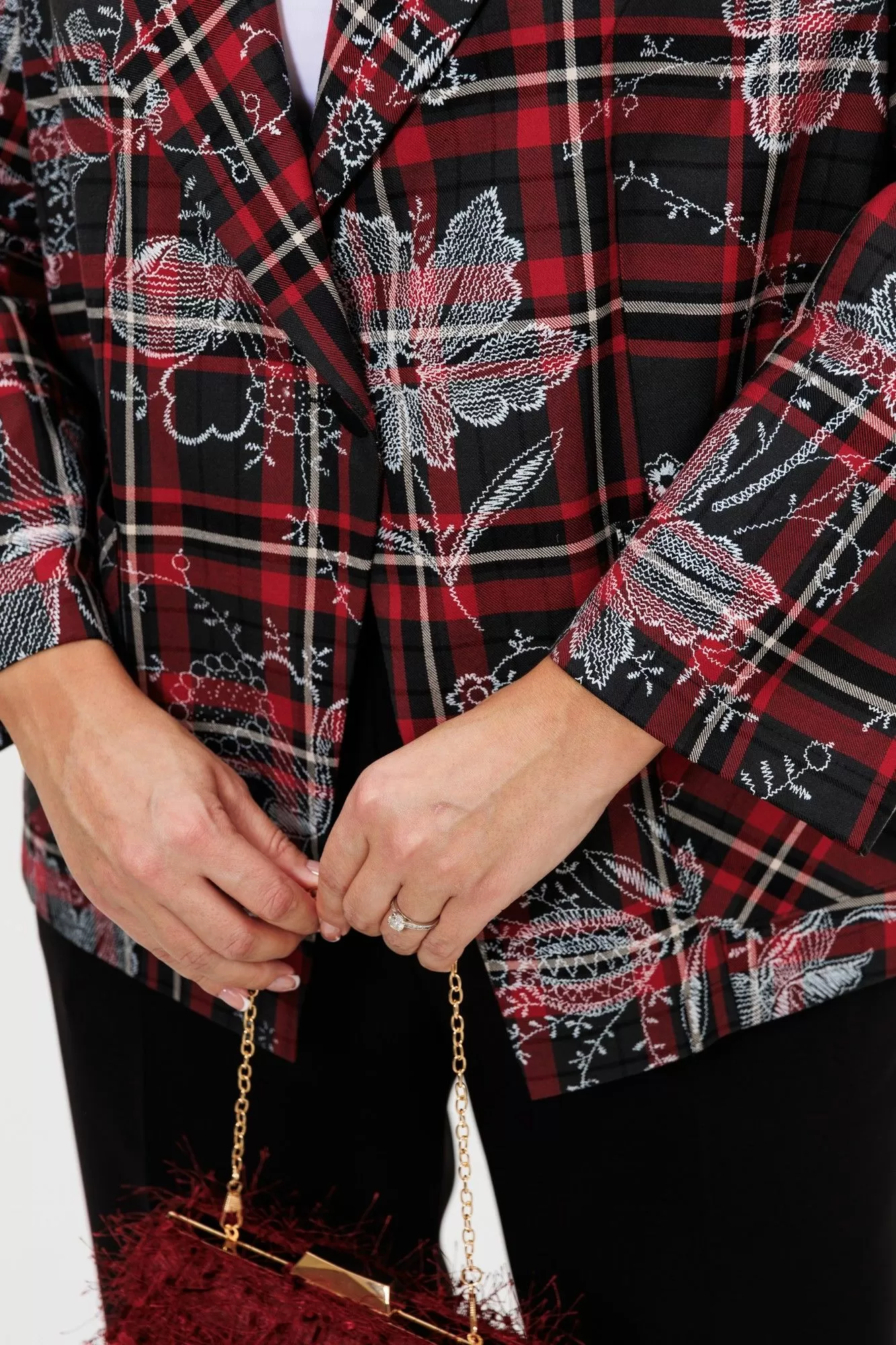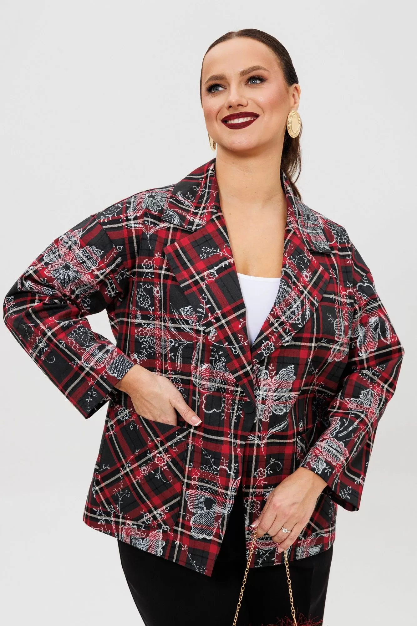 Жакет прямого силуэта со спущенной линией плеча, выполнен из костюмной ткани в клетку с принтом имитация вышивки (не тянется). По переду нагрудная вытачка, накладные карманы, центральная застежка на одну петлю-пуговицу. Горловина оформлена воротником пиджачного типа с лацканом. Спинка со средним швом. Рукава одношовные, длиной 7/8. Жакет без подкладки.