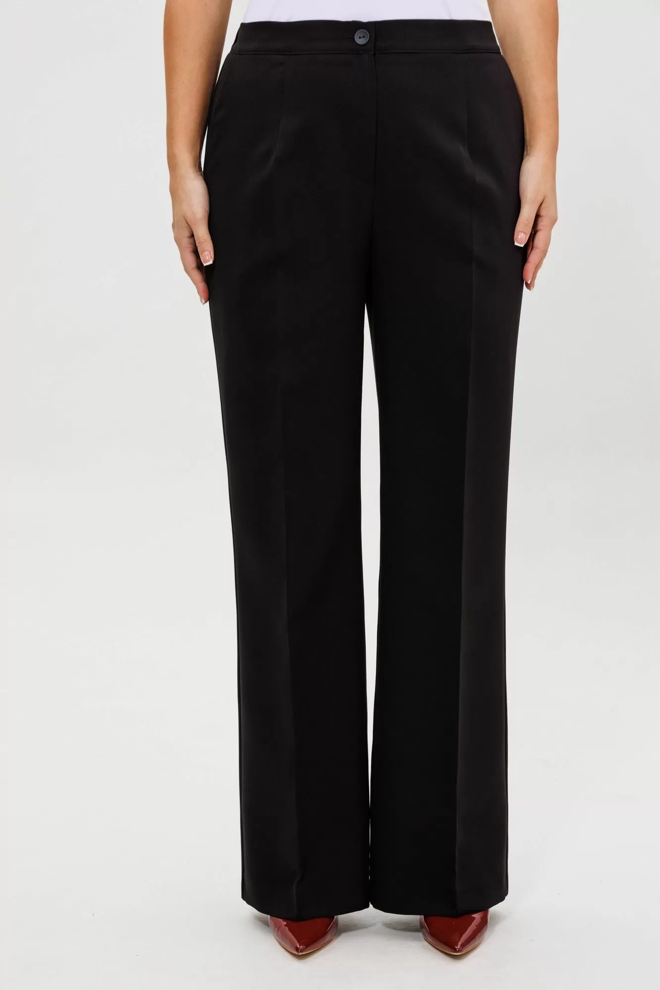 Брюки прямого кроя с высокой посадкой, выполненные из костюмной ткани (чуть тянется) с наклонными карманами в боковых швах. По срезу банта застежка-молния. Верхний срез оформлен поясом с эластичной резинкой по задней половинке.