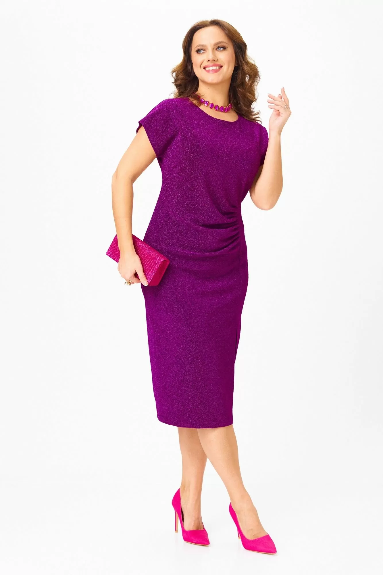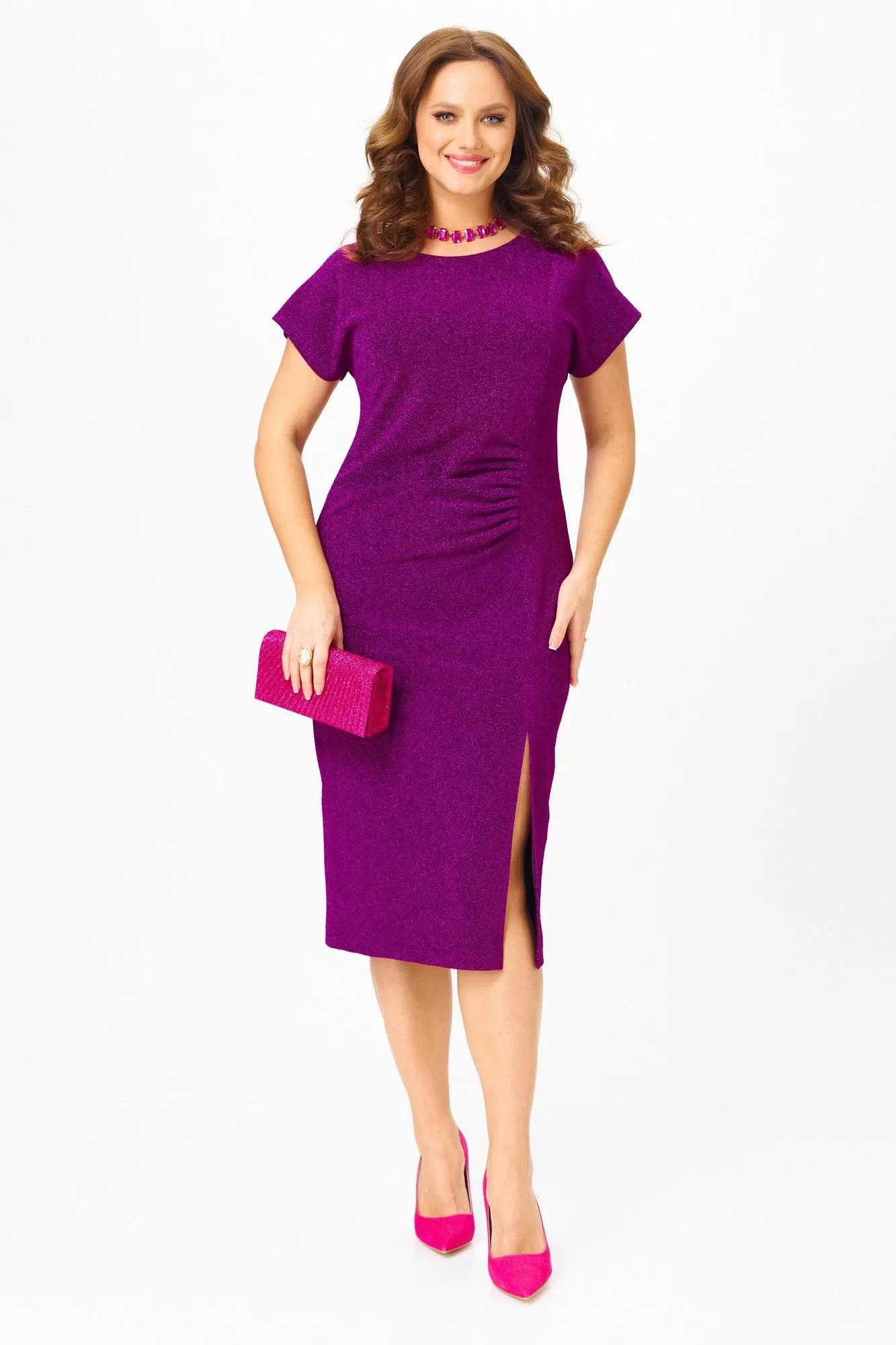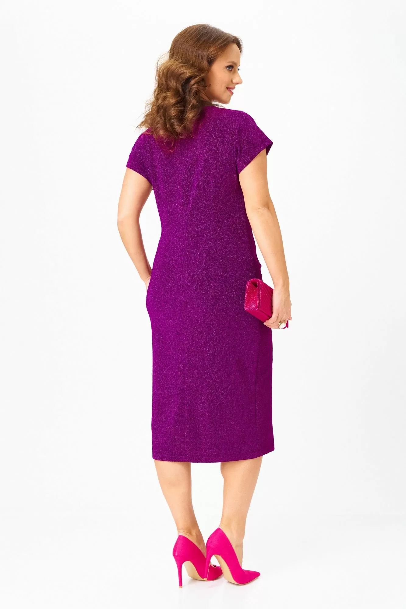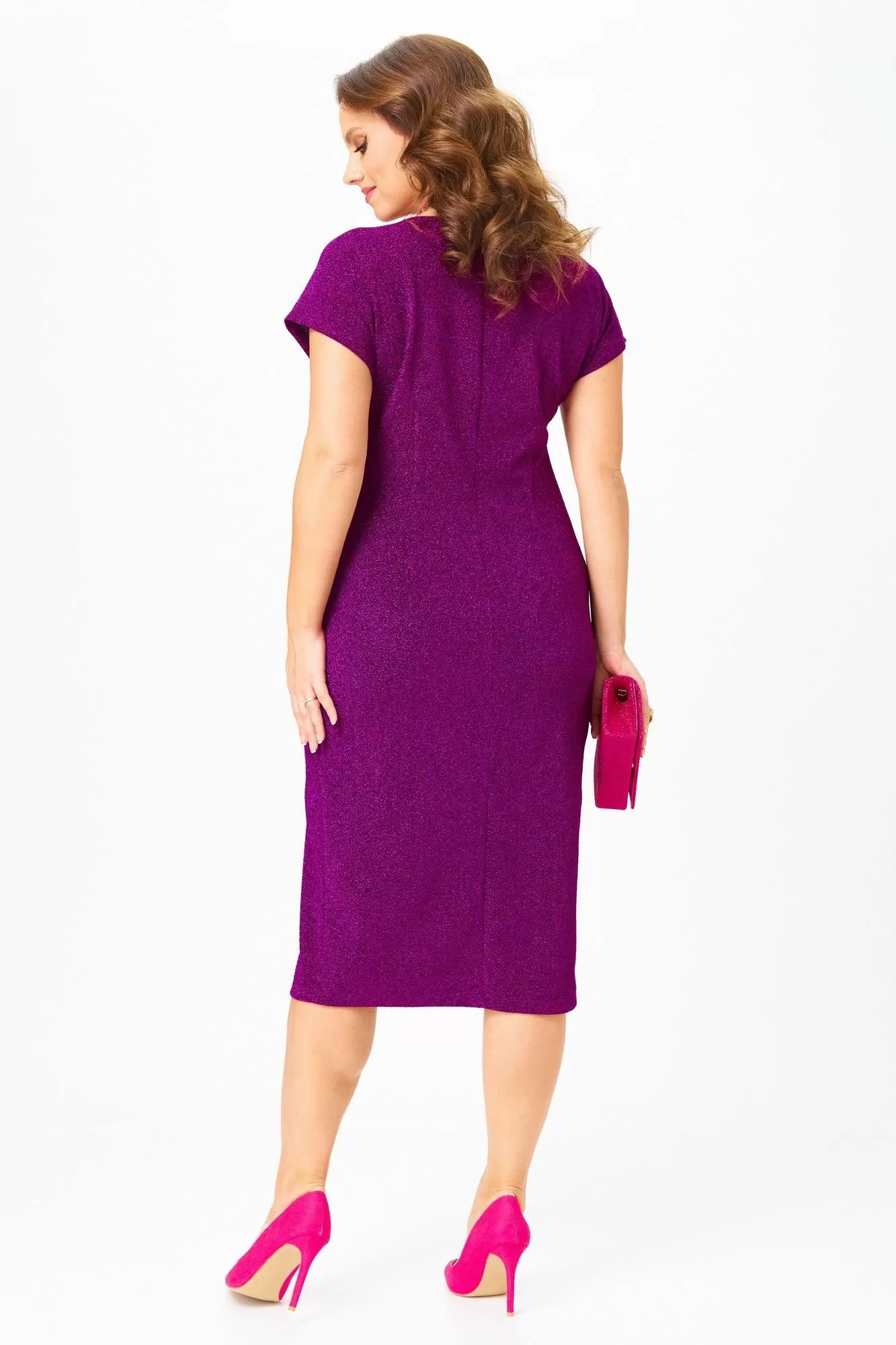 Нарядное женское платье полуприлегающего силуэта со спущенной линией плеча, выполненное из крепа на трикотажной основе с люрексом (легкое мерцание). Полотно эластичное. По левой части переда рельефный шов, переходящий в разрез. По правой части переда в области талии – мягкие складки от рельефного шва. По спинке средний шов. Горловина округлой формы, обработана окантовкой. Платье без подкладки и без застежки.
