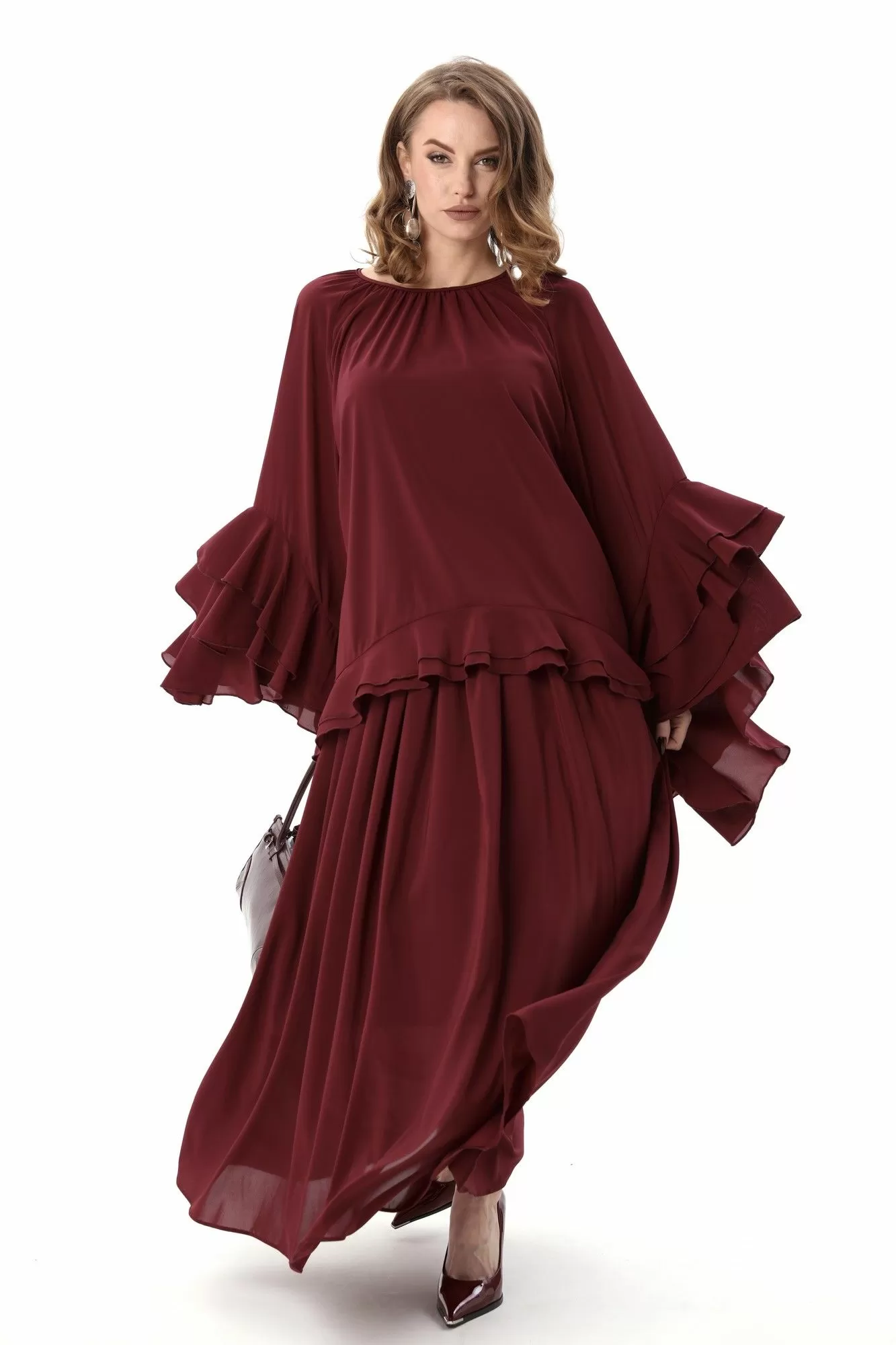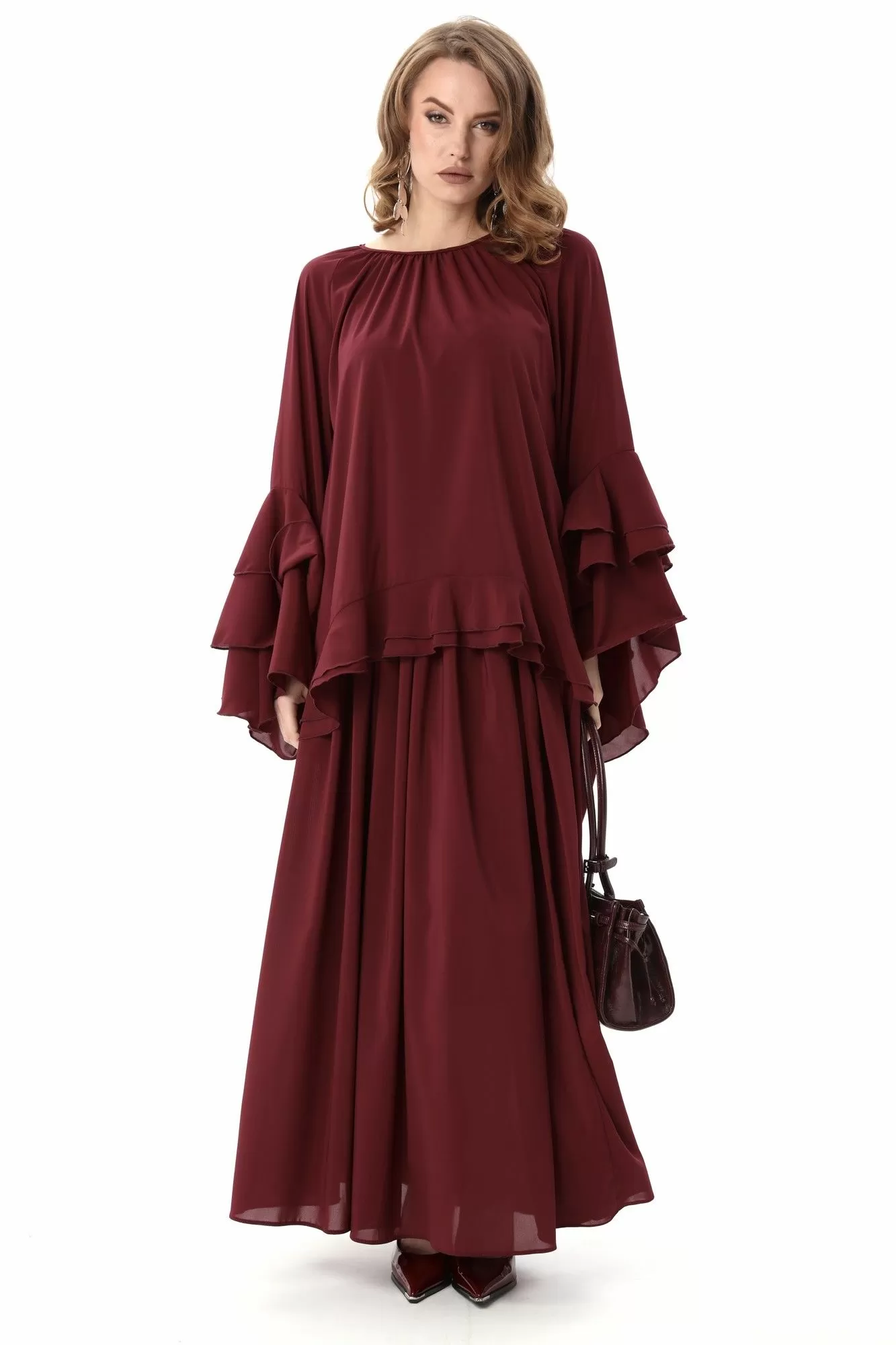 Блуза свободного силуэта с присборенной горловиной, обработанной бейкой. Спинка со средним швом, переходящим в разрез. Рукава реглан с асимметричными воланами. Нижний край блузы с двойным воланом.