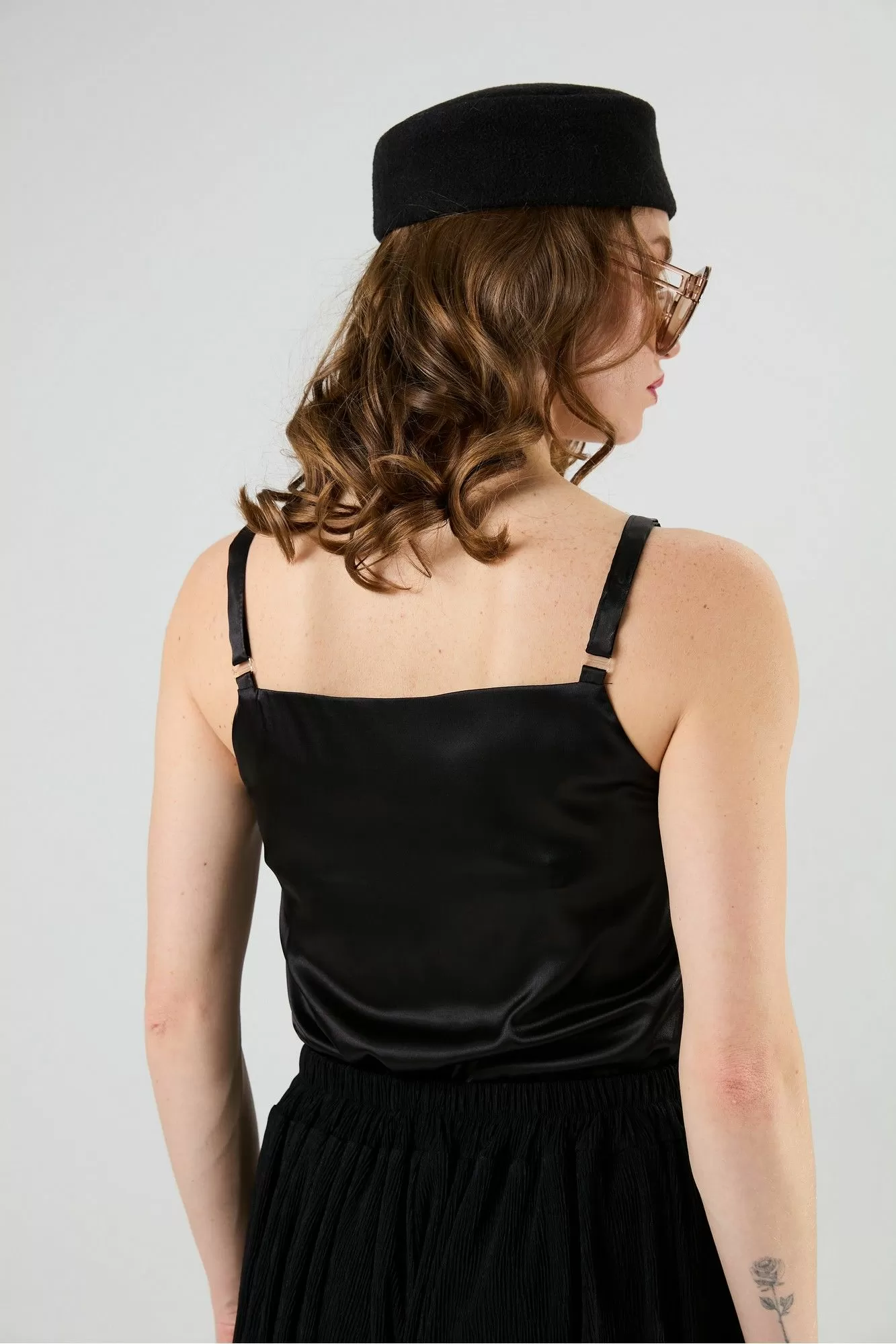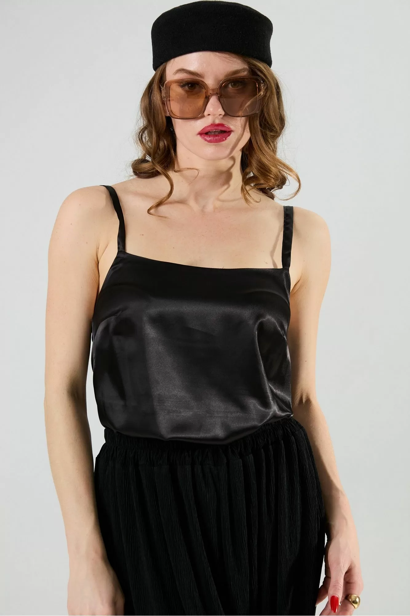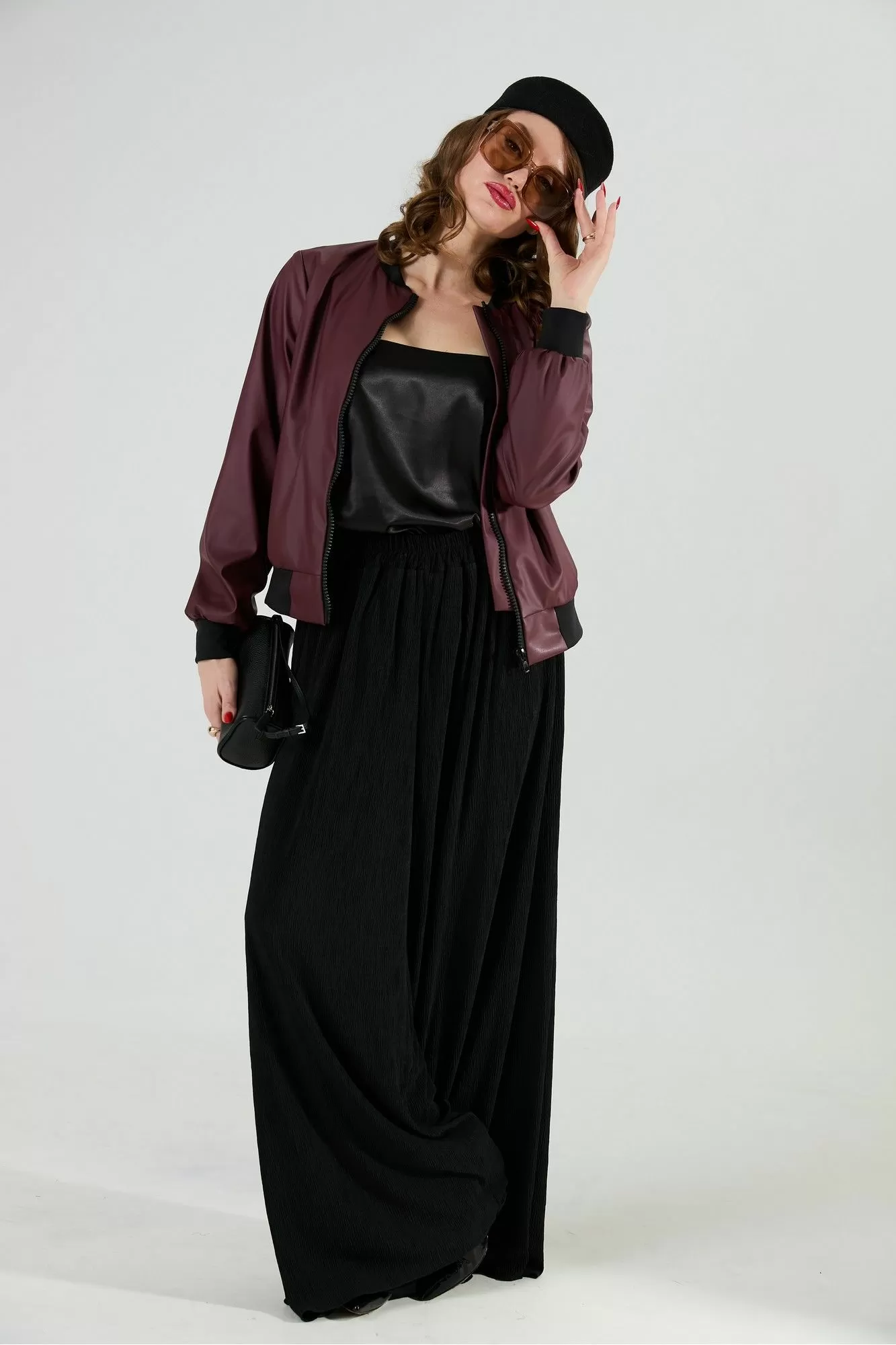 Топ на тонких регулируемых бретелях. Брюки-юбка свободного кроя из трикотажного гофре, верхний срез представлен широкой резинкой.