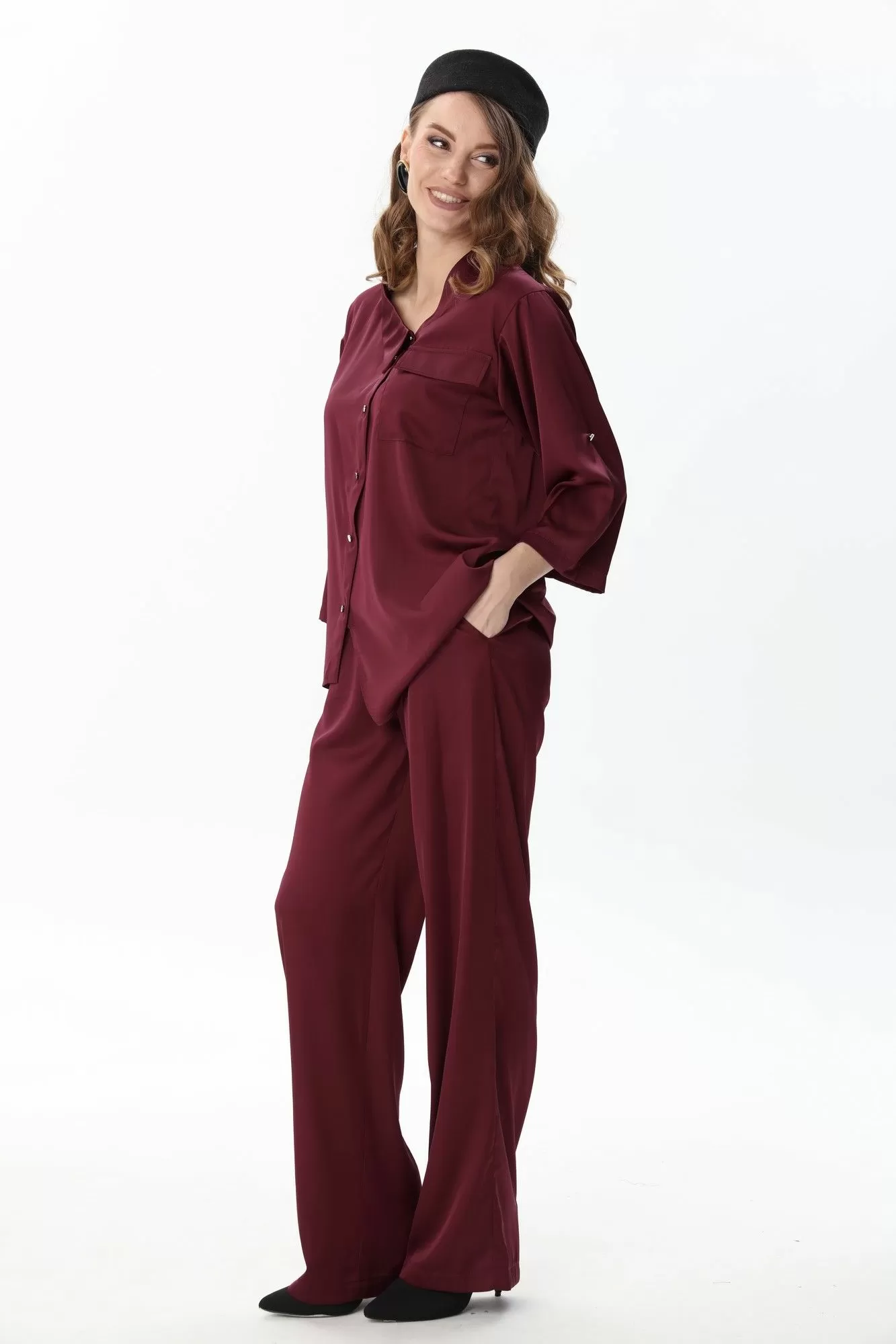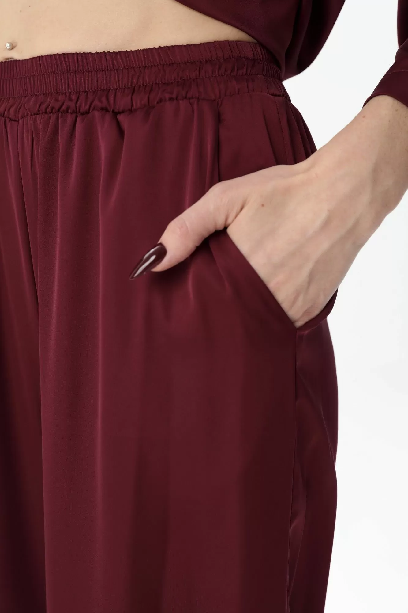 Брюки свободного кроя из гладкой ткани сочетают элегантность и комфорт. Широкая резинка на поясе и наличие функциональных карманов подчеркивают удобство модели.