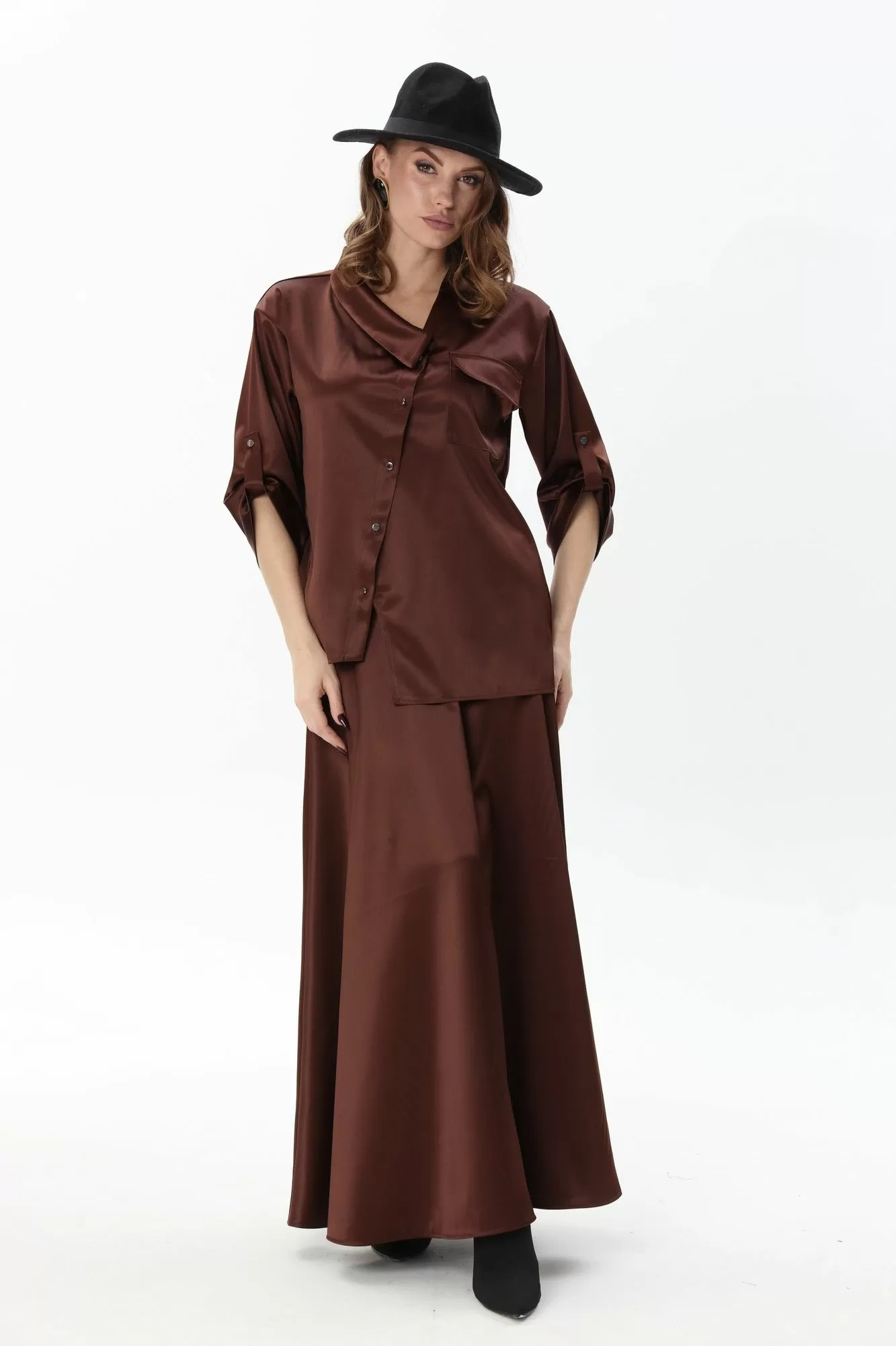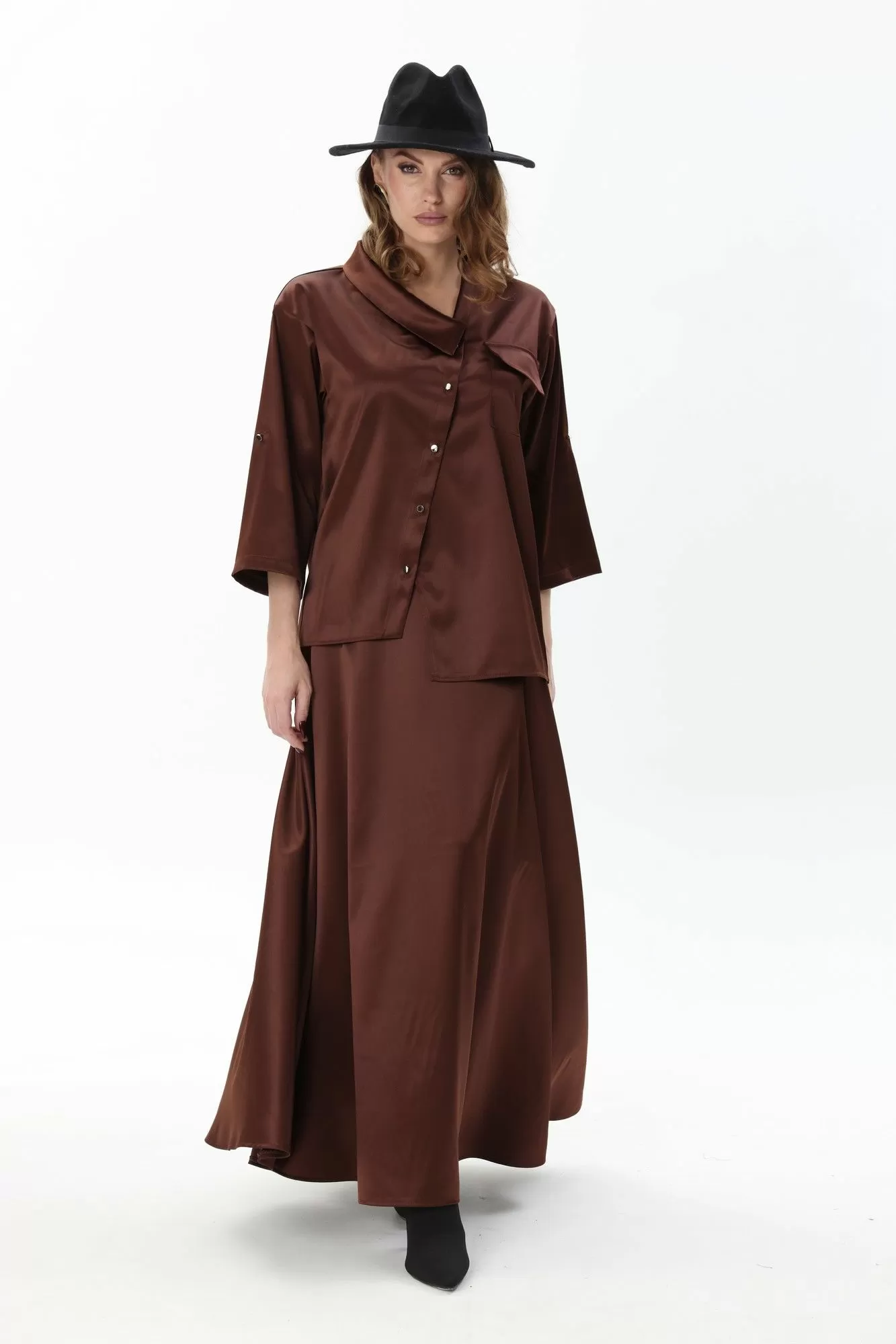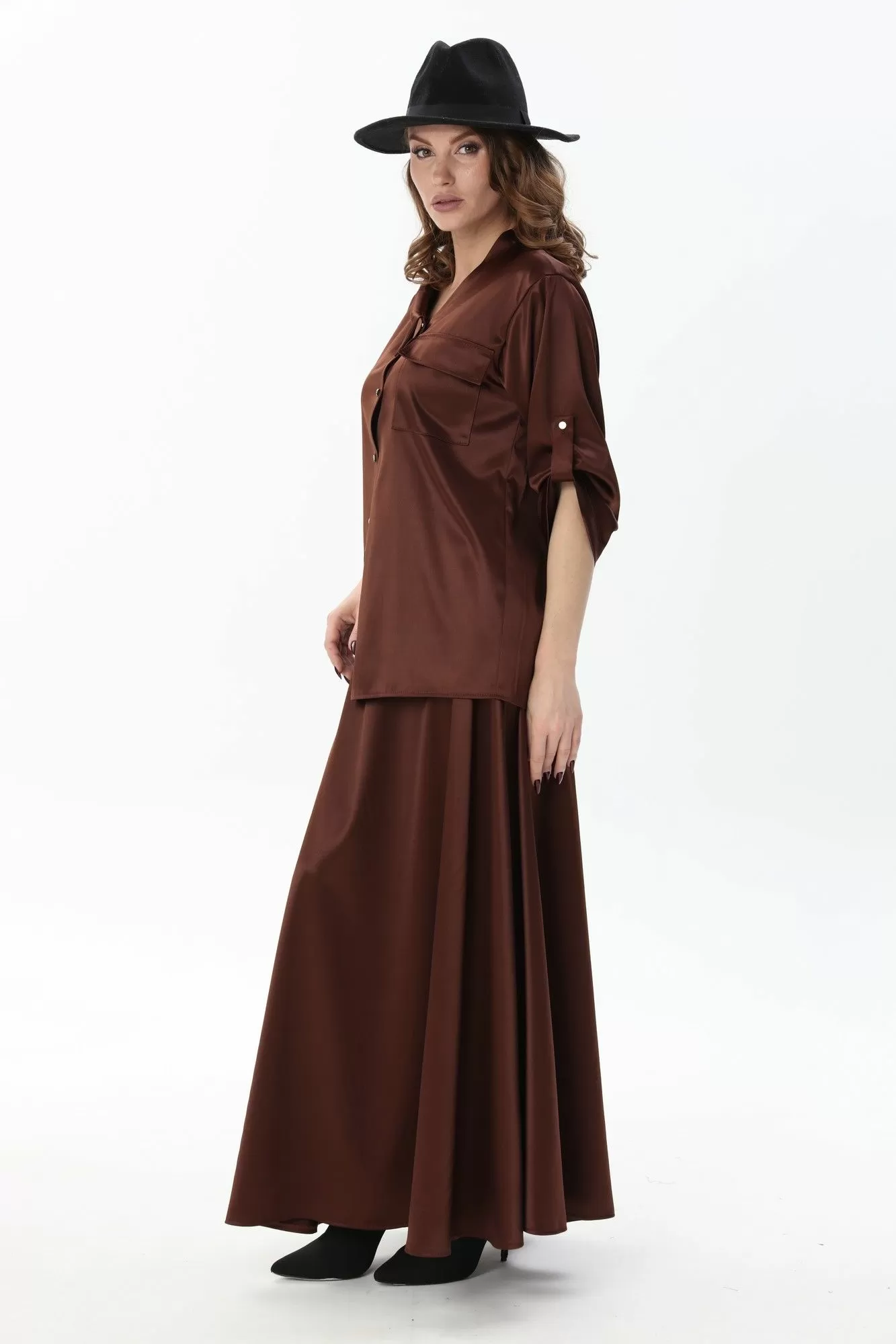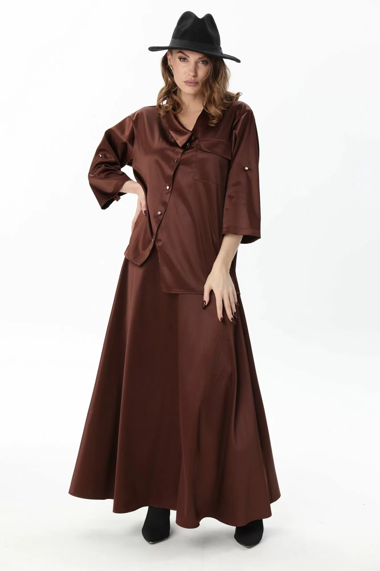 Юбка - солнце макси с узким поясом. В боковых швах расположены карманы. Застёжка на петлю и пуговицу и молнию по спинке.