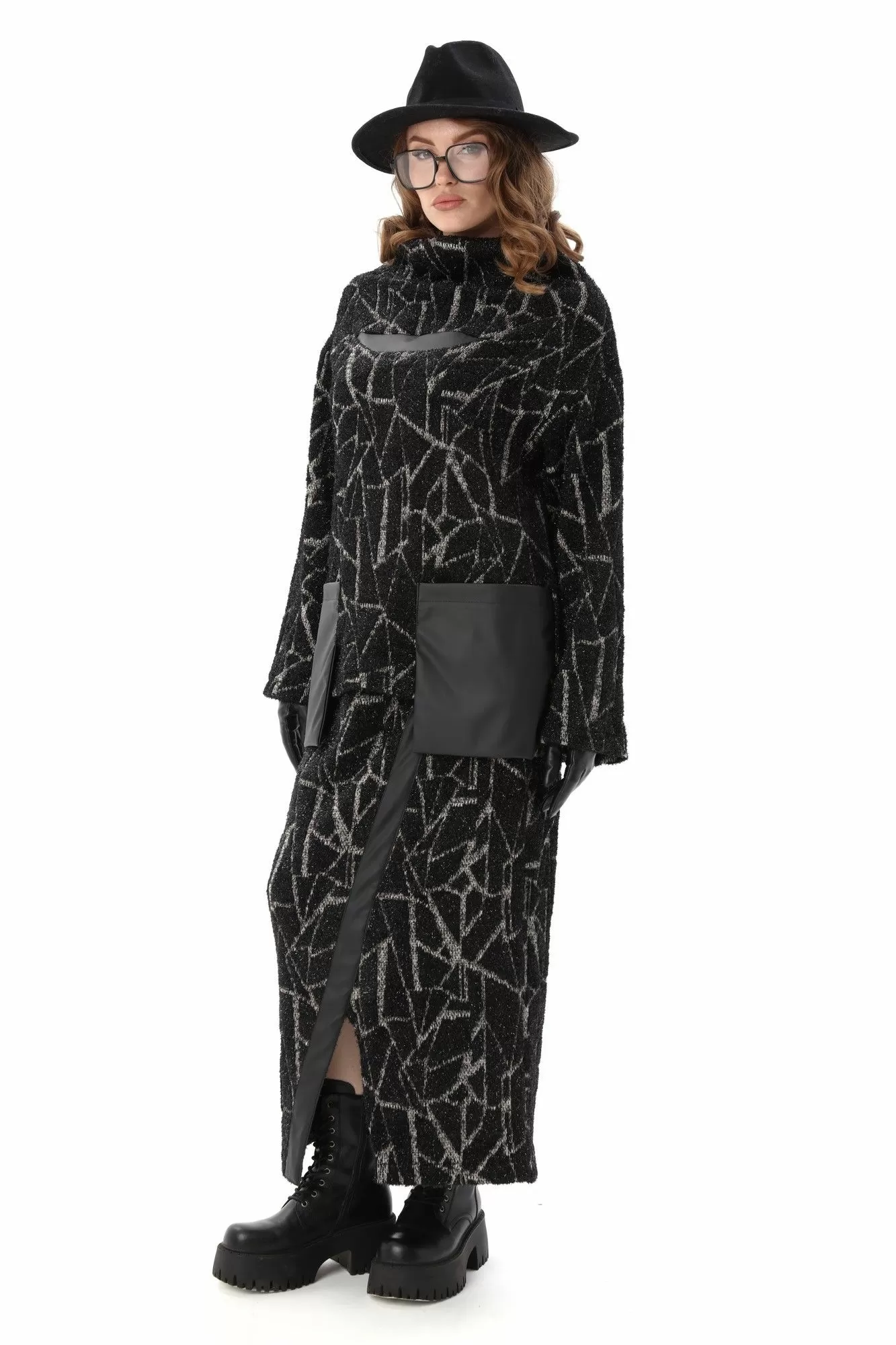 Костюм комбинированный двухпредметный: состоит из джемпера и юбки. Джемпер прямого свободного силуэта длиной до линии бедер, воротник хомут, рукав одношовный, втачной длиной до запястья. Спинка цельнокроеная. Перед состоит из двух частей- верхней и нижней. По нижней части переда сверху по центру вставка из отделочной ткани. По нижней части переда боковые накладные карманы из отделочной ткани, уходяшие в боковой шов, длинее линии низа переда вровень с линией низа спинки. Юбка на резинке прямого кроя симитацией запаха из отделочной ткани.