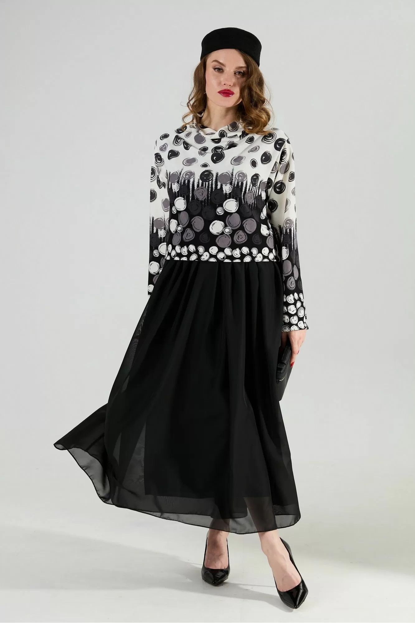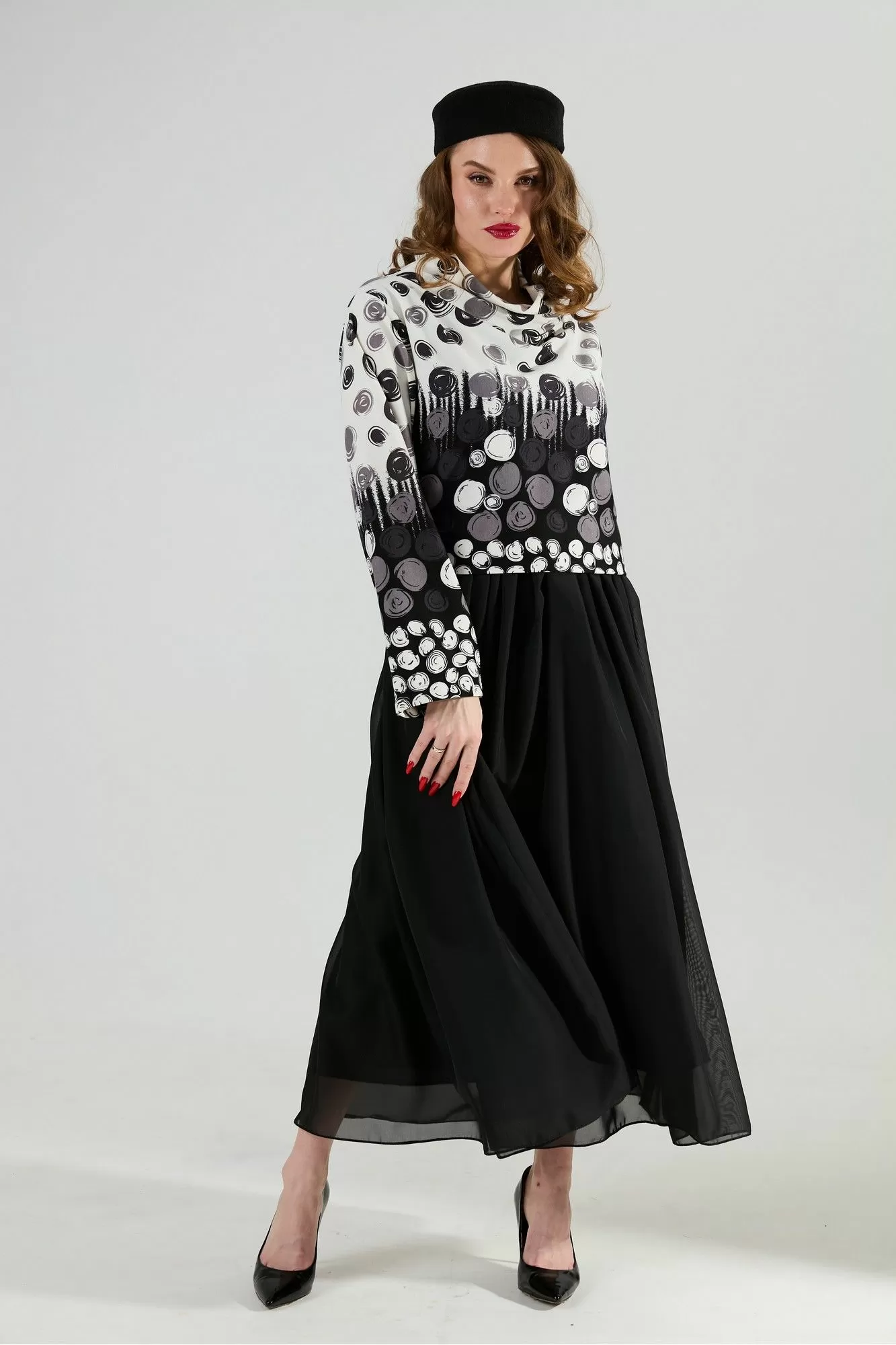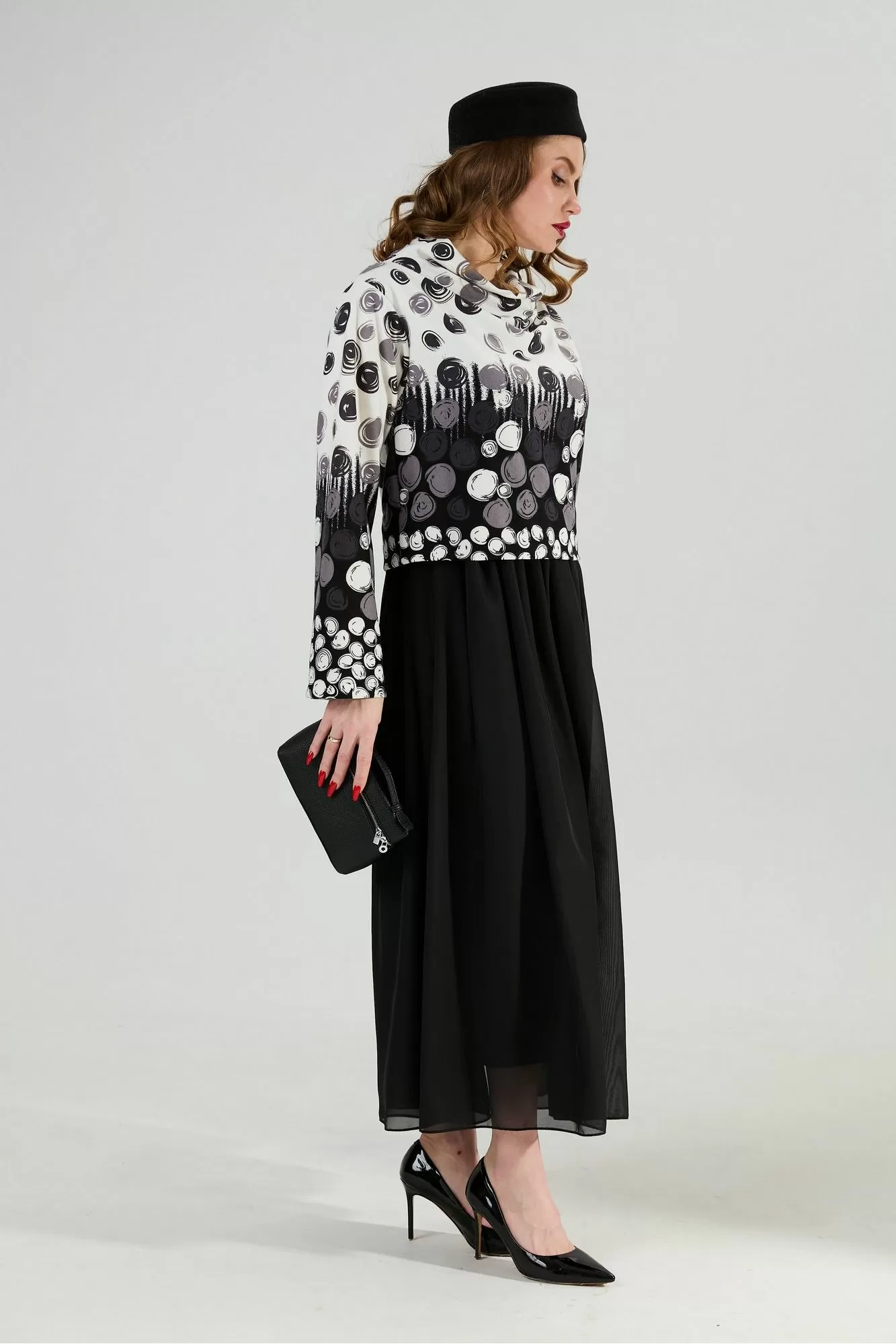Платье прямого силуэта, состоящее из комбинации двух тканей - основной и отделочной. Воротник цельнокроеный хомут. Рукав одношовный, втачной, длинный. Нижняя юбка из отделочной ткани, со сборкой по линии талии. Юбка на подкладке.