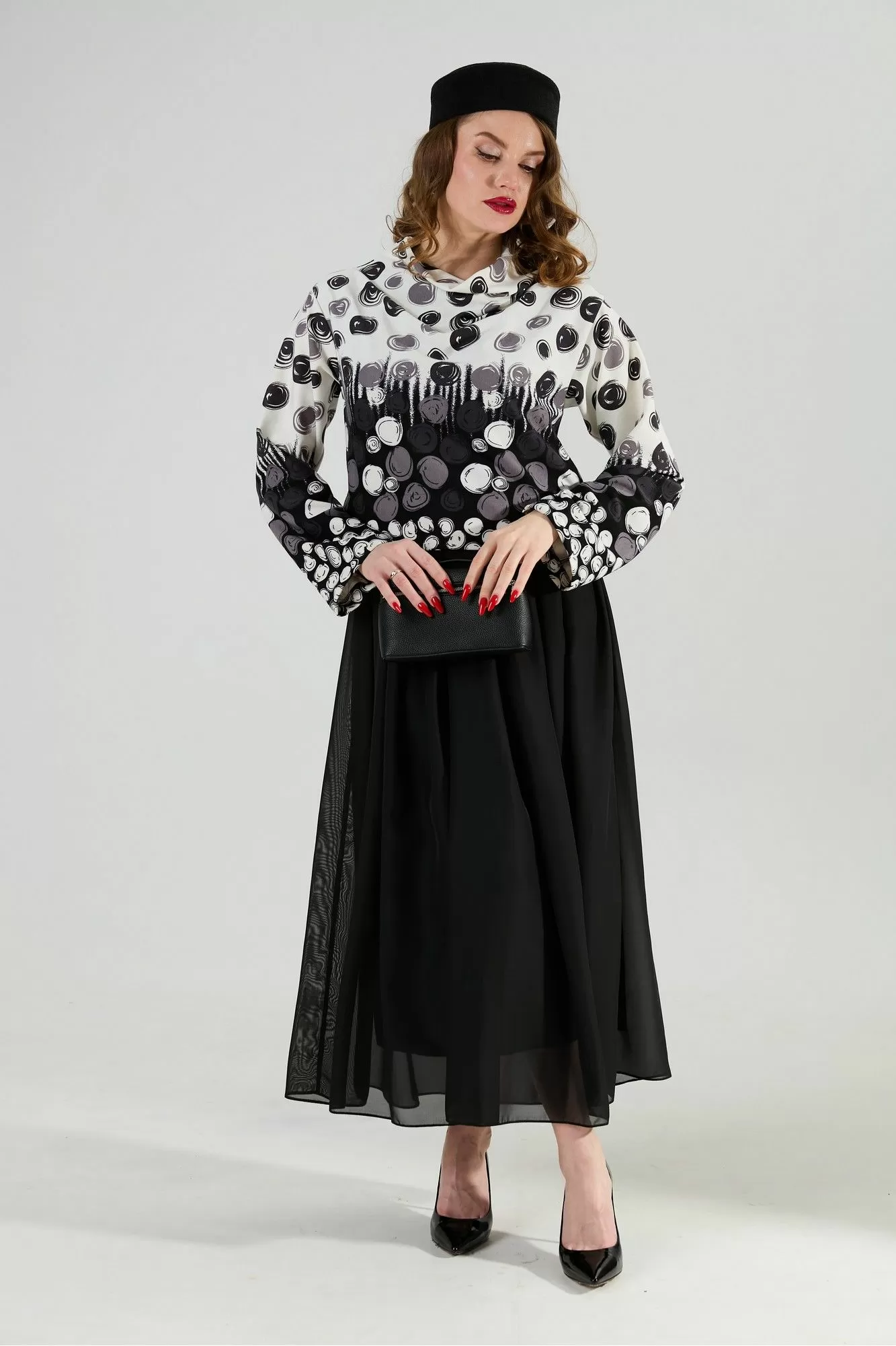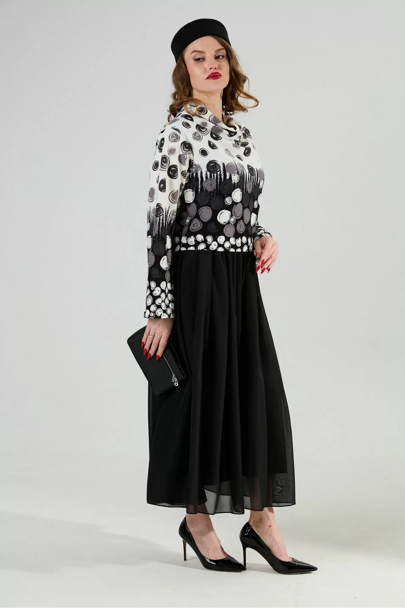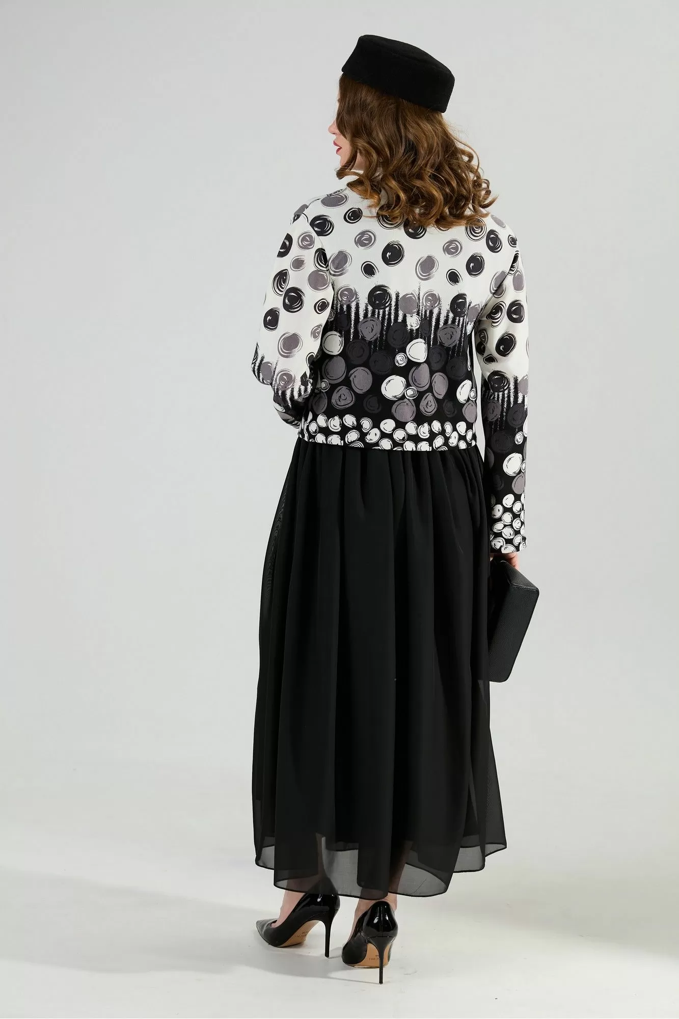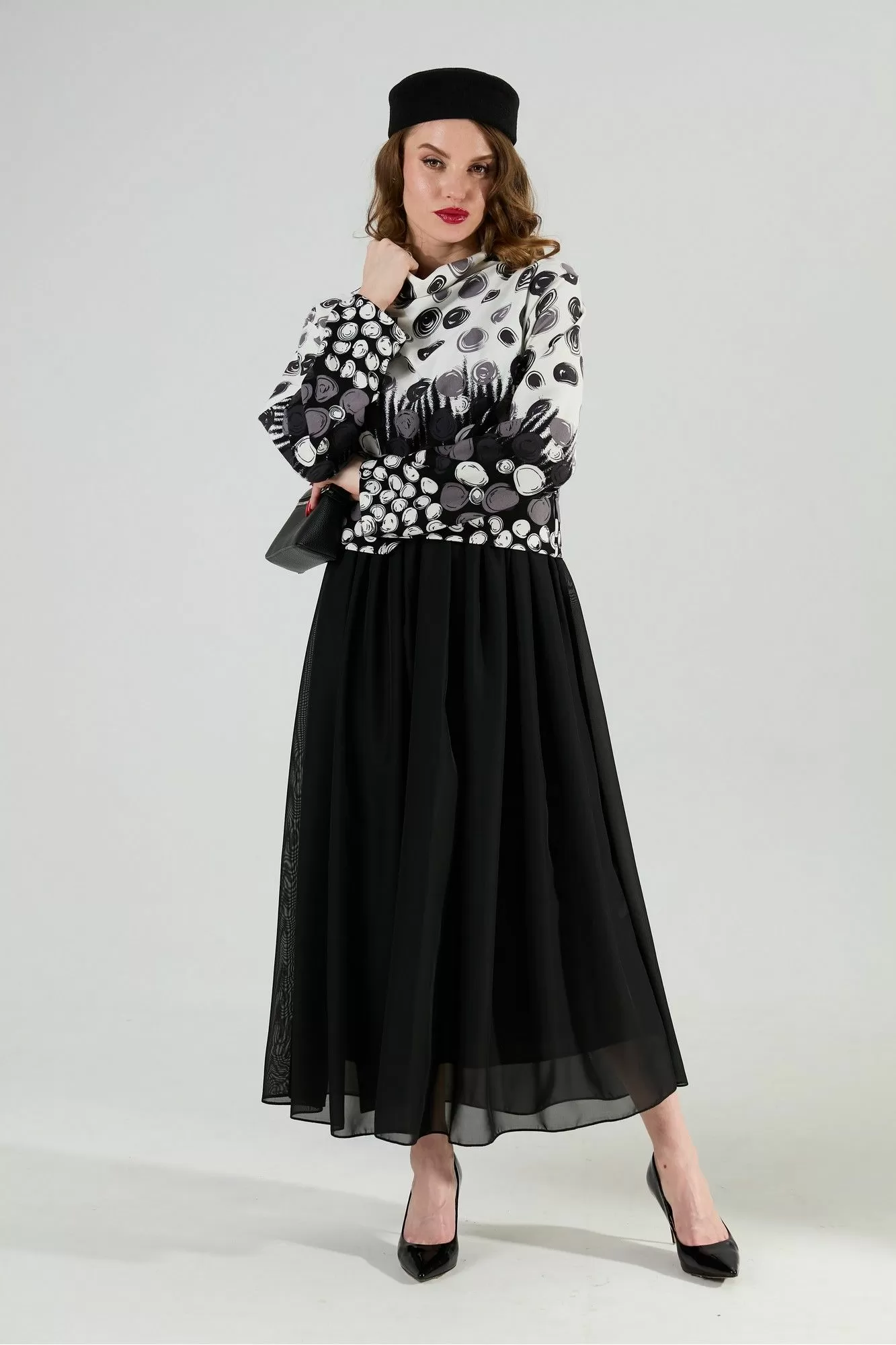 Платье прямого силуэта, состоящее из комбинации двух тканей - основной и отделочной. Воротник цельнокроеный хомут. Рукав одношовный, втачной, длинный. Нижняя юбка из отделочной ткани, со сборкой по линии талии. Юбка на подкладке.