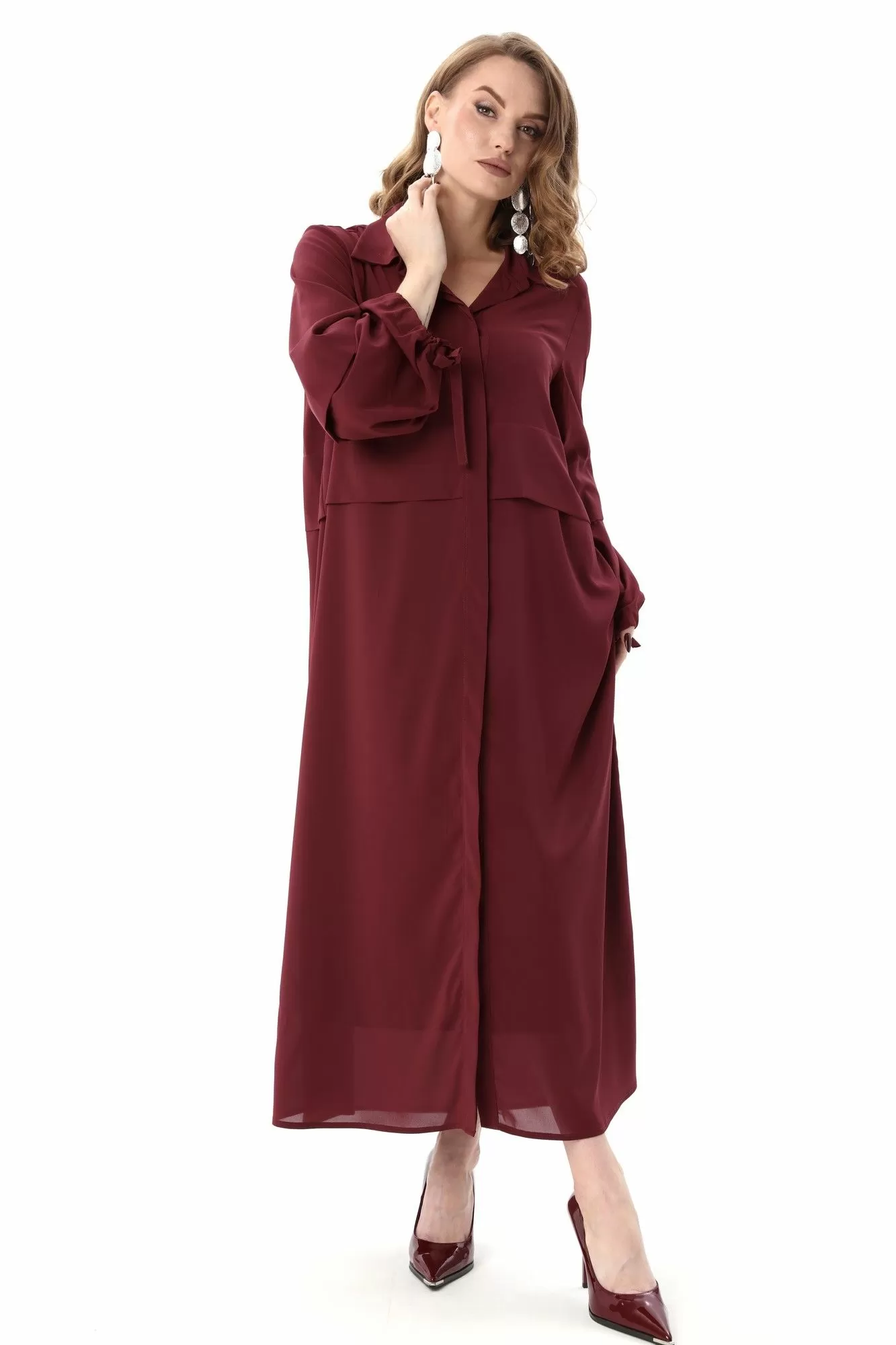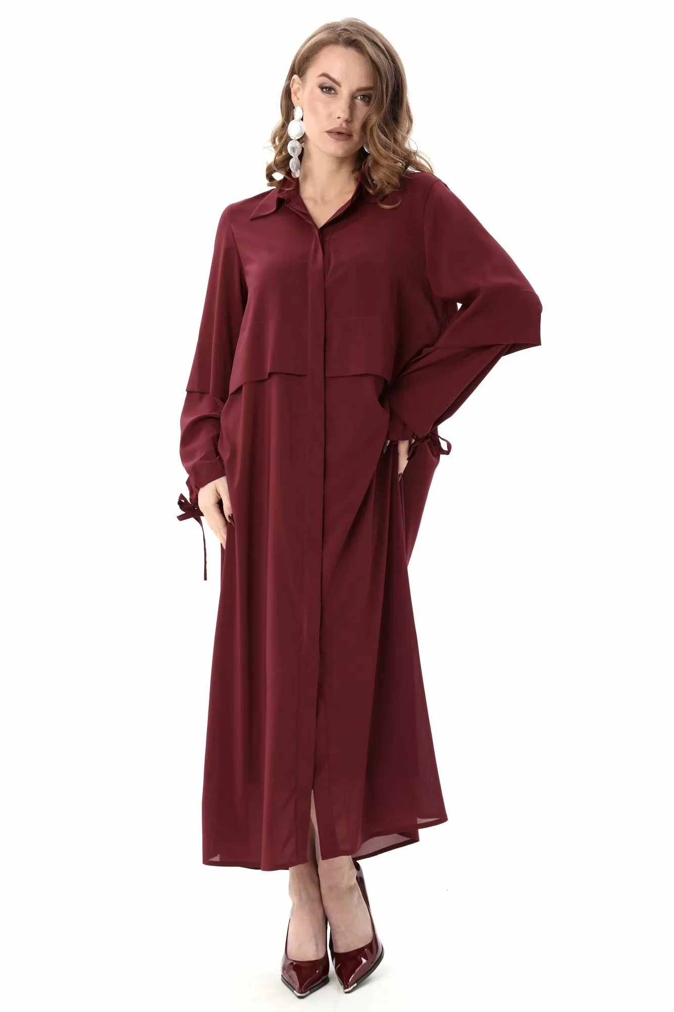 Платье макси с центральной отрезной застёжкой на потайную планку на петли и пуговицы.По переду и спинке цельнокроеные складки на уровне талии. Рукав втачной,одношовный рубашечноно типа. По низу рукава пробиты петли и вставлена завязка для фиксации сборки . Воротник рубашечный стояче отложной.