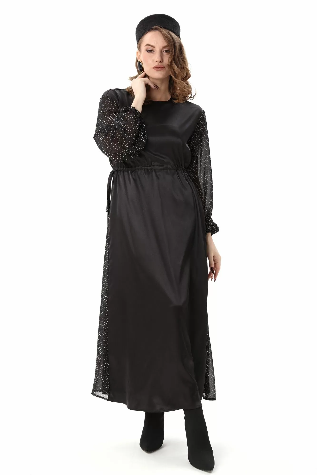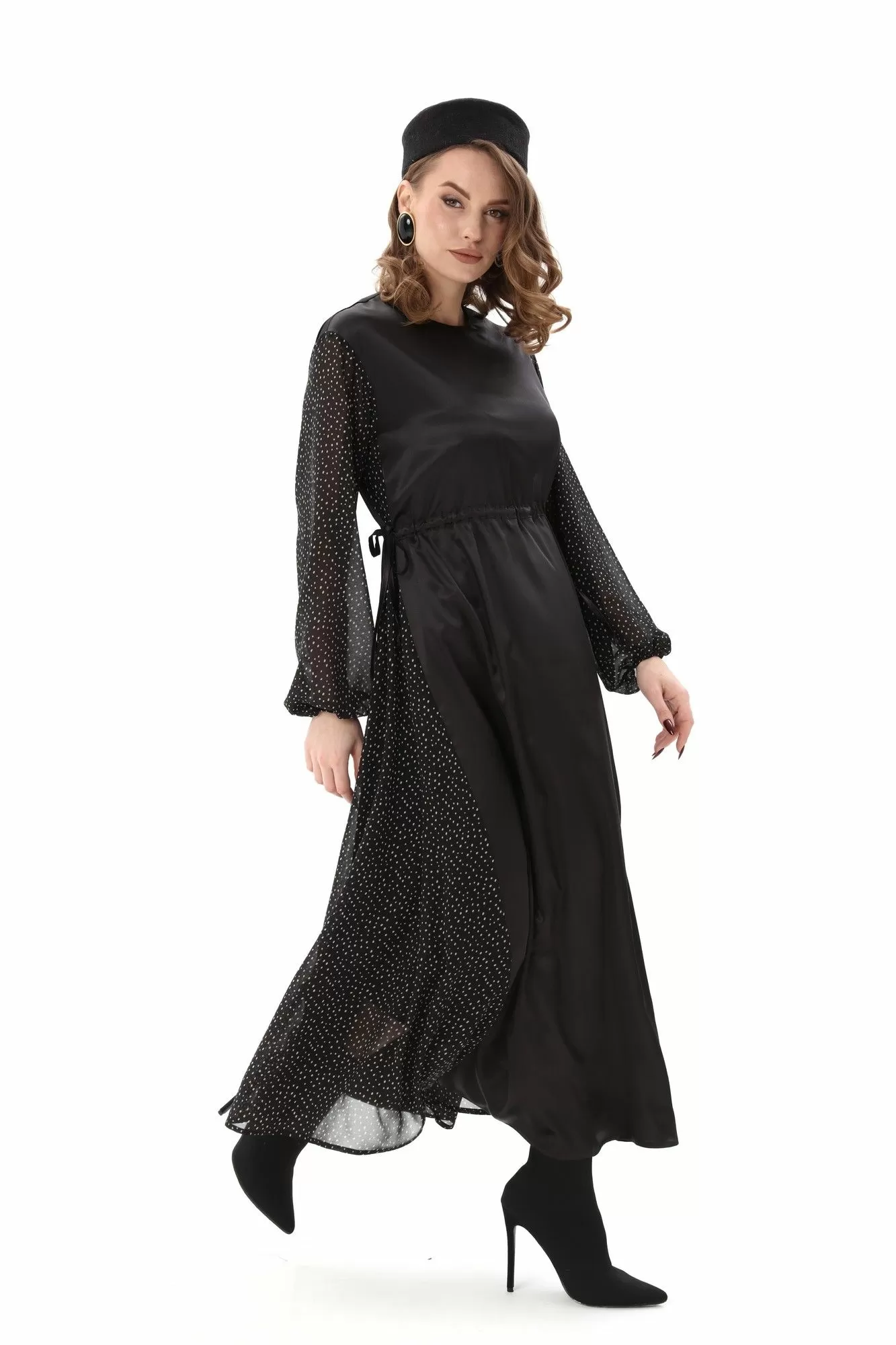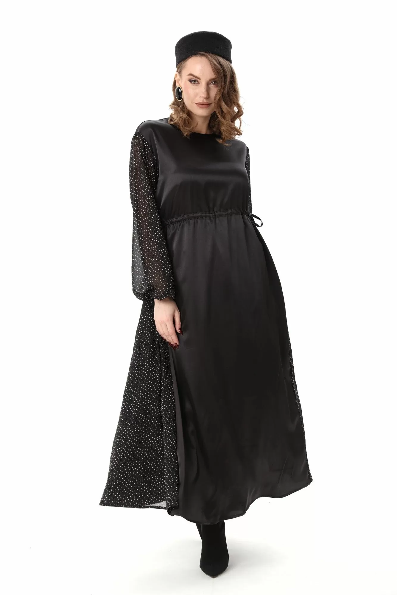 Платье длиной макси комбинированное, свободного кроя, расклешенное к низу. Перед состоит из центральной и боковой части. Спинка с притачной кокеткой, центральной и боковыми частями. На переде и спинке по линии талии настрочена кулиска, с регулировкой прилегания с помощью шнура. Рукав втачной длинный. Горловина изделия круглой формы.