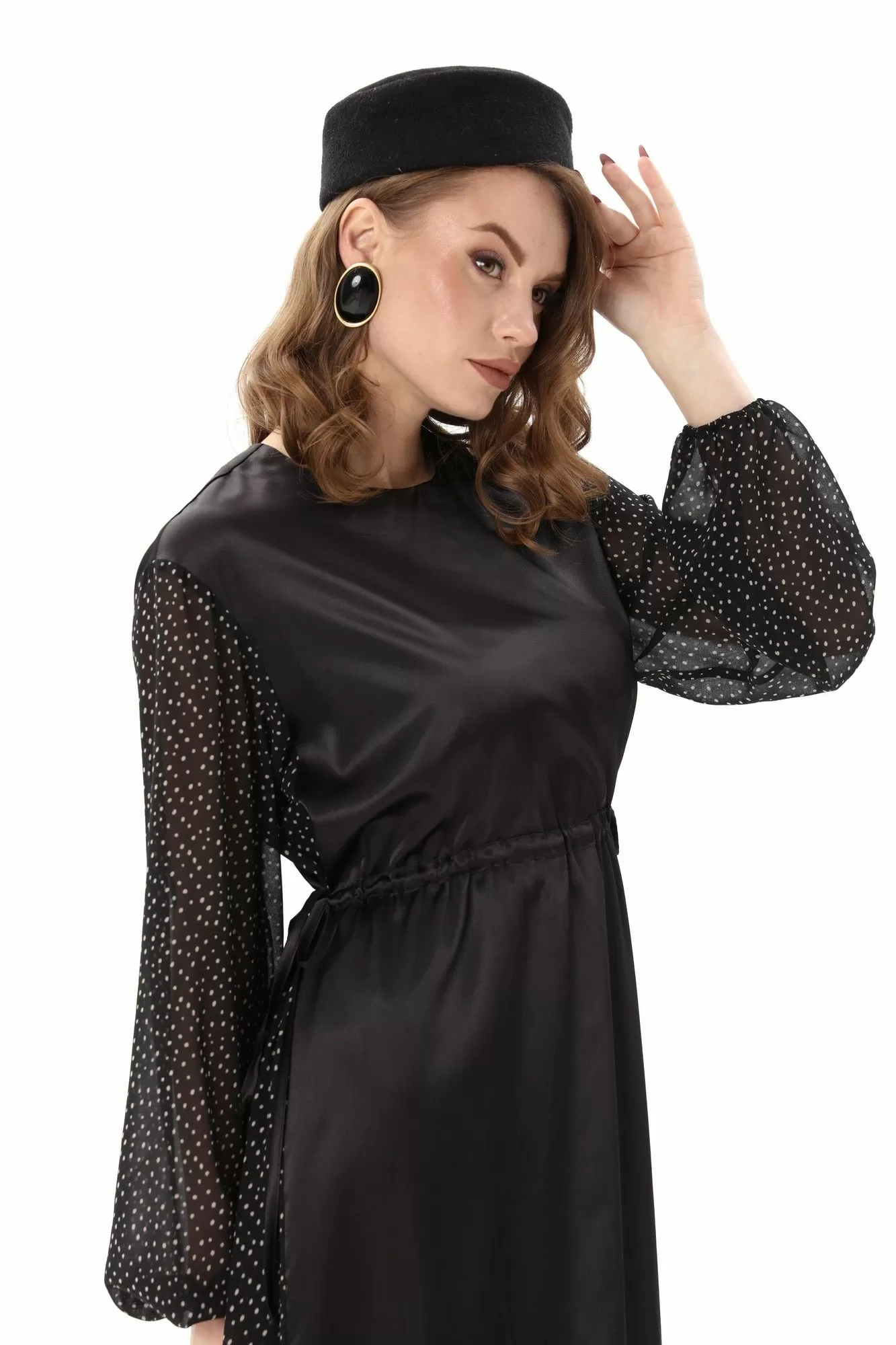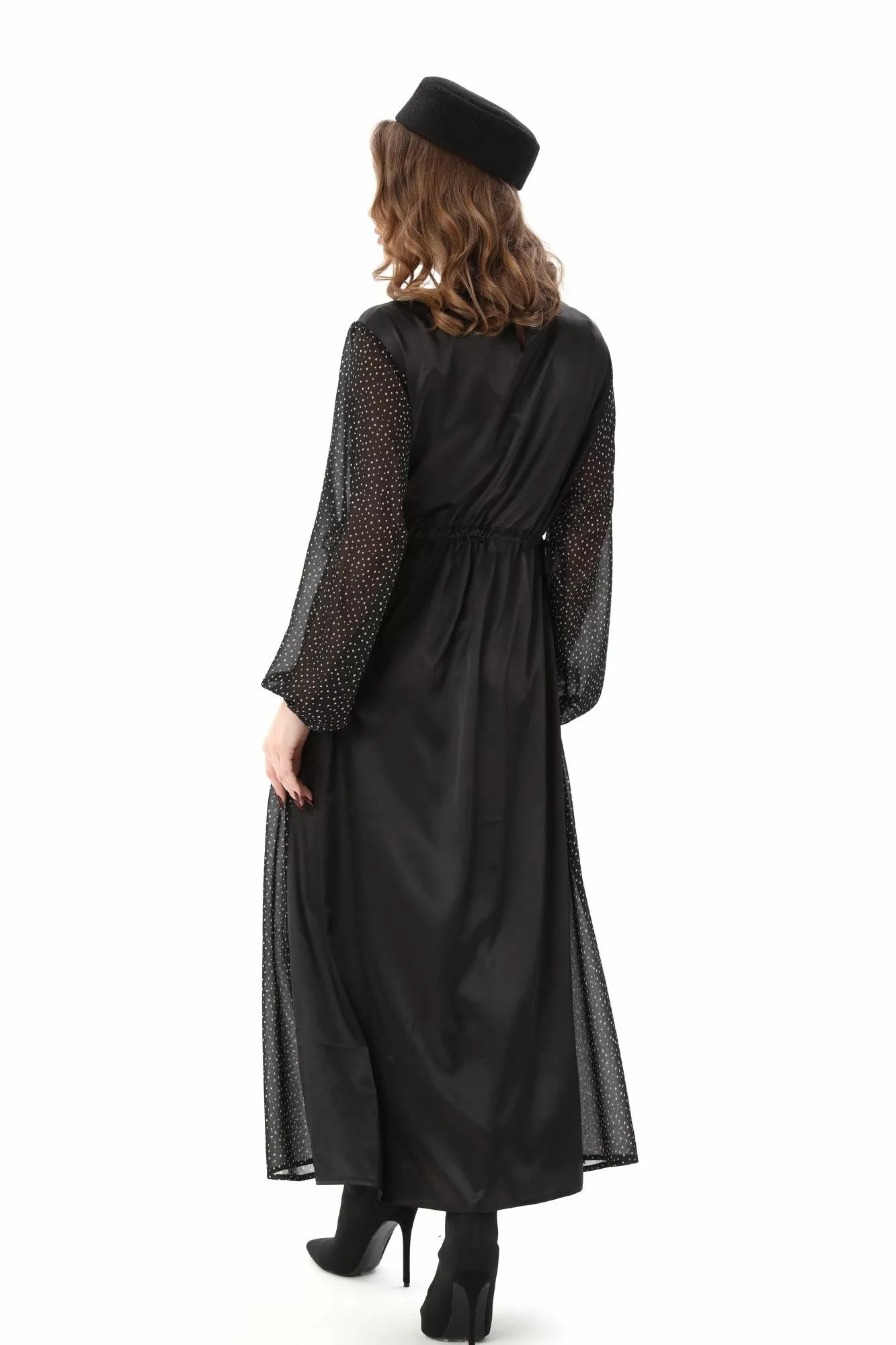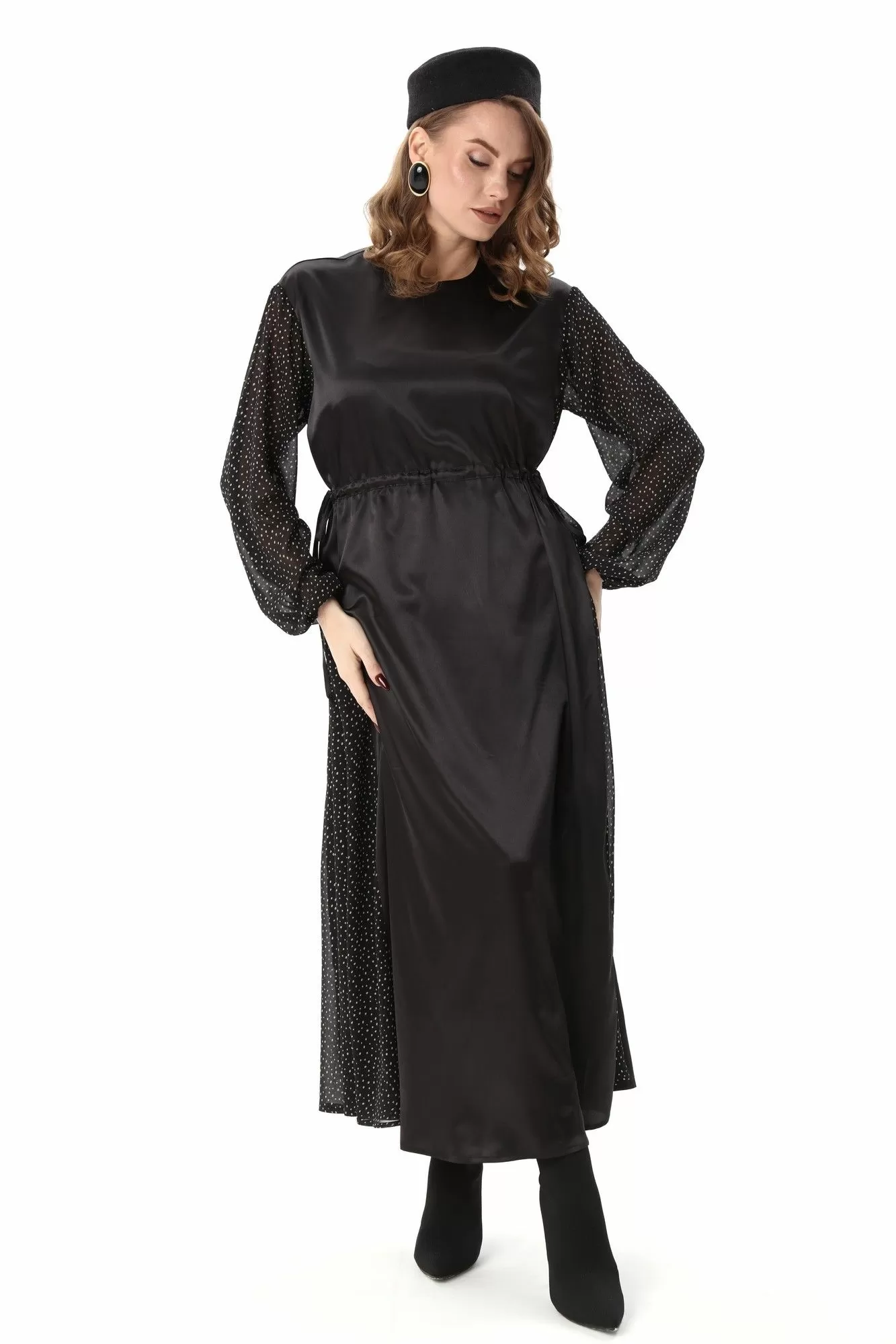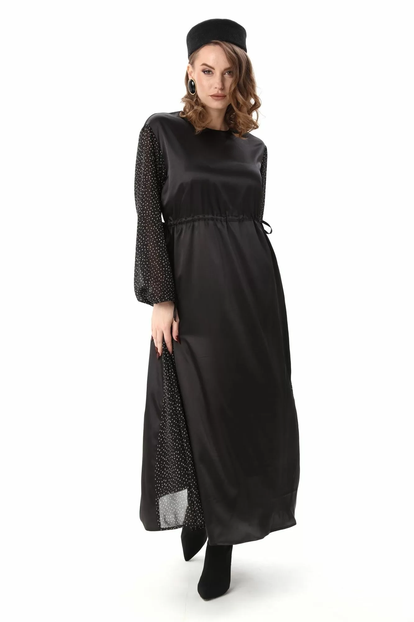 Платье длиной макси комбинированное, свободного кроя, расклешенное к низу. Перед состоит из центральной и боковой части. Спинка с притачной кокеткой, центральной и боковыми частями. На переде и спинке по линии талии настрочена кулиска, с регулировкой прилегания с помощью шнура. Рукав втачной длинный. Горловина изделия круглой формы.