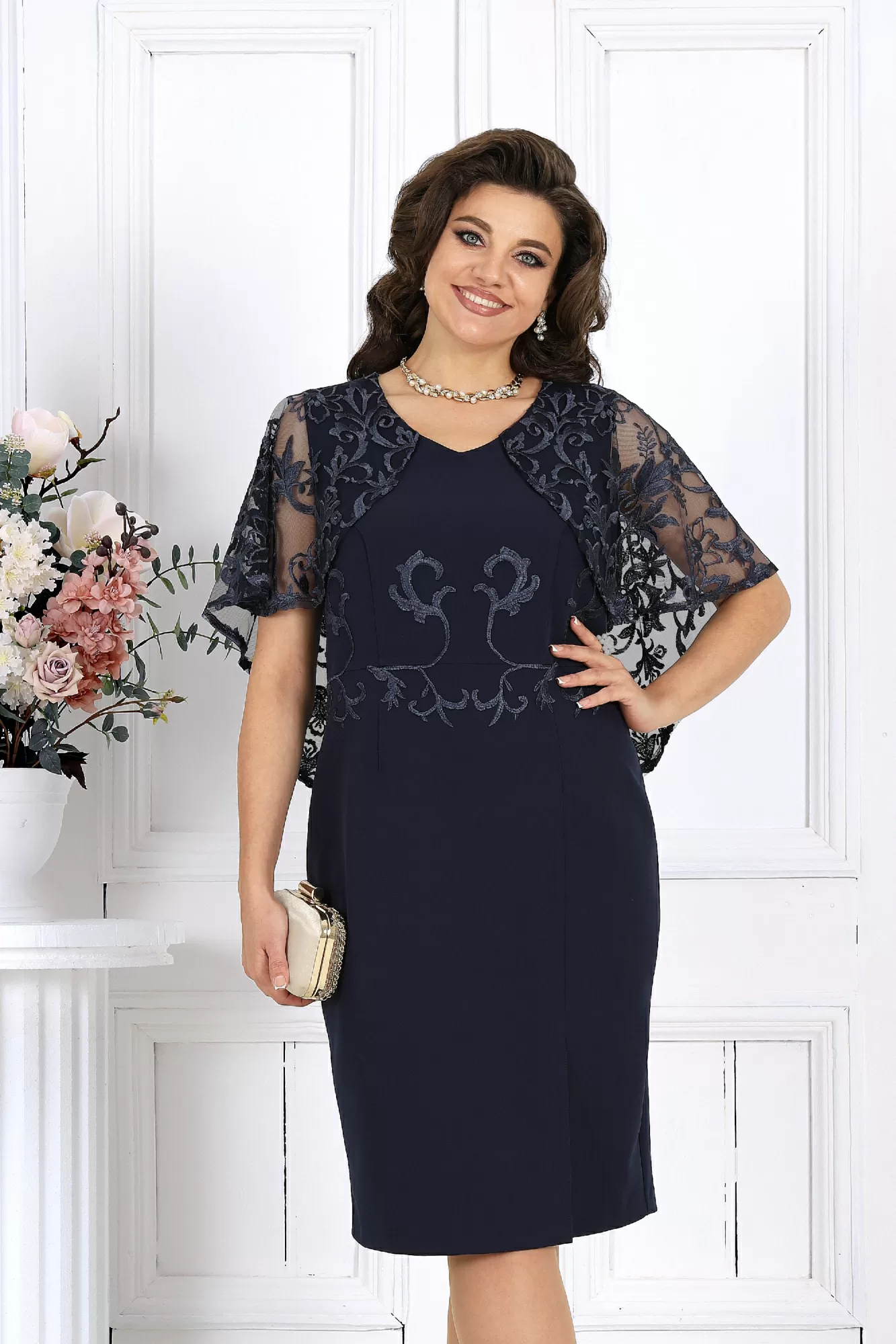 Платье женское, полуприлегающего силуэта, выполнено из костюмно-плательной ткани и гипюра. Модель на трикотажной подкладке, без рукавов и плечевых накладок. Перед отрезной по линии талии; на верхней части обработаны рельефы, направленные от пройм, на нижней – талиевая вытачка и рельефный шов с разрезом внизу. Лиф переда декорирован настрочной аппликацией. Спинка с талиевыми вытачками и средним швом, в верхней части которого обработана застежка на потайную тесьму-«молнию» (50см). Вырез горловины спинки округлый, по переду – углубленный, V-образный. В шов обтачивания горловины входит пелерина из гипюра, разъемная по середине переда и спинки; низ пелерины асимметричный, укороченный спереди. Длина платья – 104 см.