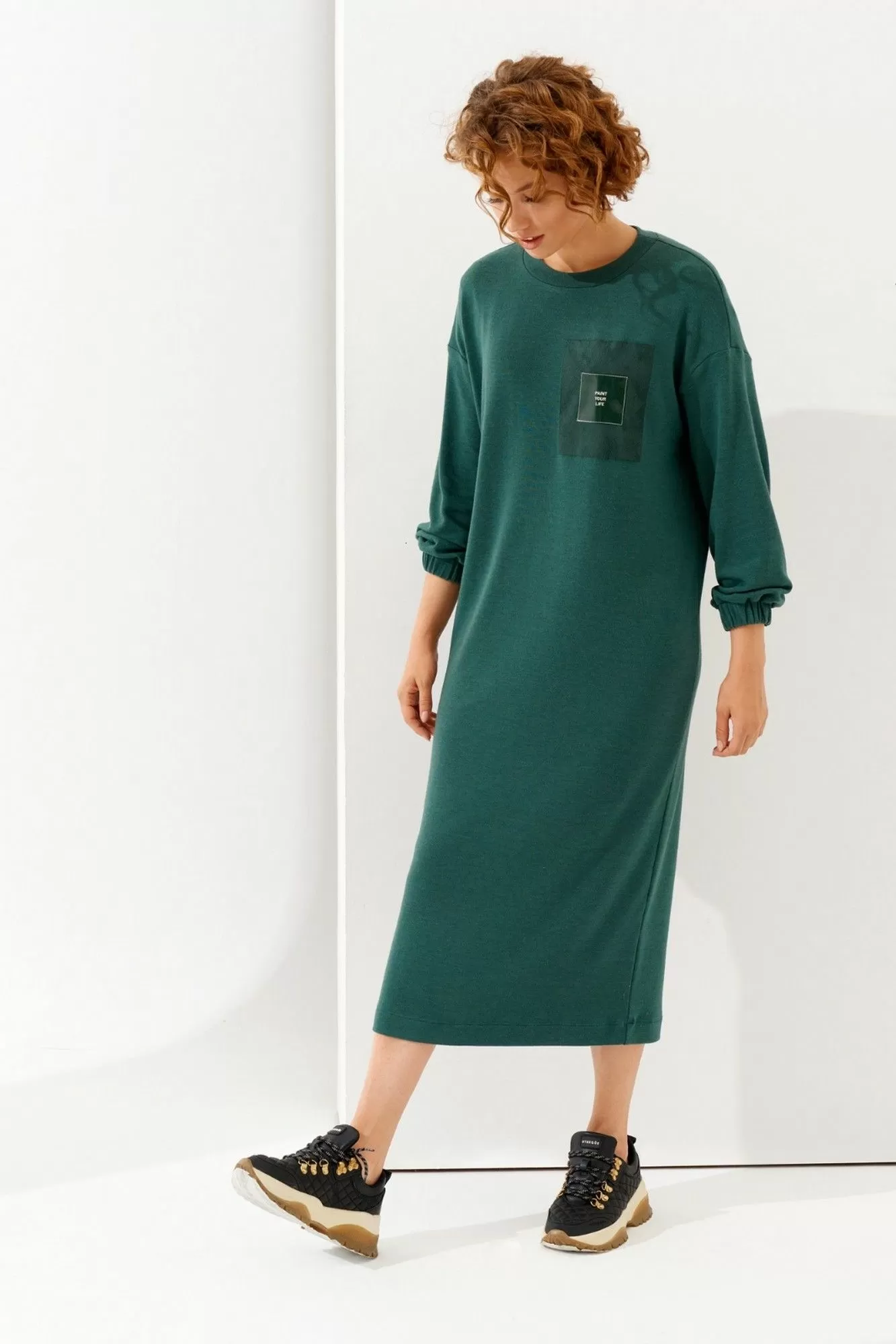 Трикотажное платье свободного кроя, зауженное к низу. В 40 размере ширина по линии груди 49 см., ширина по линии бёдер 48 см. Длина платья 101 см.