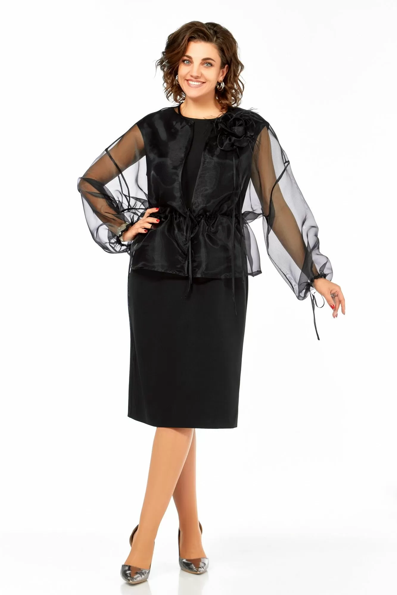 Женский вечерний комплект – это ваш идеальный нарядный образ для особых случаев. Этот стильный праздничный комплект, состоящий из накидки из органзы и изящного платья. Комплект станет ярким акцентом вашего гардероба и подарит уверенность в себе на любом торжественном мероприятии. Накидка свободного силуэта, со спущенным длинным рукавом. Горловина округлой формы, застежка на талии на завязку. По талии кулиска. Рукав по низу присобран тонкой кулиской. Его текстура и свободный силуэт делают этот образ модным и удобным. Платье, выполненное из плательной ткани, полуприлегающего силуэта мягко обрисовывает фигуру, делая образ завершенным и невероятно женственным. Платье с округлой горловиной, слегка спущенной линией плеча, нагрудные вытачки. Застежка на потайную молнию и разрез на спинке гарантируют удобство надевания и комфорт в движении. Позвольте себе быть неотразимой на любом празднике.