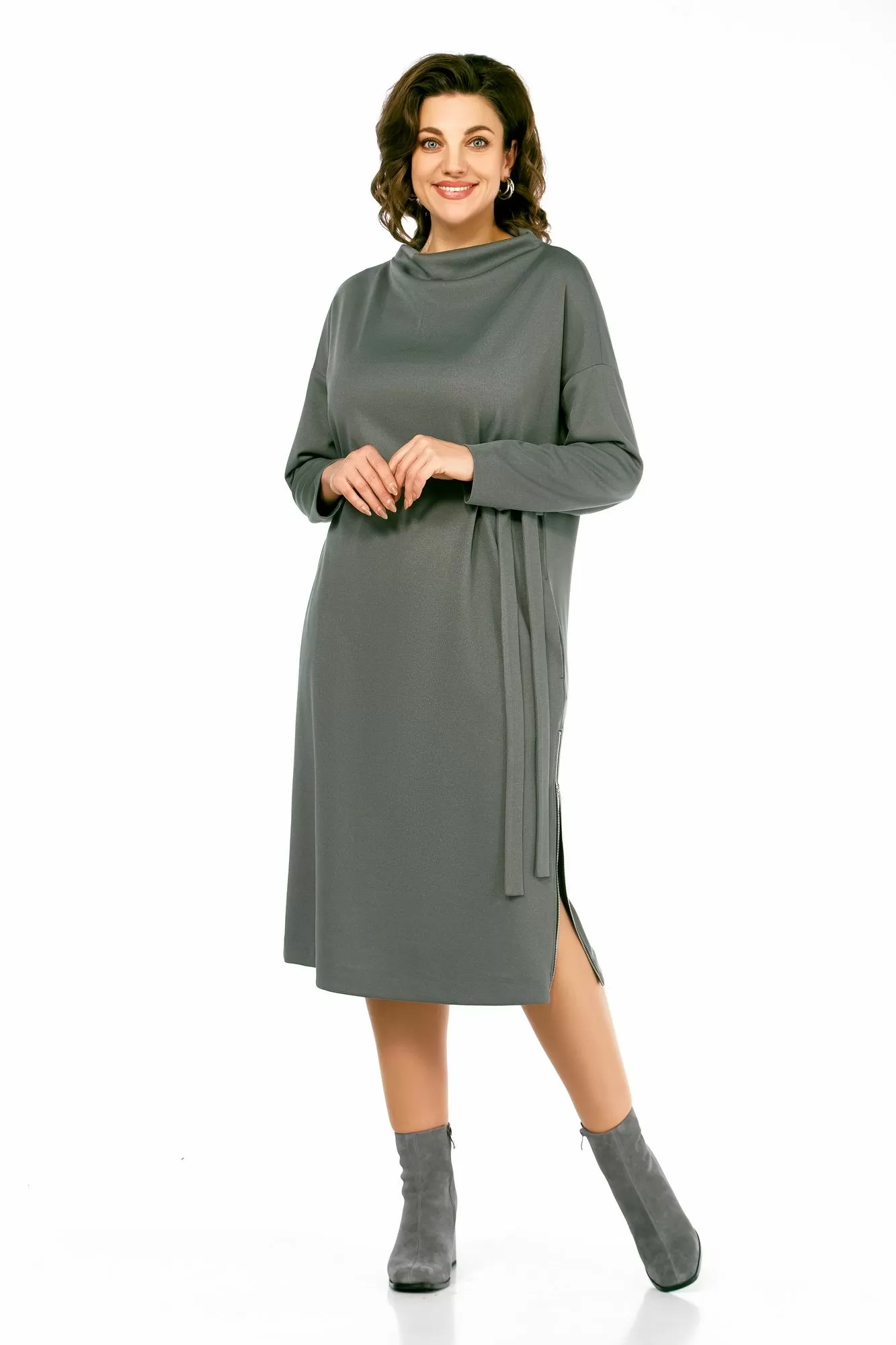 Платье женское, прямого силуэтв со спущенным длинным рукавом. Цельнокроенный воротник-стойка. Слевой стороны в области талии слева декор, в виде ниспадающего пояса. Карманы в боковых швах. Молния в левом боковом шве внизу функциональная молния, которая при растегивании превращается в разрез.