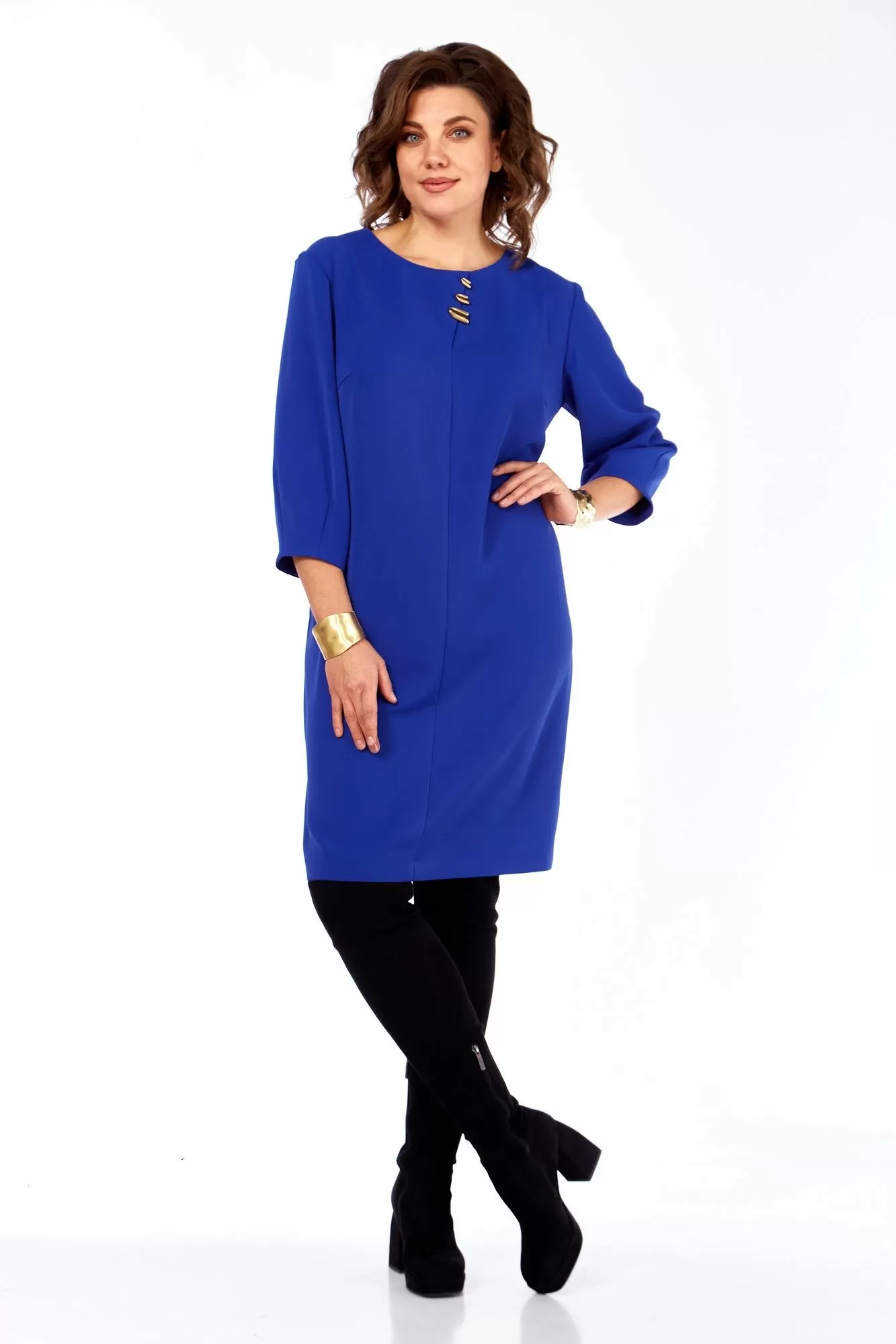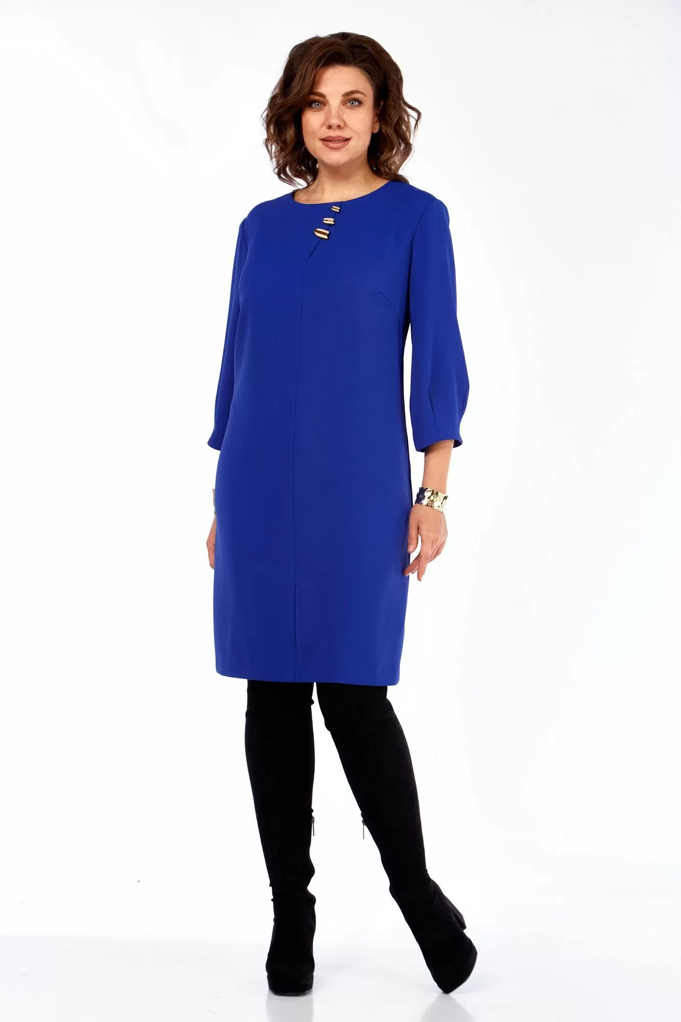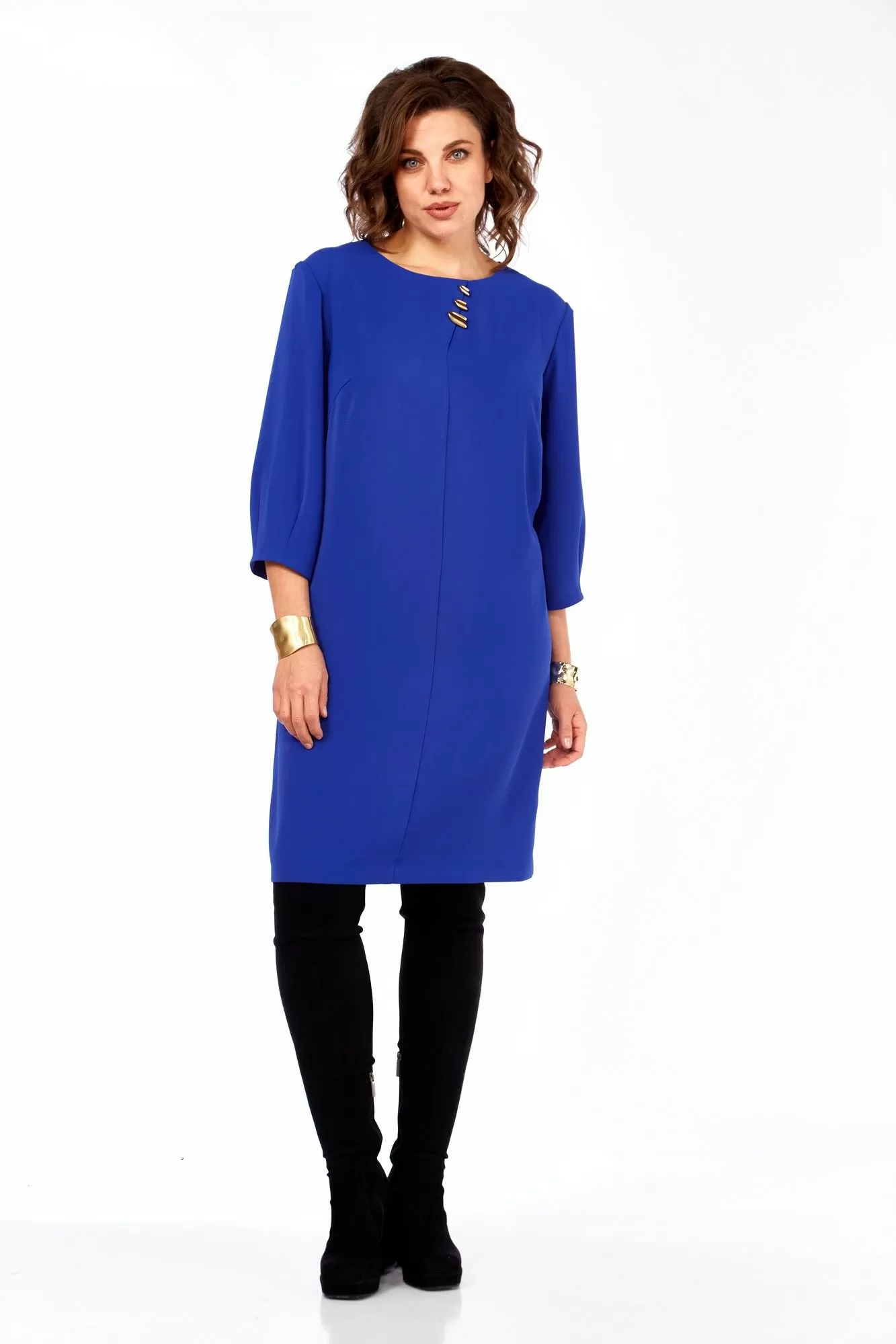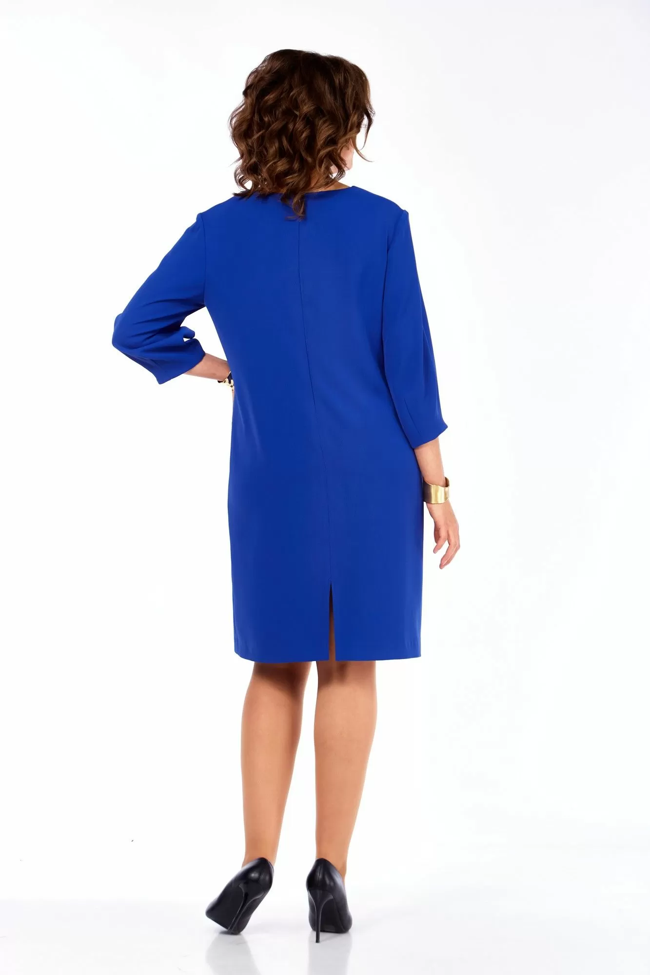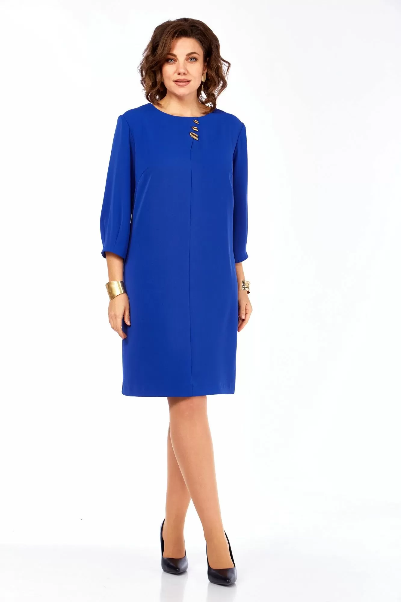 Нарядное платье, полуприлегающего силуэта. Вырез округлой формы, по центру шов, в верхней части, который уходит в ассиметричную складку, на которую пришиты декоративные пуговицы. Спинка со средним швом, молнией и разрезом. Рукав втачной, длиной ниже линии локтя, по низу вытачки, создающие дополнительный обьем по низу.