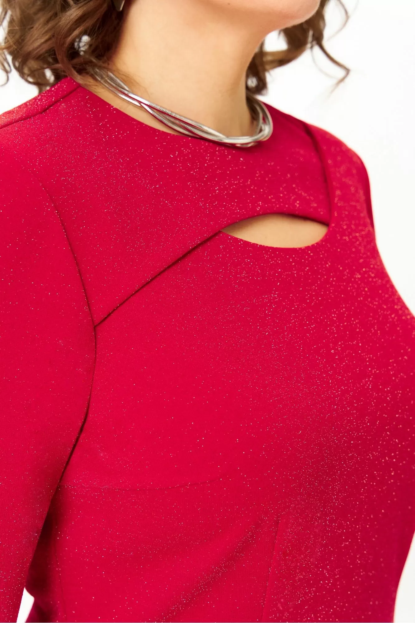 Платье женское, полуприлегающего силуэта, втачного покроя рукава, выполнено из трикотажного полотна с люрексовой нитью. По переду расположены талиевые и нагрудные вытачки, горловина округлой формы с пересекающейся кокеткой, которая образует фигурный вырез. Спинка со средним швом, заканчивающимся разрезом снизу и застегивающимся на навесную петлю-пуговицу сверху, а так же талиевые вытачки. Рукава ¾ одношовные.