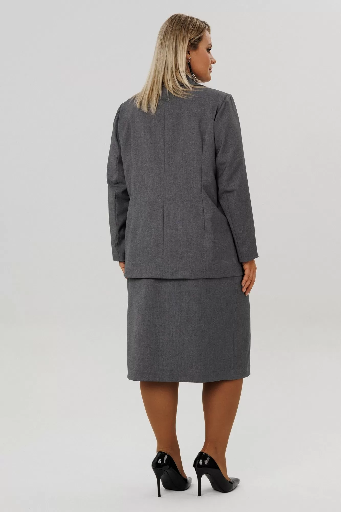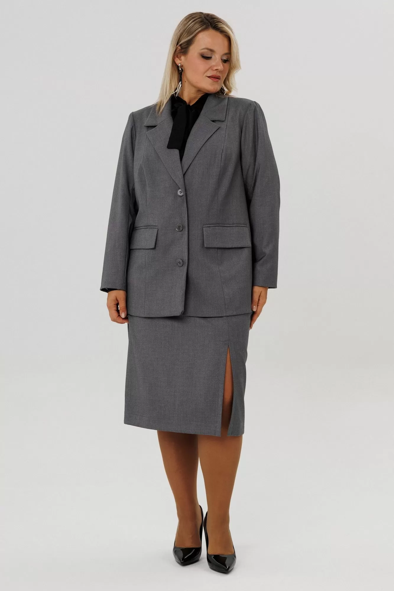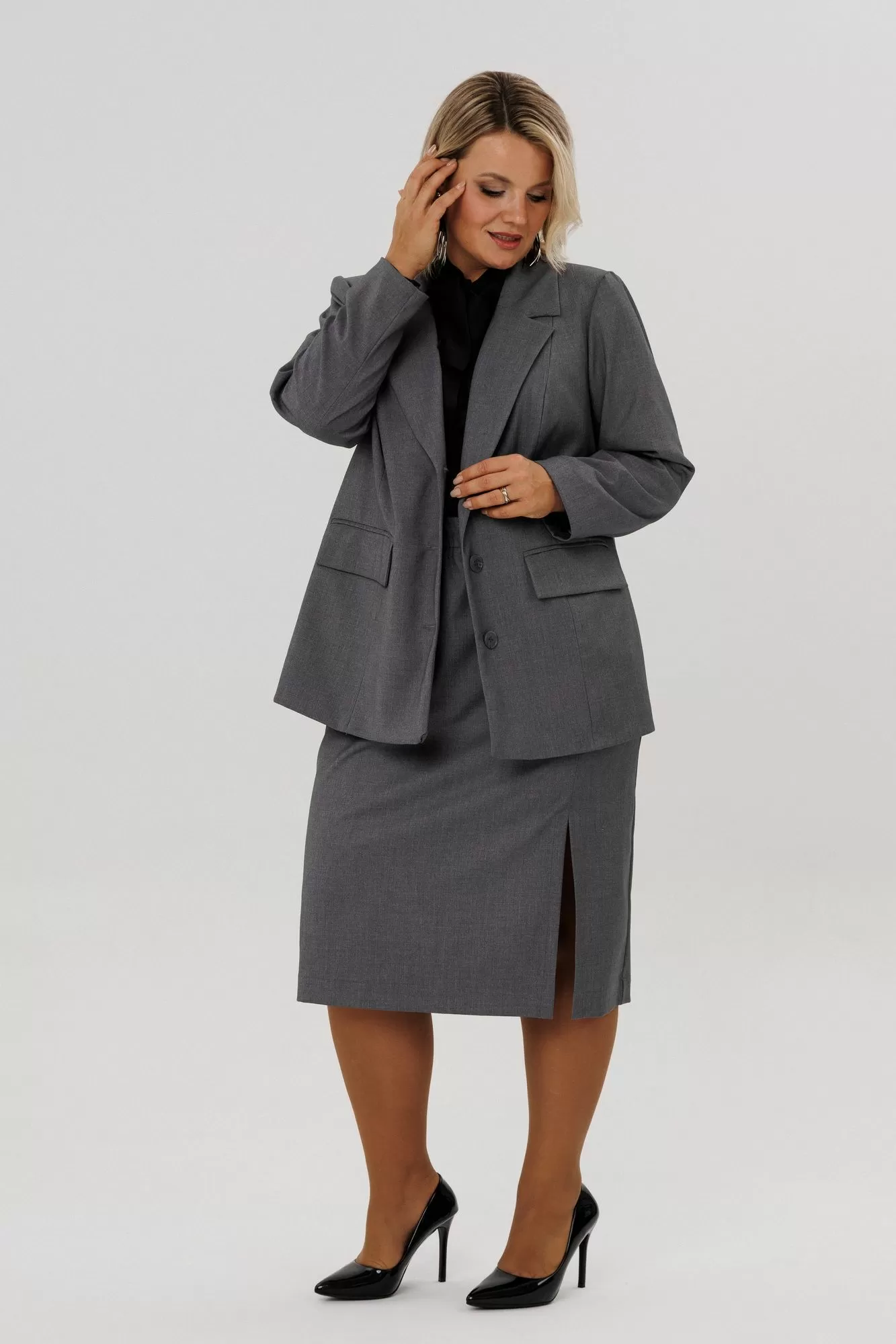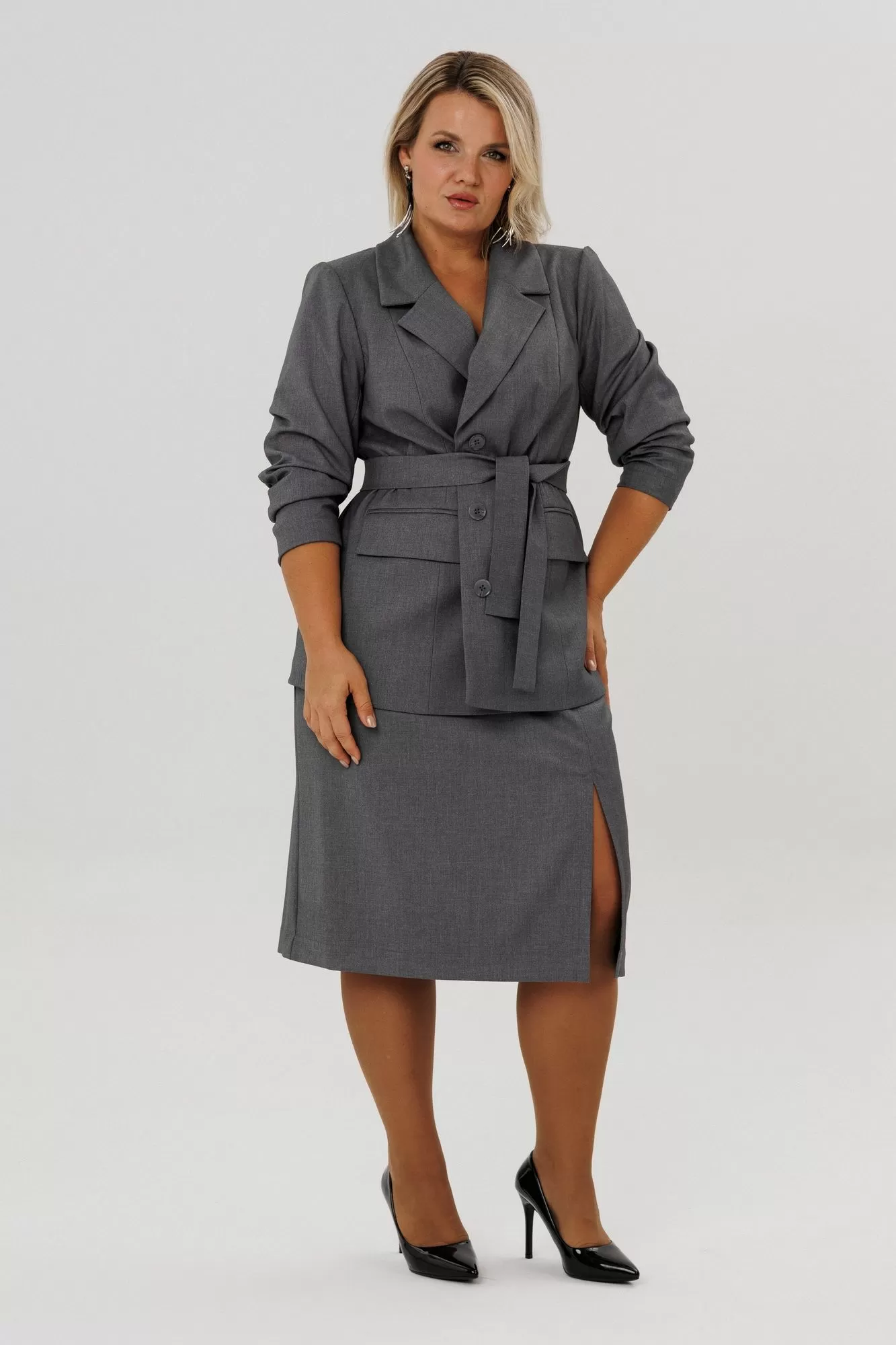 Комплект женский состоит из жакета и юбки. Жакет oversize, однобортный, прямого силуэта на подкладке. Отложной воротник с V-образным вырезом скроет несовершенства и визуально вытянет силуэт, сделает образ модным и стильным. Рукав втачной, двухшовный, полномерный по обхвату. На полочках карманы-клапаны. Отличительным дизайнерским решением являются декоративные пуговицы и съемный пояс. Юбка без подкладки из стрейчевой ткани, свободного покроя, с аккуратным разрезом на ноге. Пояс юбки на широкой резинке, сбоку молния и петля-пуговица.