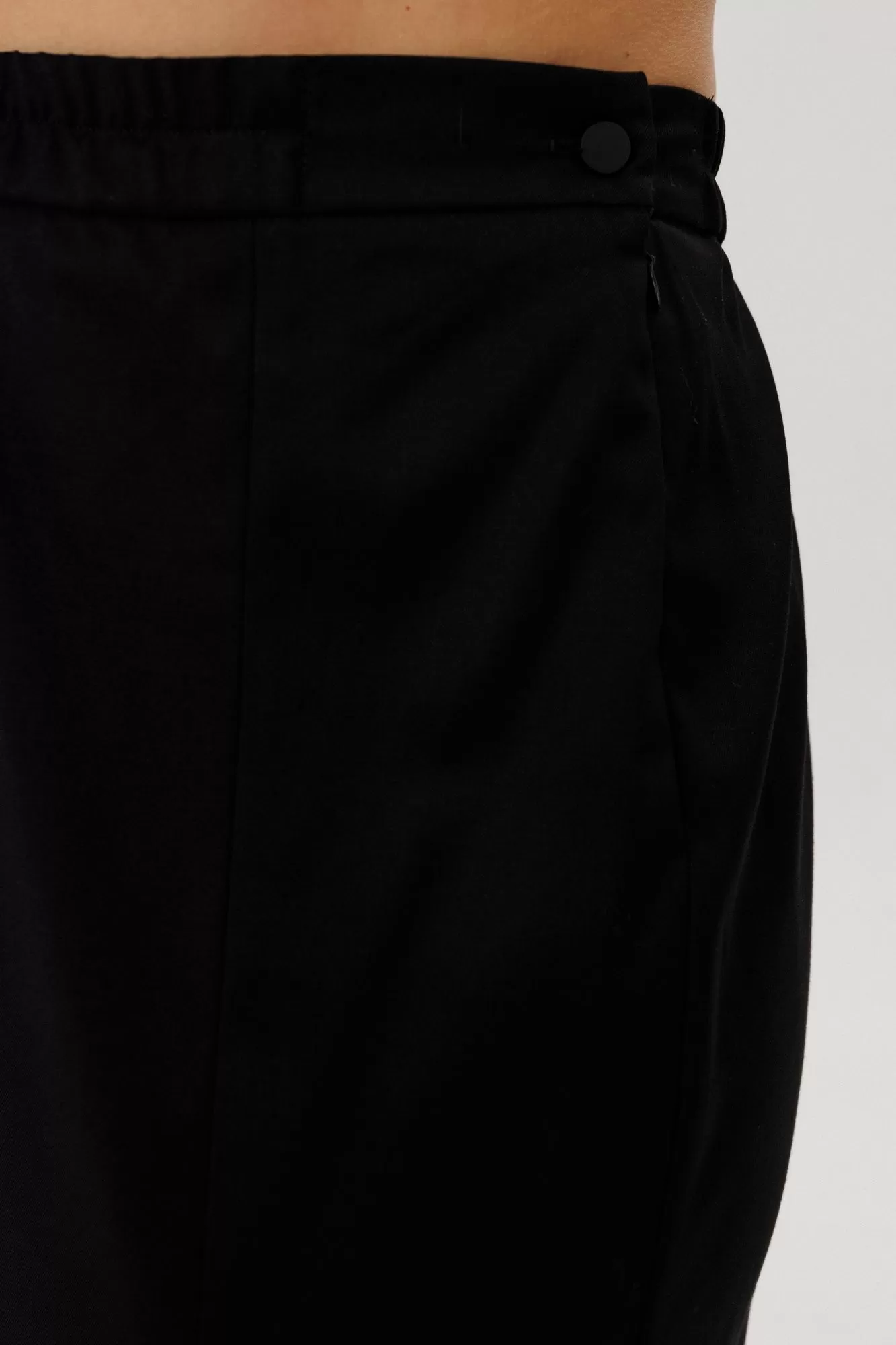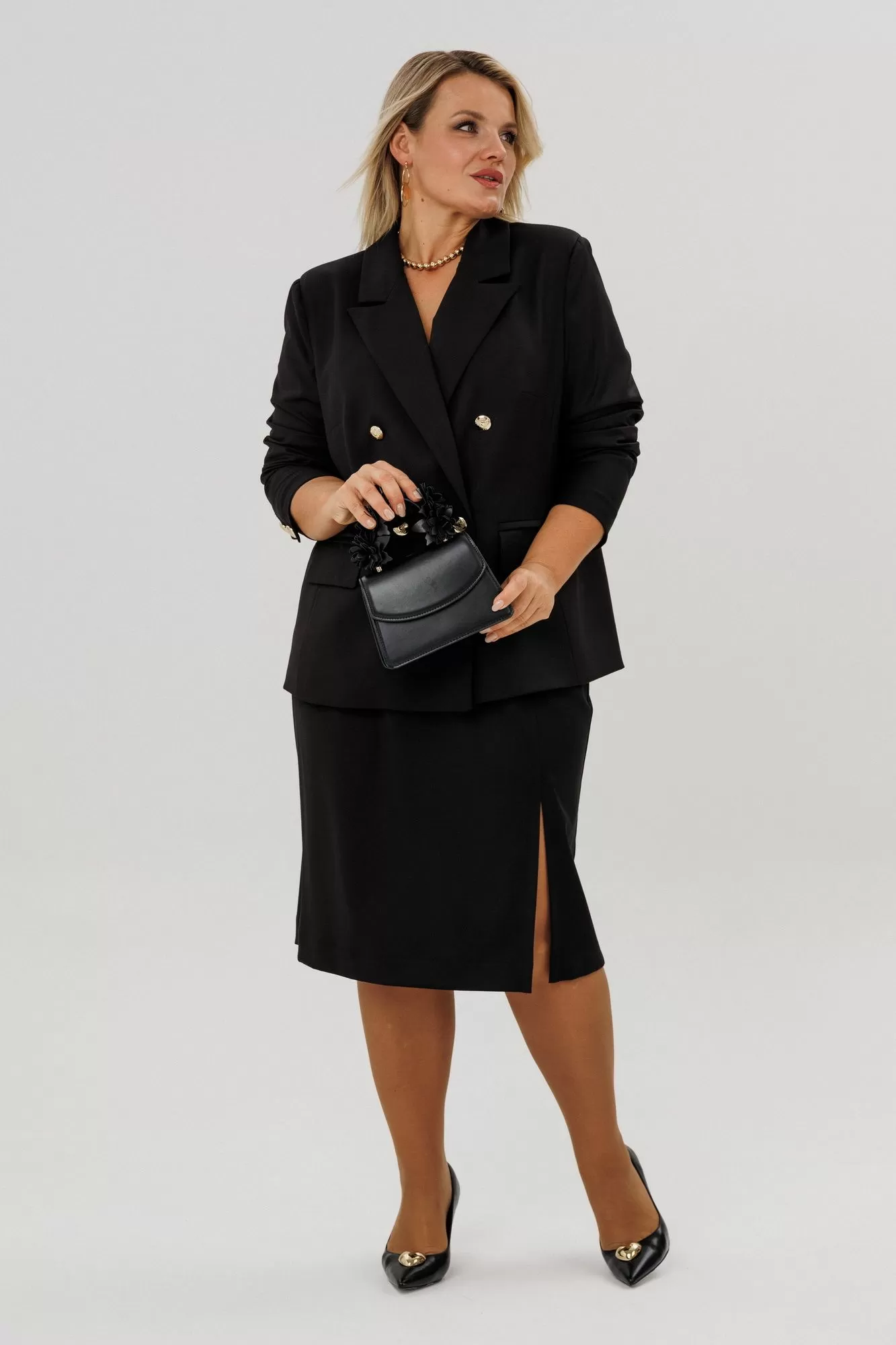 Юбка без подкладки, классическая, правильной длины миди, из стрейчевой ткани, свободного покроя, с аккуратным разрезом на ноге. Пояс юбки на широкой резинке, сбоку молния и петля-пуговица. Ткань хорошо тянется и это позволяет вам комфортно себя чувствовать.