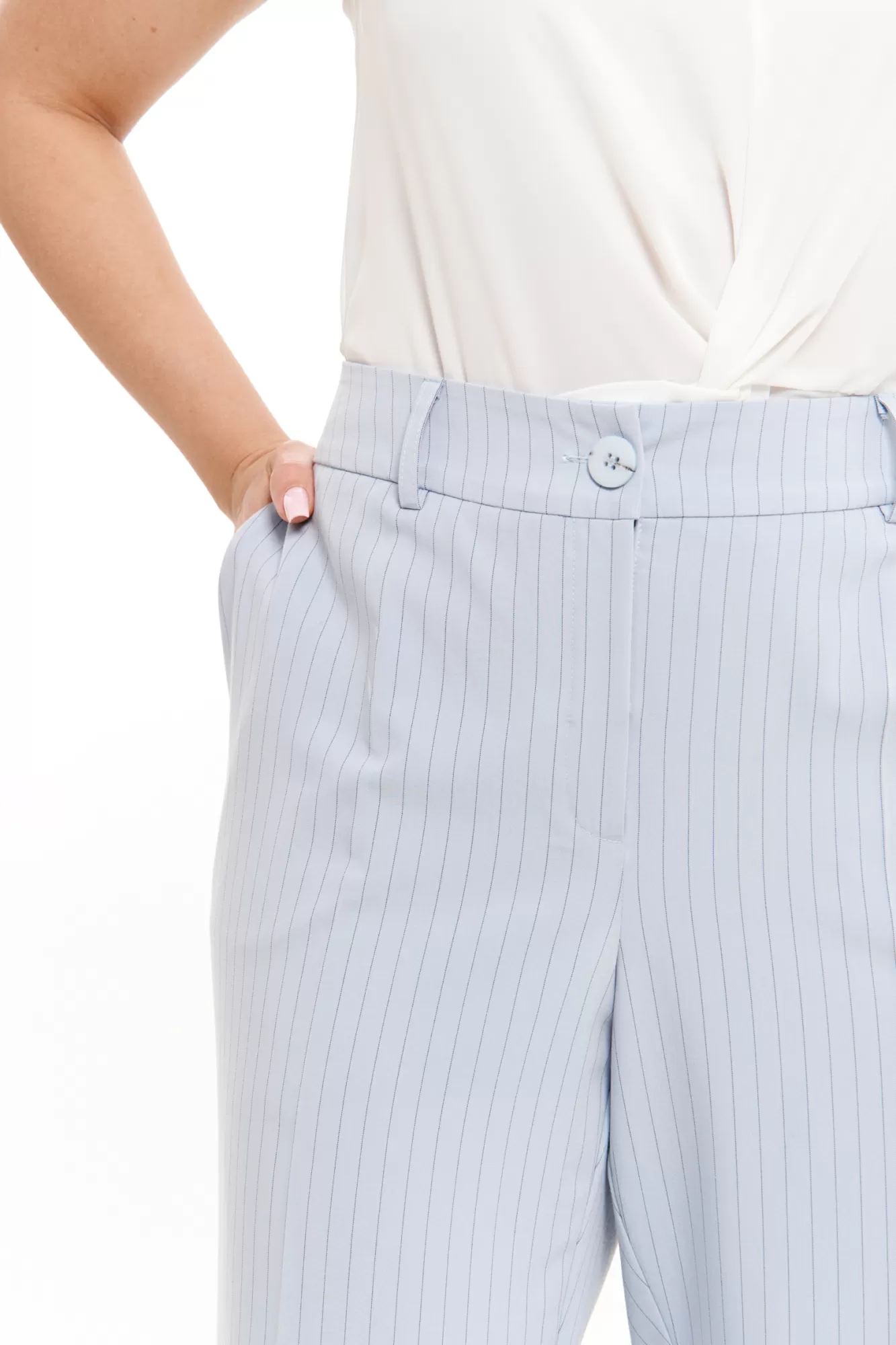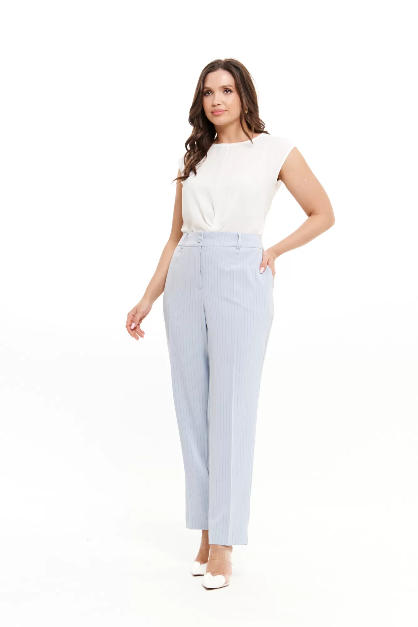 Женские брюки дополнены прорезными карманами в рамку и боковым карманом с подкройным бочком, что делает их практичными для повседневной носки. Небольшие разрезы по низу добавляют образу легкости. Нежный голубой цвет превращает эти брюки в праздничный вариант, который подчеркнет вашу женственность.