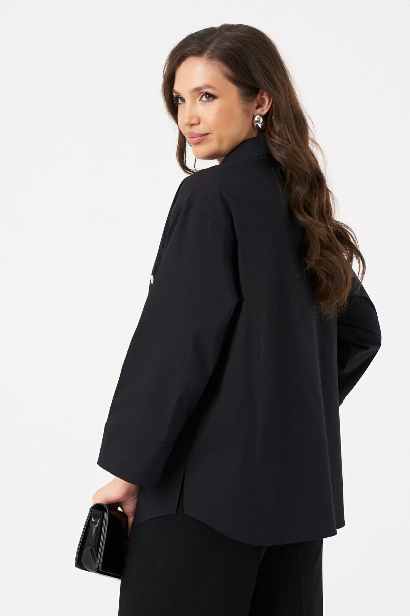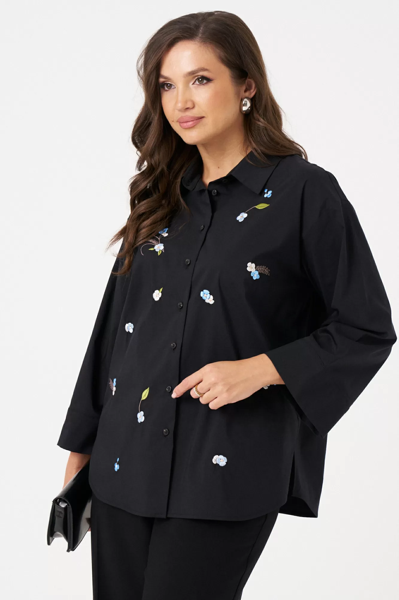 Это женская блузка чёрного оттенка из смесовой ткани с высоким содержанием хлопка, обеспечивающей комфорт и приятные тактильные ощущения. Модель выполнена с центральной бортовой застежкой, закрепленной на обметанных петлях и пуговицах, что придает ей классический и аккуратный вид. Перед украшен дизайнерской вышивкой в виде цветов, что добавляет изделию оригинальности и эстетической привлекательности. В боковых швах расположены небольшие разрезы, обеспечивающие свободу движений и удобство при носке. Горловина оформлена рубашечным воротником с отрезной стойкой, создавая структурированный и элегантный силуэт. Рукава втачные длинные, низ рукава обработан притачной манжетой, что делает дизайн завершенным и практичным. Эта блузка отлично подойдет для повседневных образов, сочетая комфорт, стиль и оригинальные декоративные элементы.