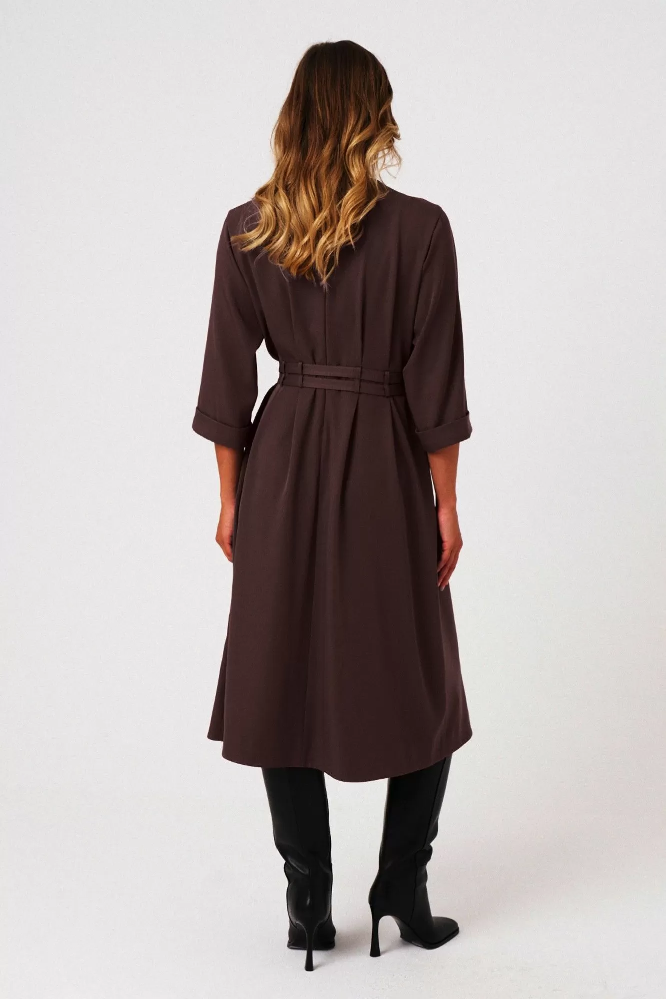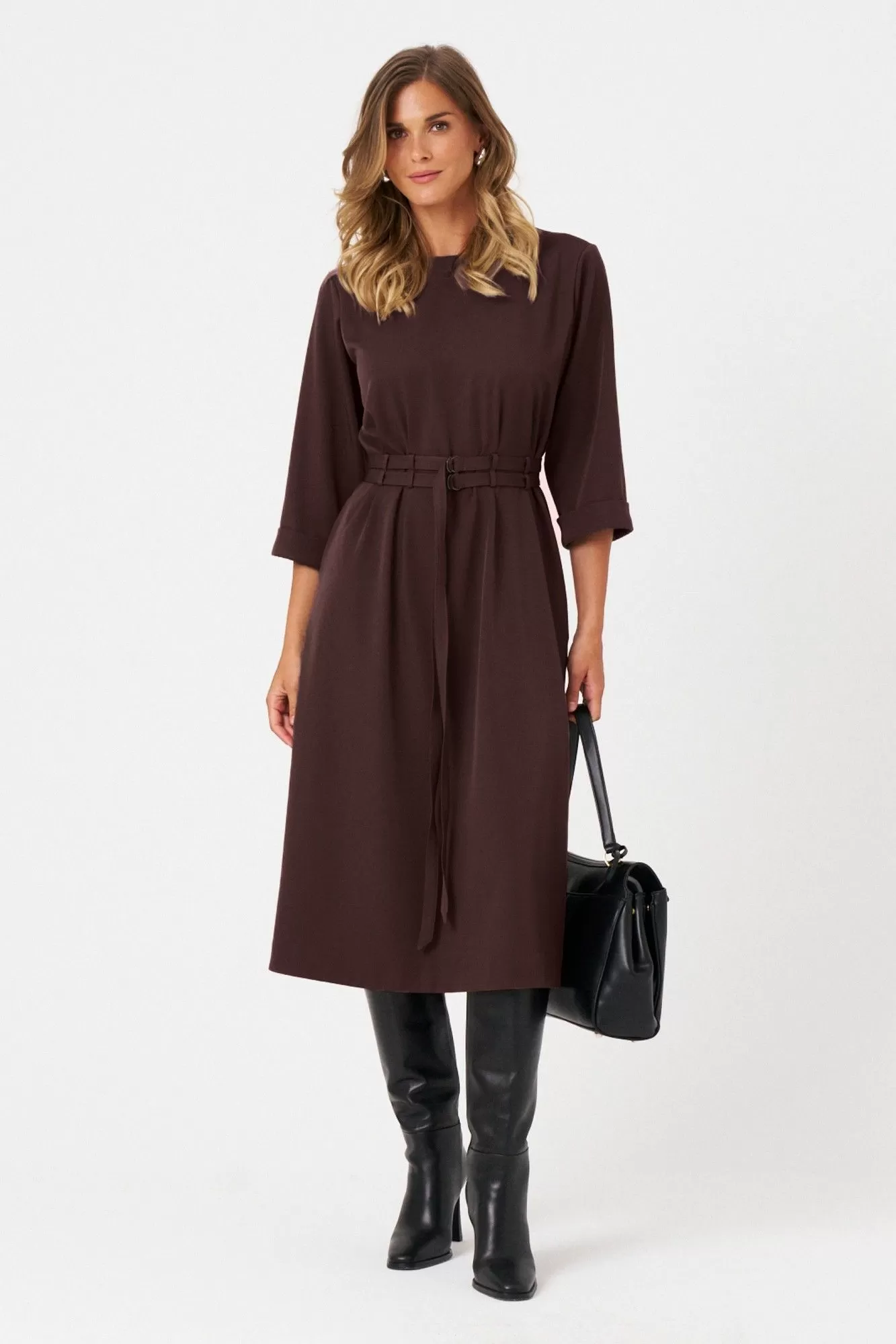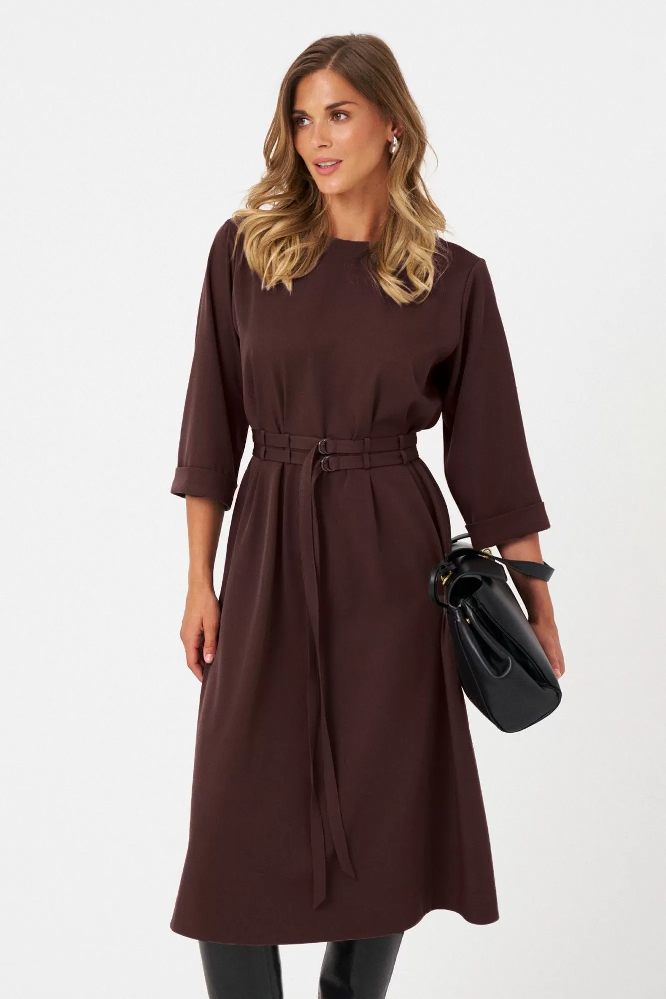 Это женское платье из поливискозной ткани идеально подходит для повседневной носки. Модель отличается комфортным кроем и стильным дизайном. Перед платья украшен защипами и шлевками, что позволяет просовывать два ряда поясов для создания разнообразных образов и акцентов. Спинка выполнена со средним швом и также украшена защипами и шлевками, а в среднем шве расположена застежка на тесьму-молнию для удобства надевания. Горловина чуть расширенная, придающая образу легкую элегантность. Рукава втачные, чуть ниже локтя, завершены отлетной манжетой, что добавляет изделию аккуратности и завершенности. А изящный бордовый оттенок платья позволяет его носить на различные случаи.