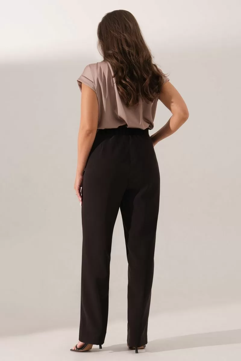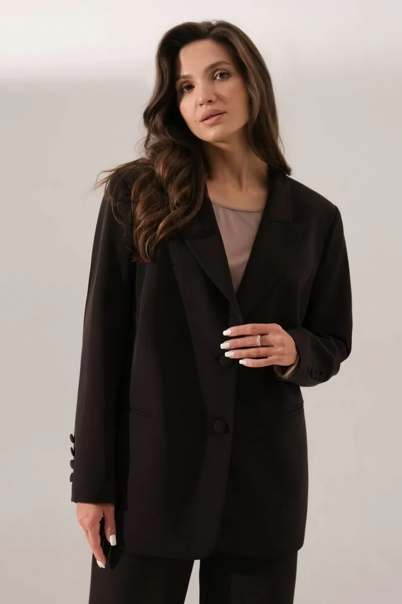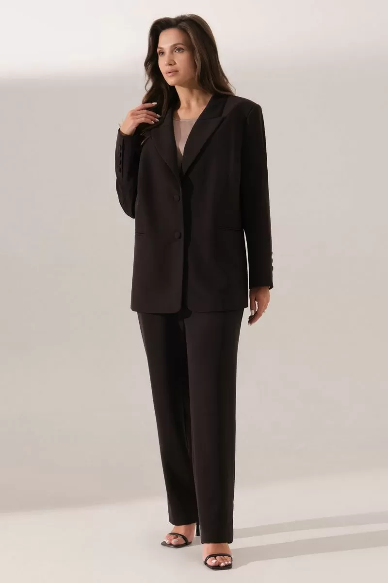 Костюм женский из смесовой ткани для повседневной носки. Костюм состоит из жакета и брюк. Жакет прямого силуэта на подкладке. Жакет с центральной бортовой застежкой на две обметанные петли и две пуговицы. Перед имеет две нагрудные вытачки, а также прорезные карманы с двумя обтачками. Спинка со средним швом. Горловина обработана пиджачным воротником. Рукав длинный, двухшовный. По низу рукава имеется шлица обманка на петли пуговицы. Верхний срез брюк обработан притачным поясом с застежкой на одну обметанную петлю и одну пуговицу, а также с застежкой на тесьму-молнию в среднем шве брюк. В боковых швах брюк имеются боковые прорезные карманы с подкройным бочком. Длина брюк классическая. Очень элегантный и стильный костюм, который будет отлично смотреться на любой фигуре.