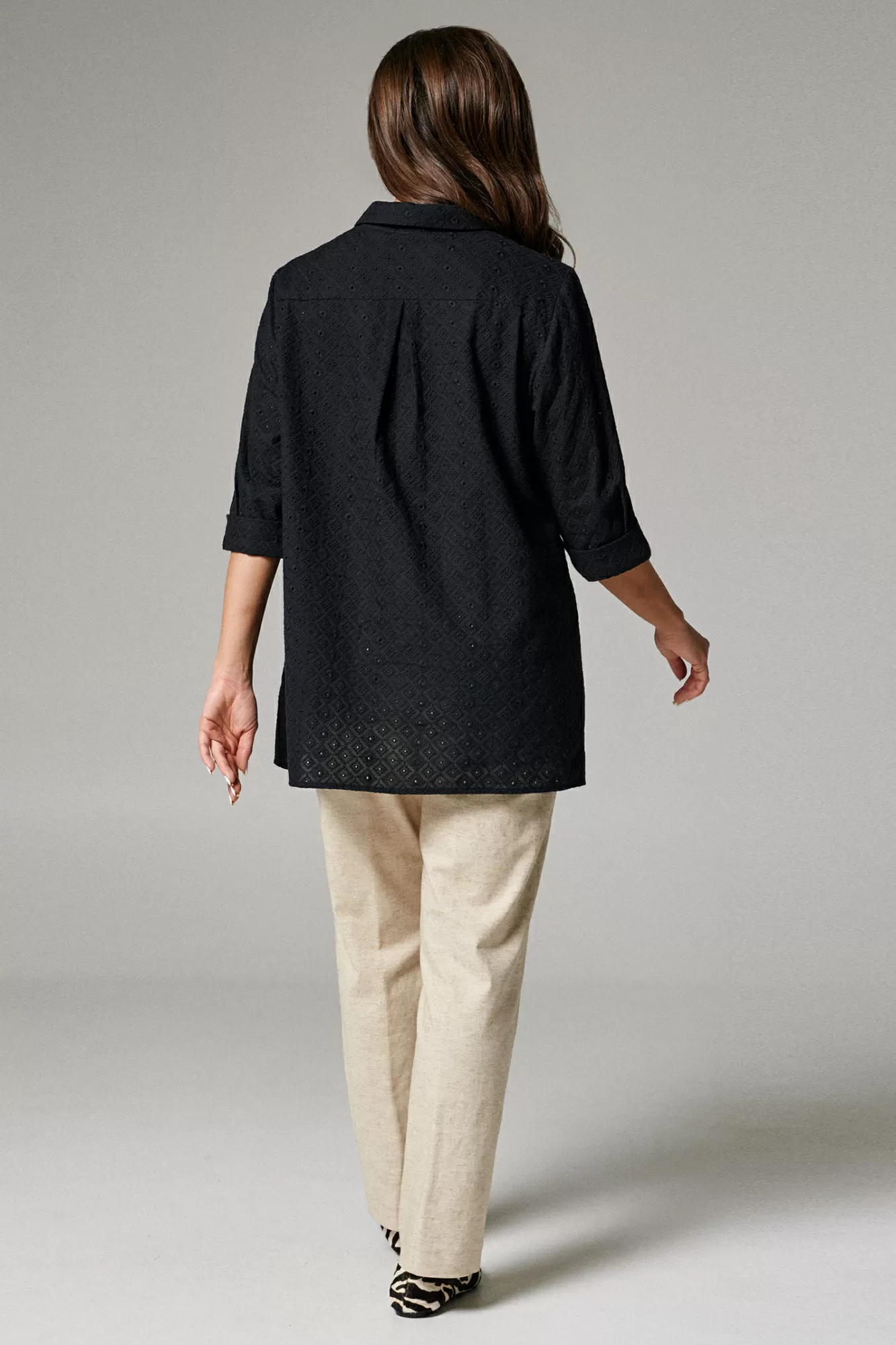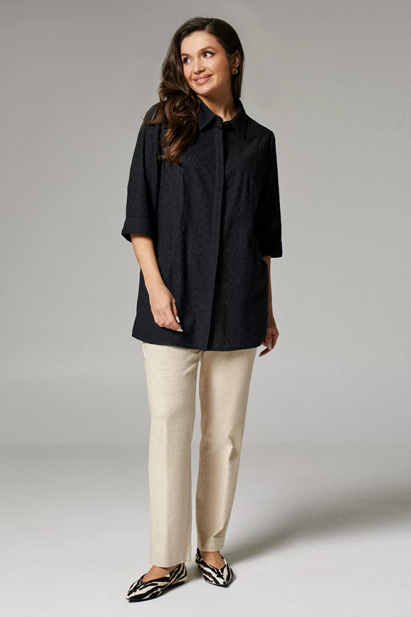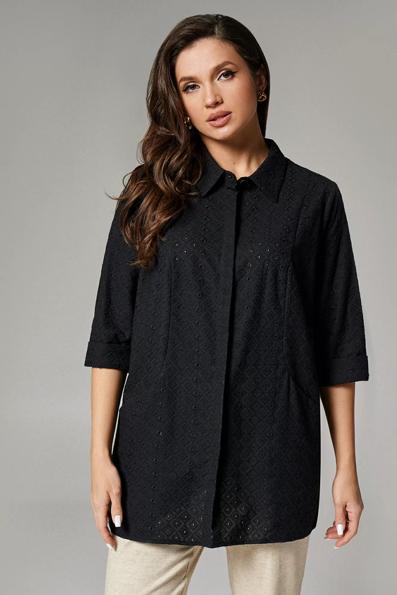 Легкая летняя блузка из хлопковой ткани. Блузка прямая, слегка удлинённая. Горловина оформленна воротником-стойкой, с застежкой на потойную планку. По переду в подрезе есть карман, а также рельефы. Рукава с притачными манжетами. Длина рукава 7/8. Отличный вариант для жарких летних дней.