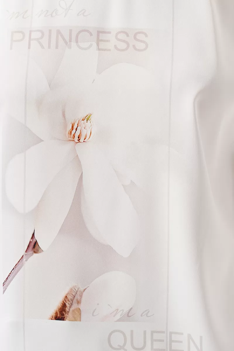 Летняя женская блузка с коротким рукавом – нарядная и одновременно сдержанная. Ее можно надеть на прогулку, встречу, сочетая с брюками разных видов и удобной обувью. Женская футболка белого цвета с принтом универсальная и не притязательна в выборе аксессуаров. Стильная трикотажная блузка с круглым выкатом выполнена в прямом крое. На рукавах имеются небольшие отвороты. Вы можете купить футболку нарядную женскую в стандартных размерах – 42-50.