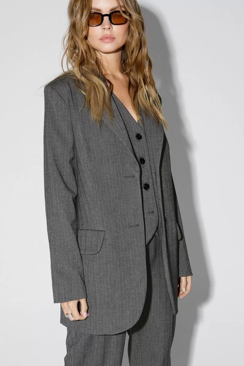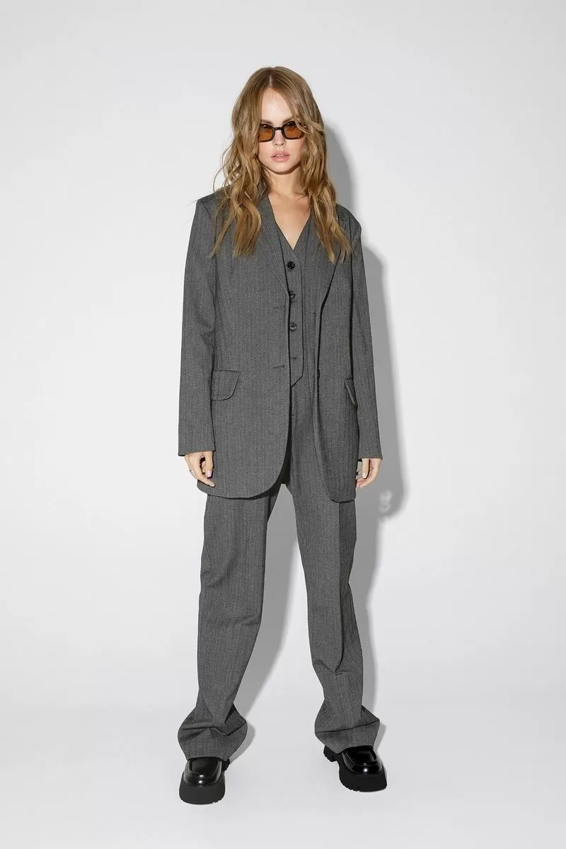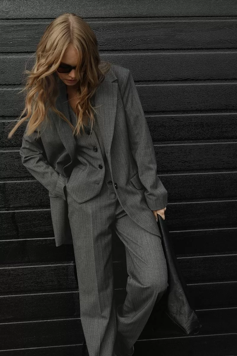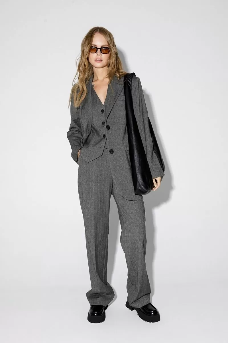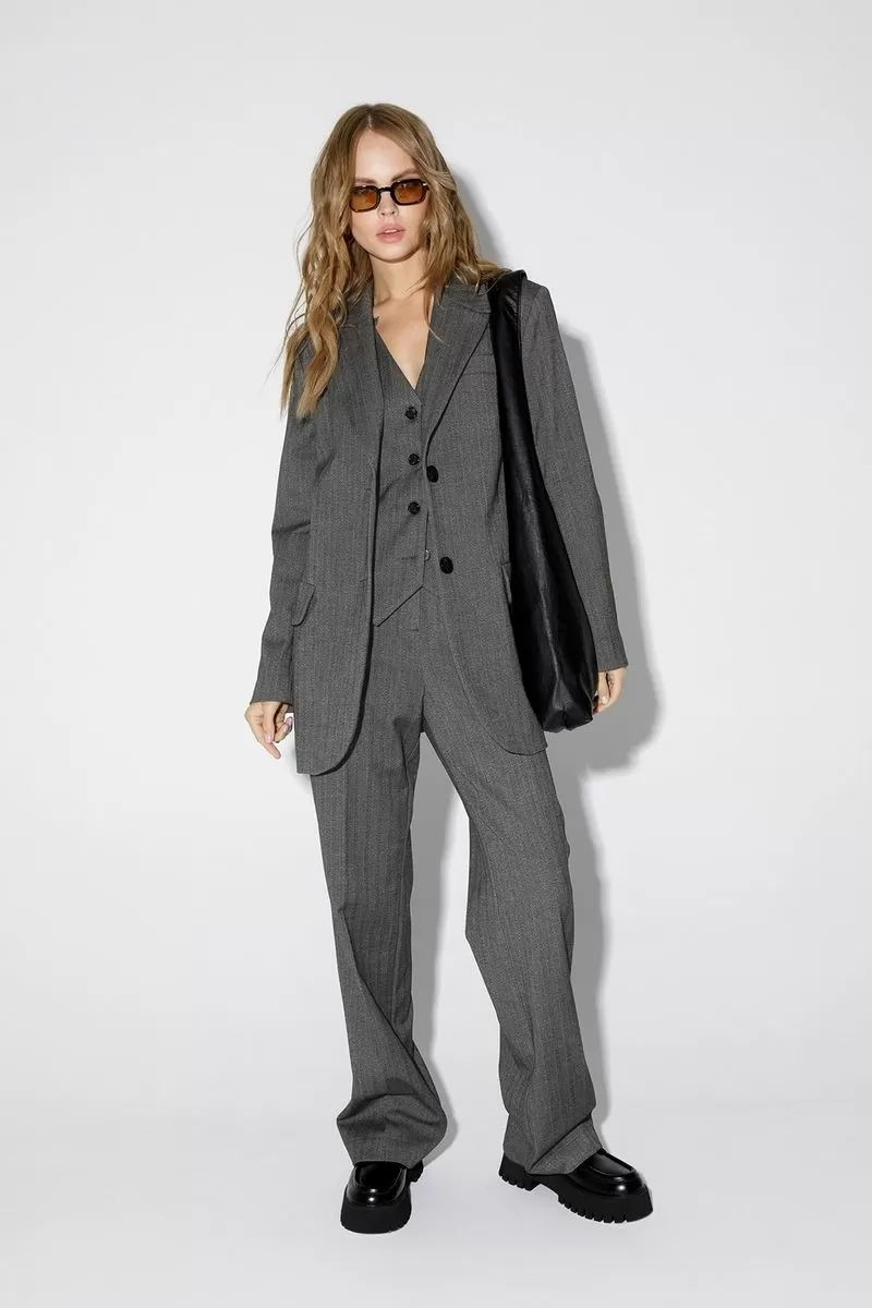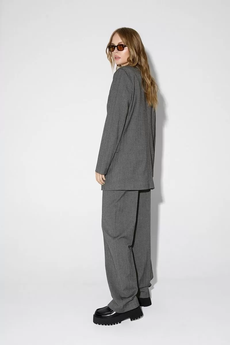Костюм-двойка из свободного жакета и прямых брюк со стрелками из текстильной ткани с рисунком «ёлочка». Детали: жакет с расширенной линией плеча, полуприлегающий силуэт, пиджачный воротник, талевые вытачки, перед с функциональным нагрудным карманом и двумя прорезными карманами с клапанами, застежка на пуговицы, спинка со средним швом, рукава втачные двухшовные, жакет на подкладке. Брюки с высокой посадкой на притачном поясе со шлевками, застежка на молнию и пуговицу, боковые карманы, передние половины с заутюженными стрелками и двумя небольшими складками
