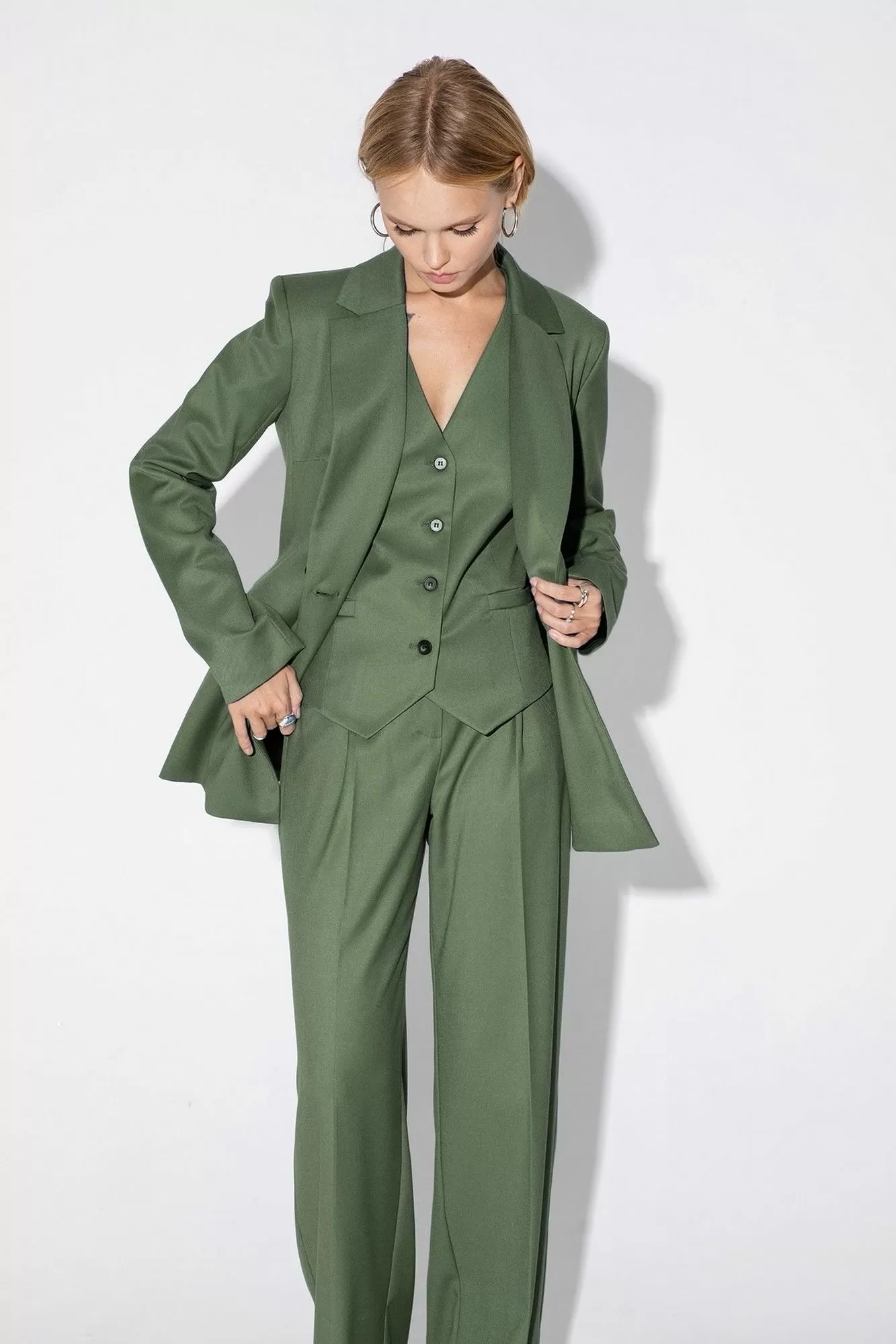 Длина жакета по спинке около 68/71 см, длина рукава около 61 см. Длина брюк по боковому шву с поясом около 113/114,5 см.