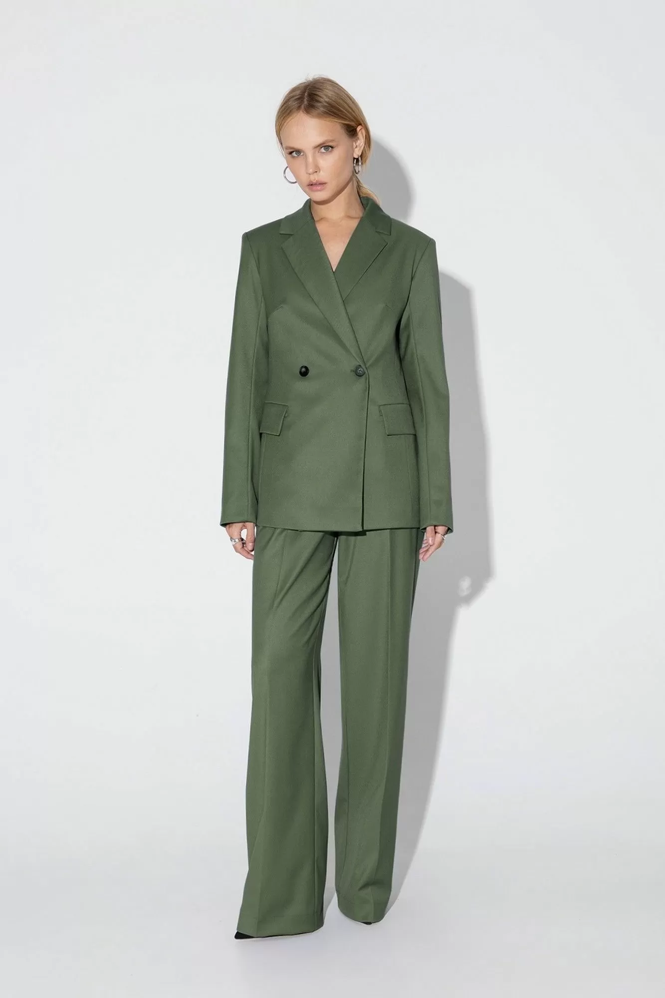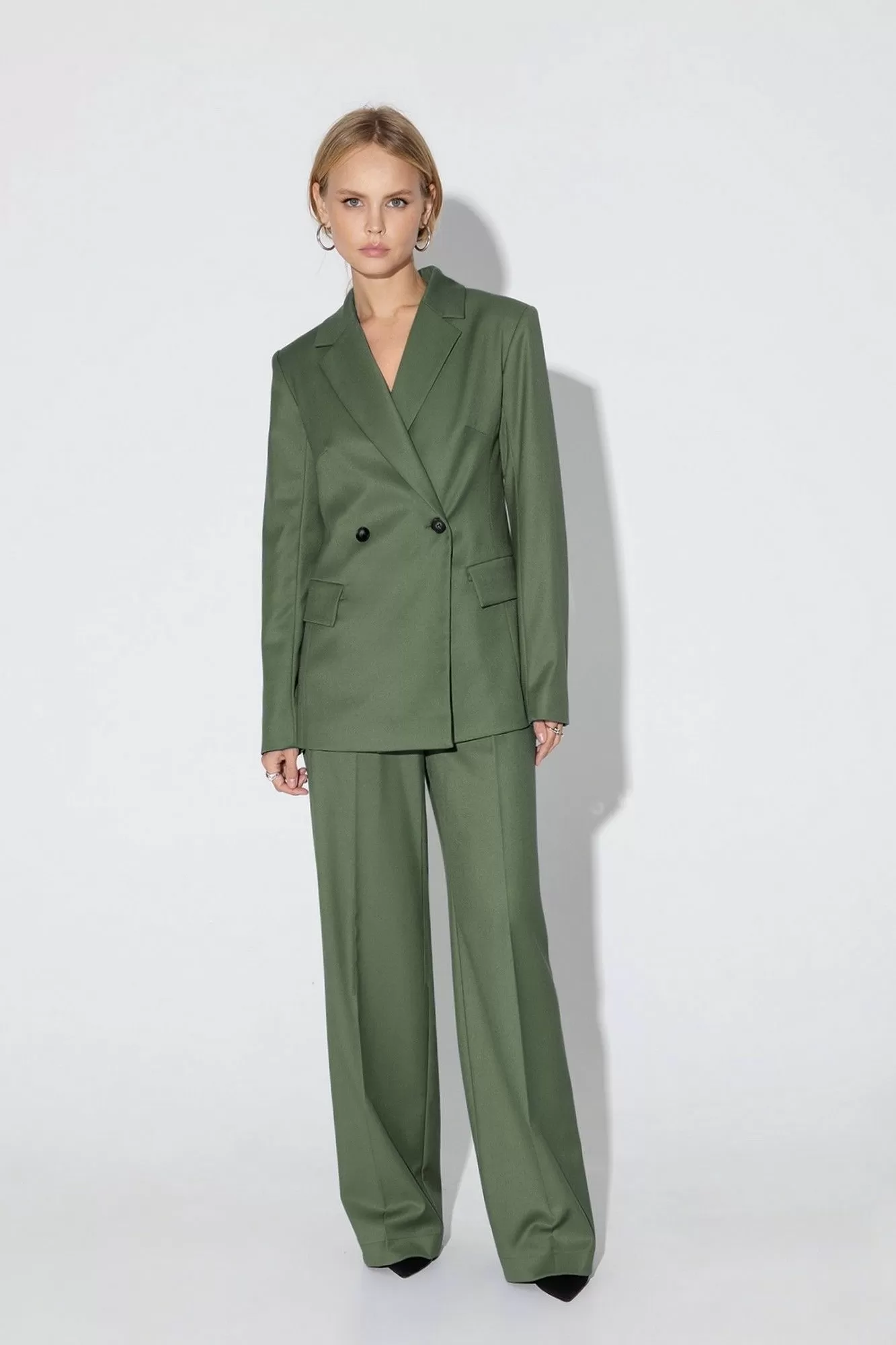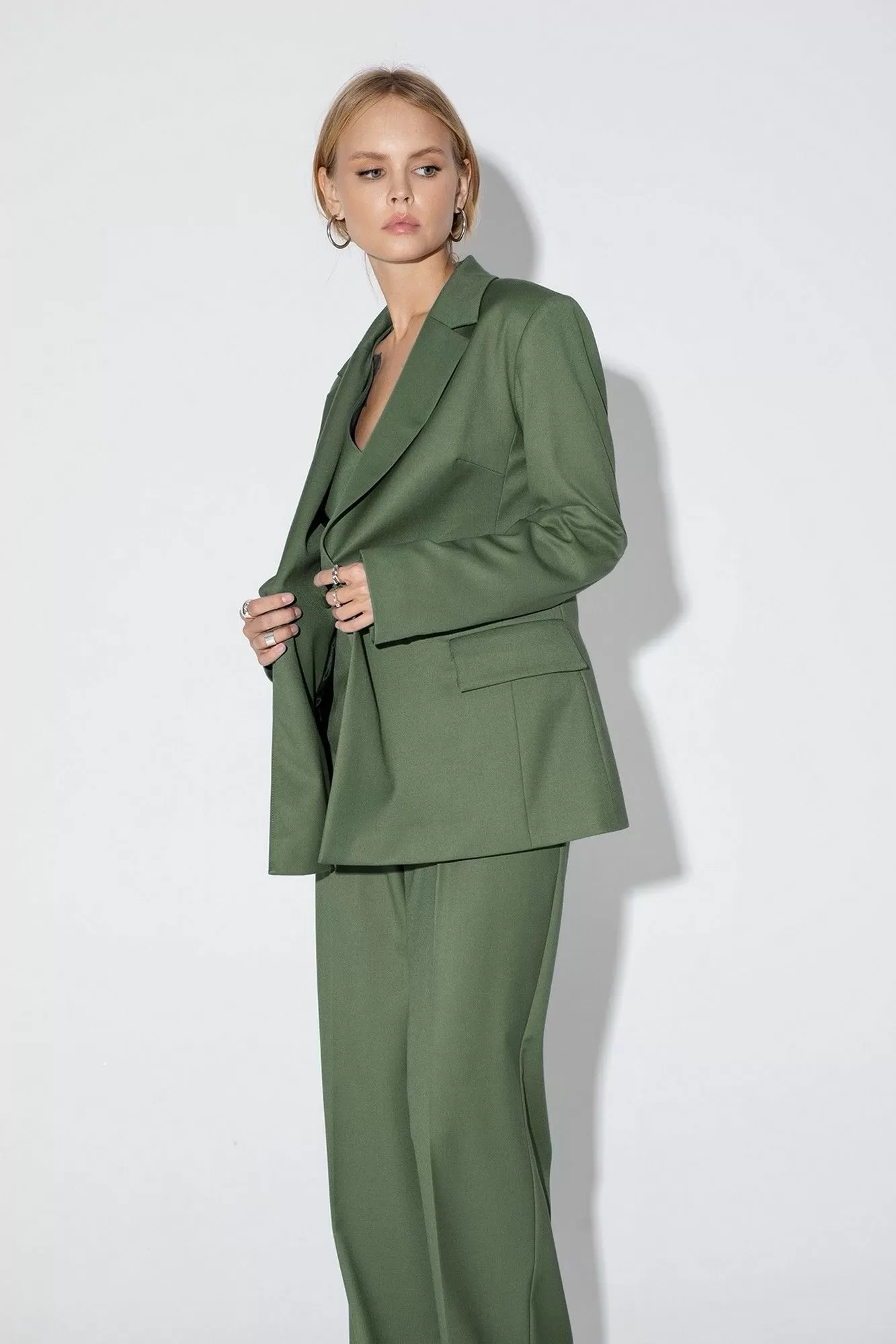 Текстильный костюм-двойка из двубортного полуприлегающего жакета и прямых брюк со стрелками. Детали: жакет с отрезными бочками и нагрудными вытачками, пиджачный воротник, прорезные карманы, застежка на петли и пуговицы, спинка со средним швом, втачные двухшовные рукава, жакет на подкладке. Брюки с высокой посадкой на притачном поясе со шлевками, передние половины с небольшими застроченными мягкими складками и заутюженными стрелками, застежка на молнию и пуговицу, боковые карманы.