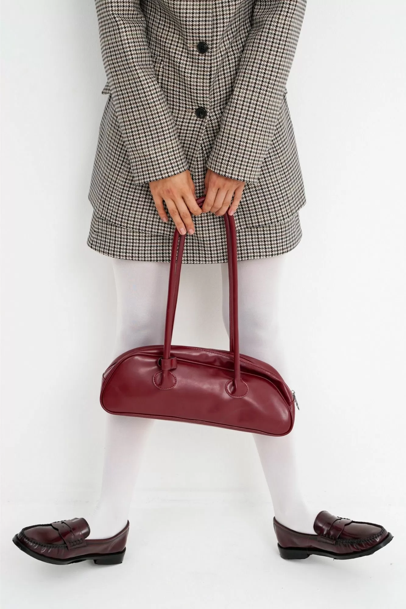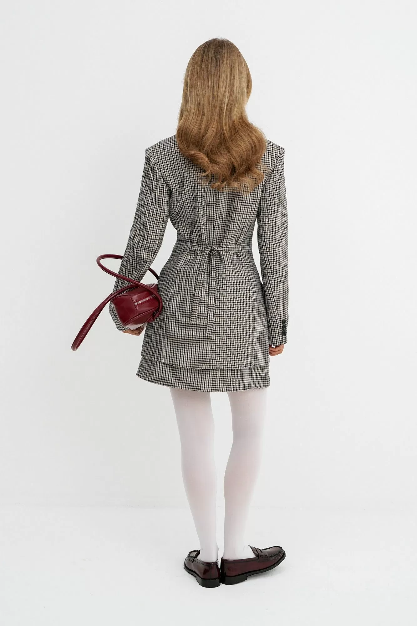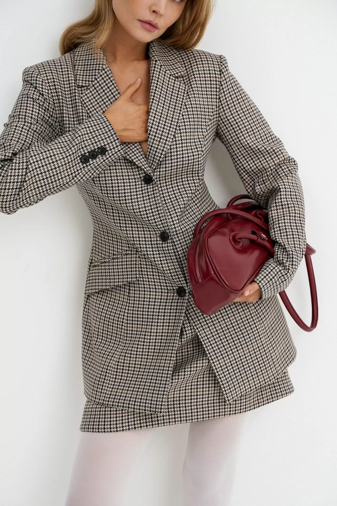 Костюм-двойка из удлиненного приталенного жакета и мини-юбки из текстильной ткани с рисунком «гусиная лапка».