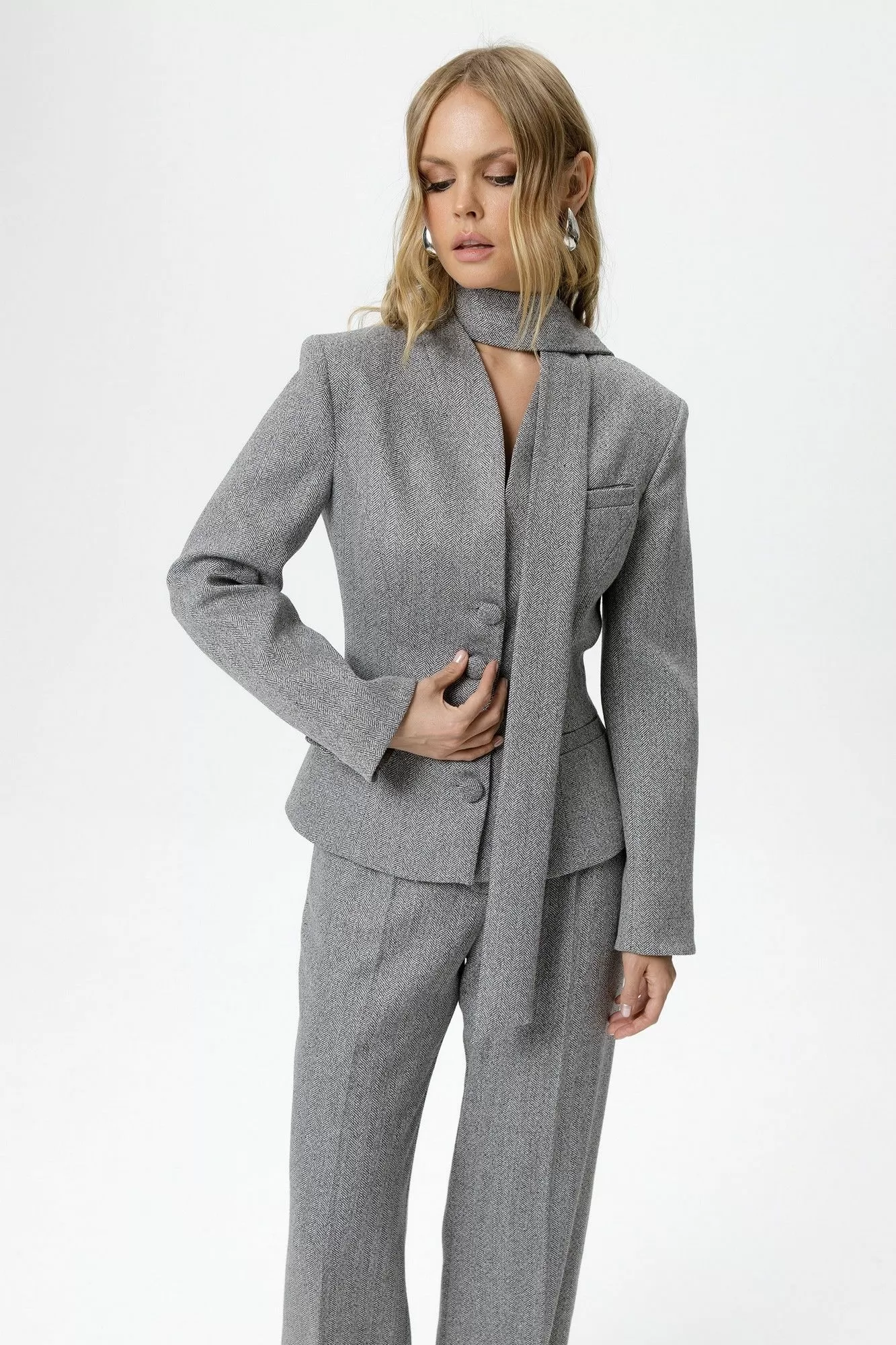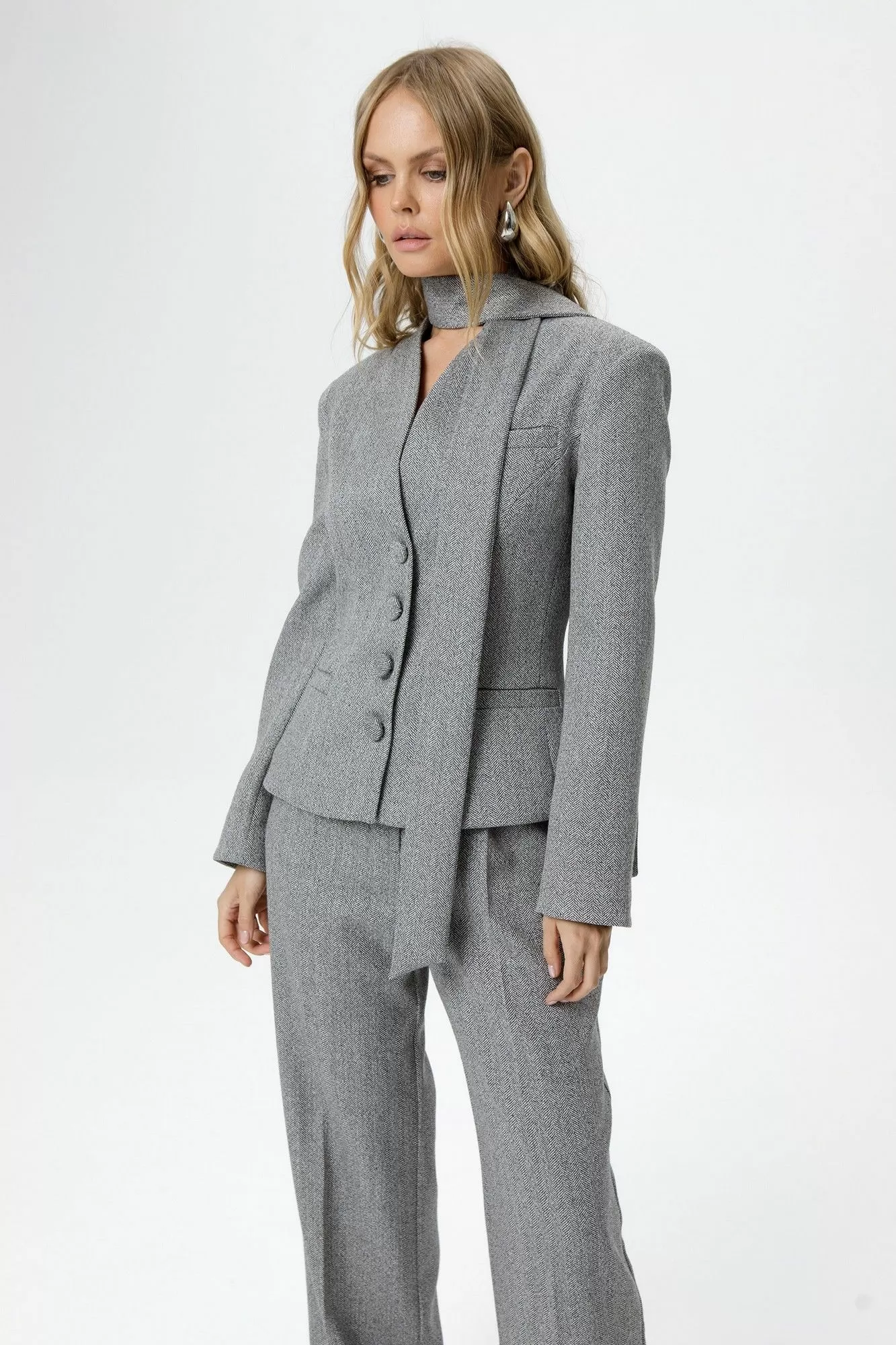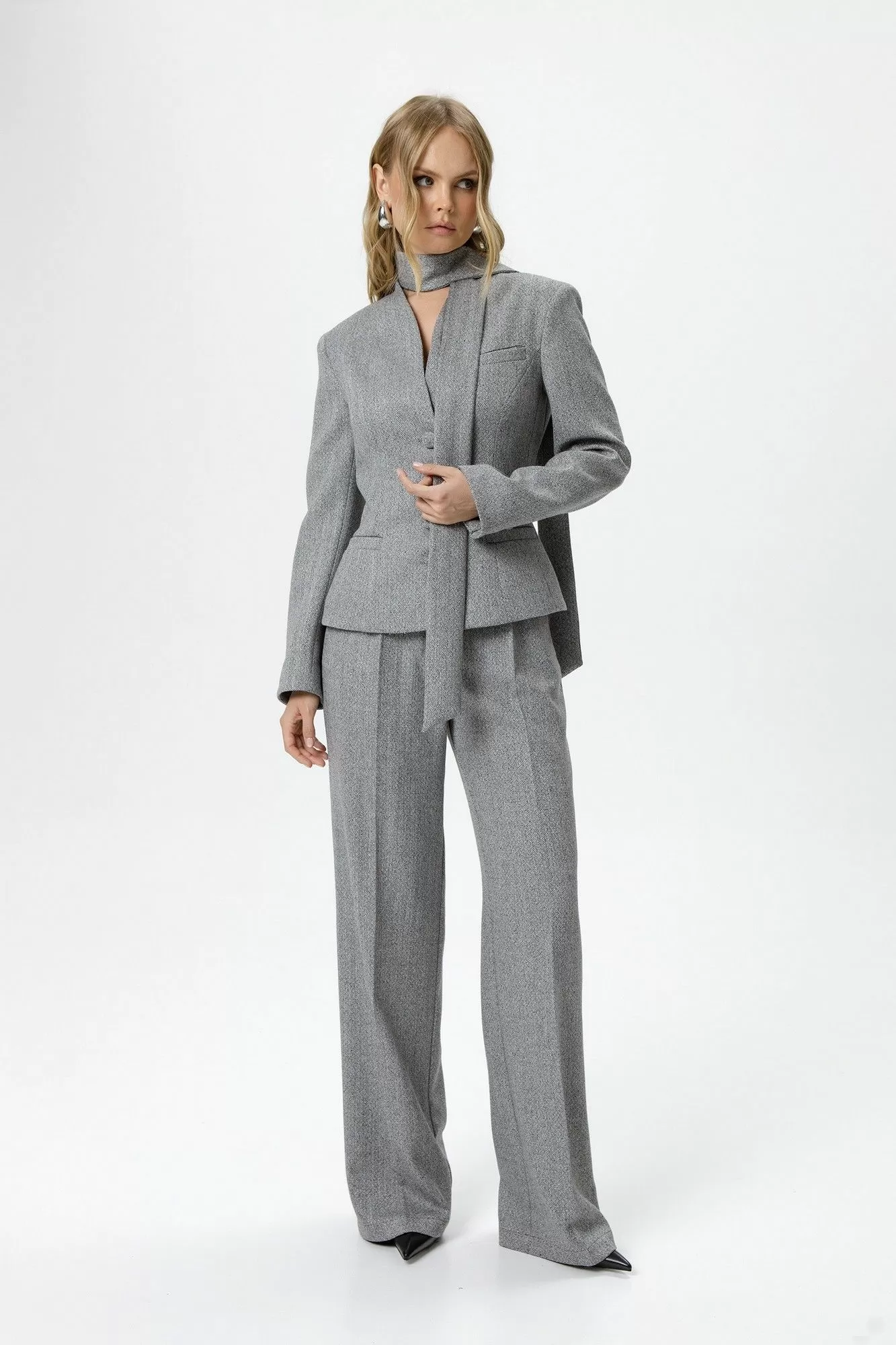 Костюм-двойка из приталенного жакета со съемным шарфиком и широких прямых брюк с рисунком «ёлочка».