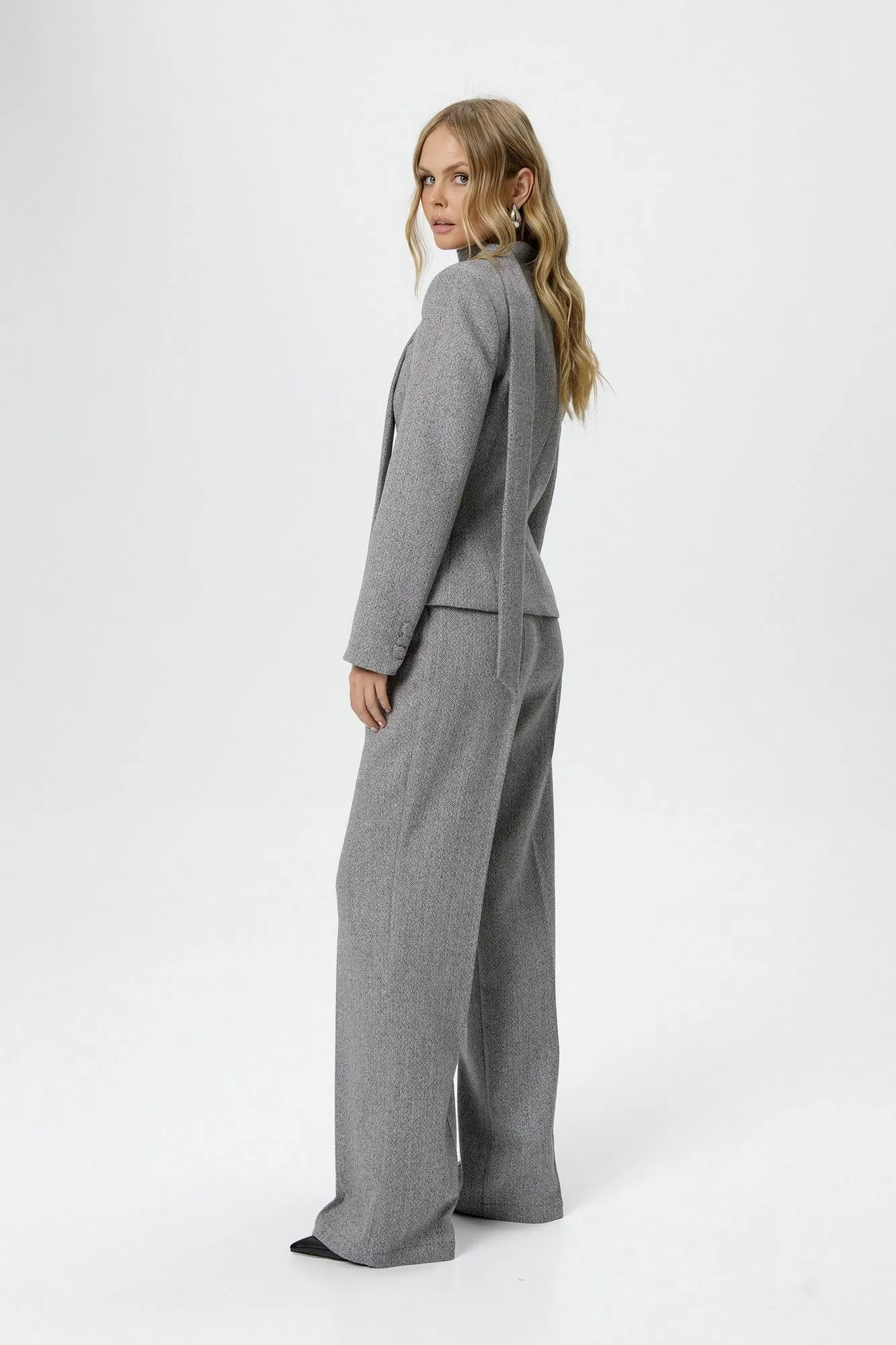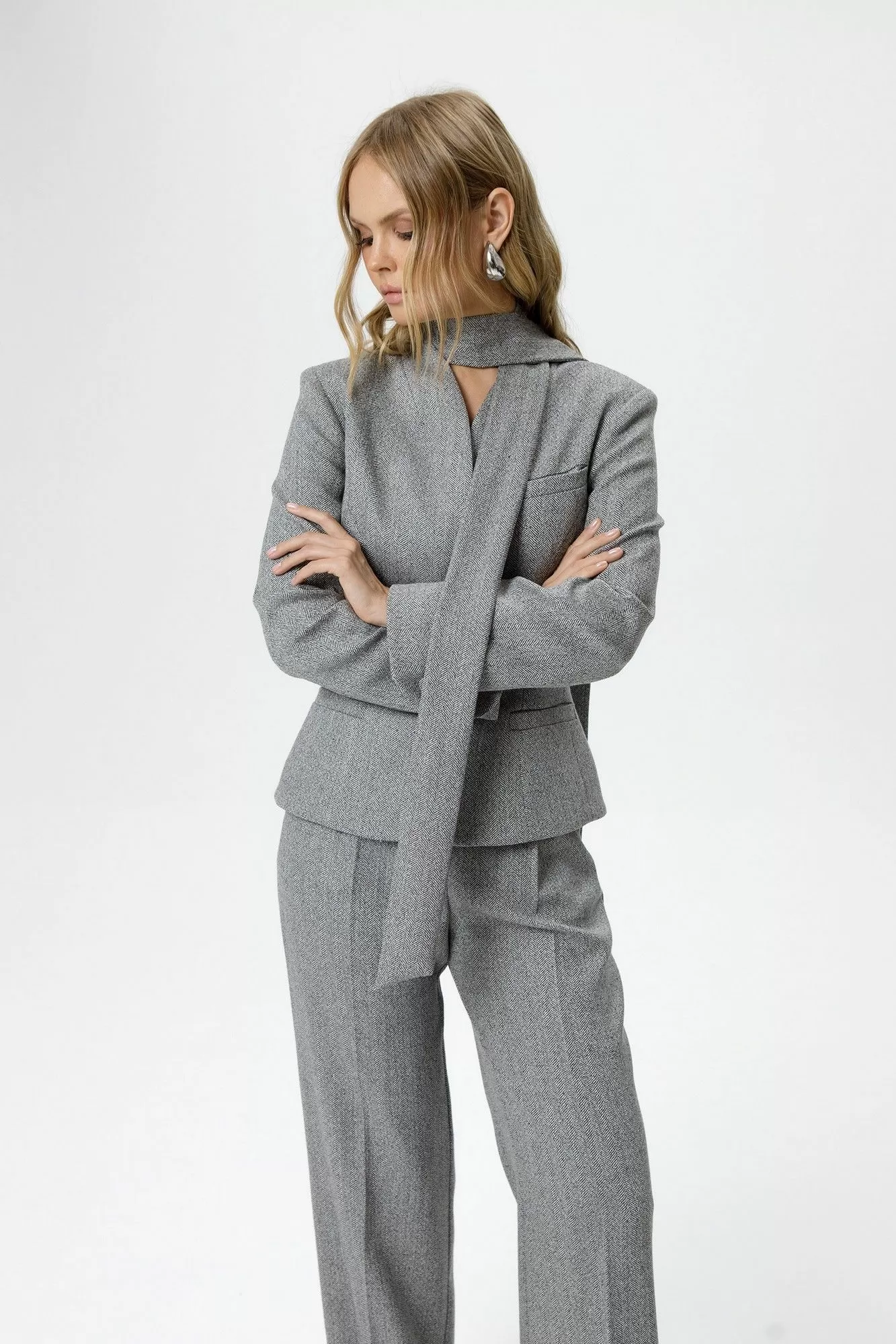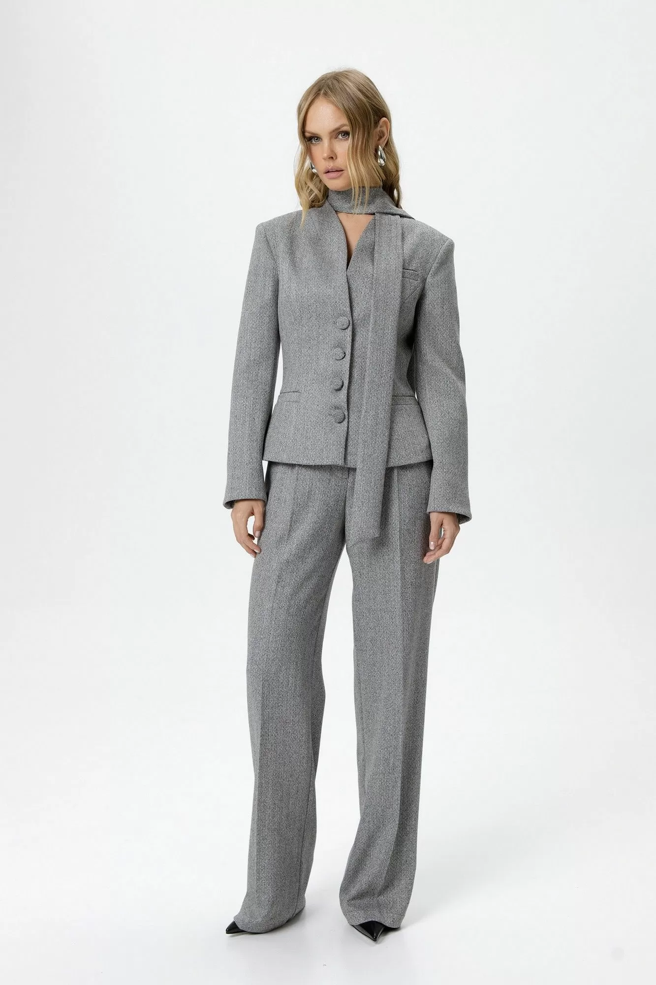 Костюм-двойка из приталенного жакета со съемным шарфиком и широких прямых брюк с рисунком «ёлочка».