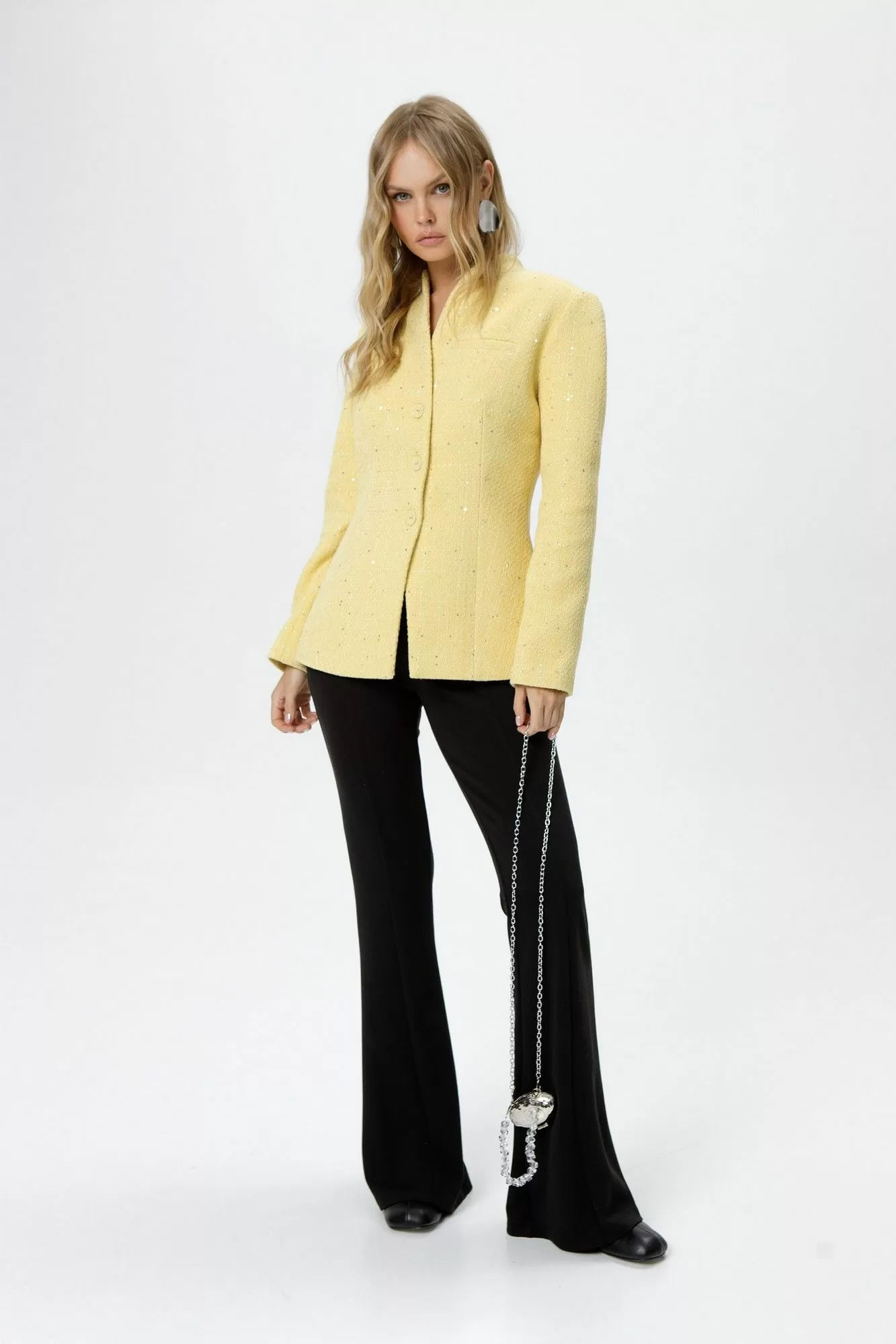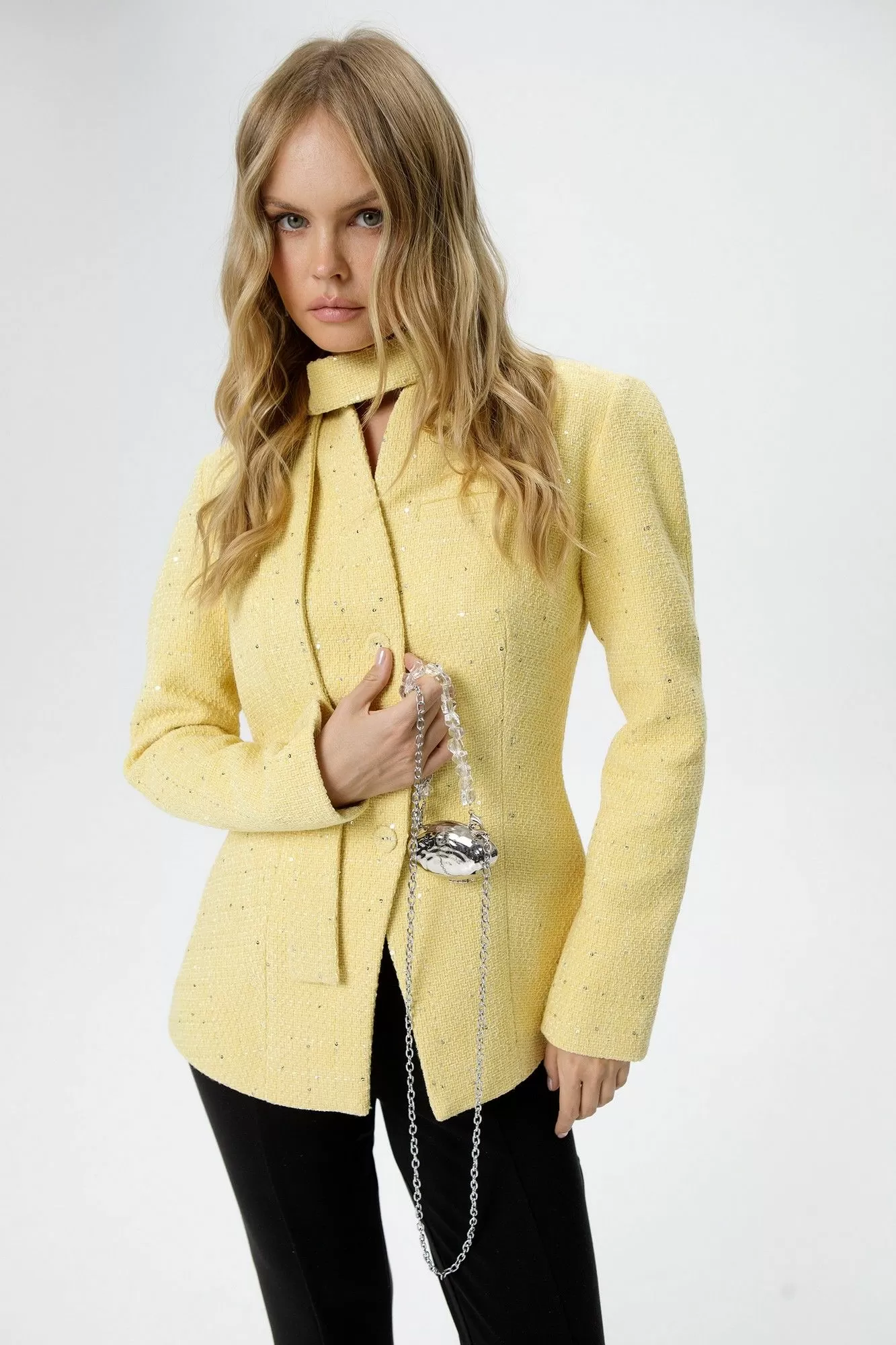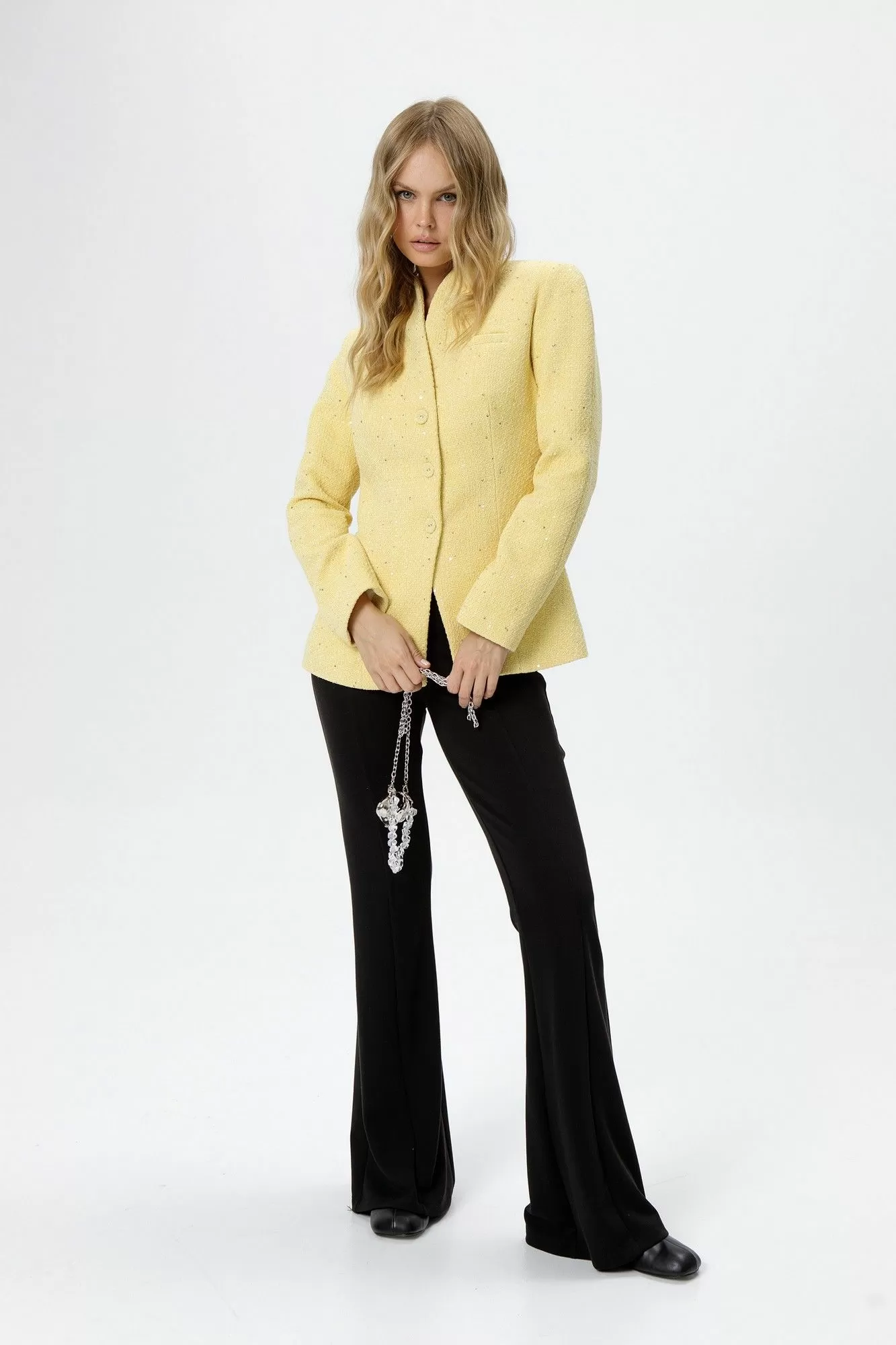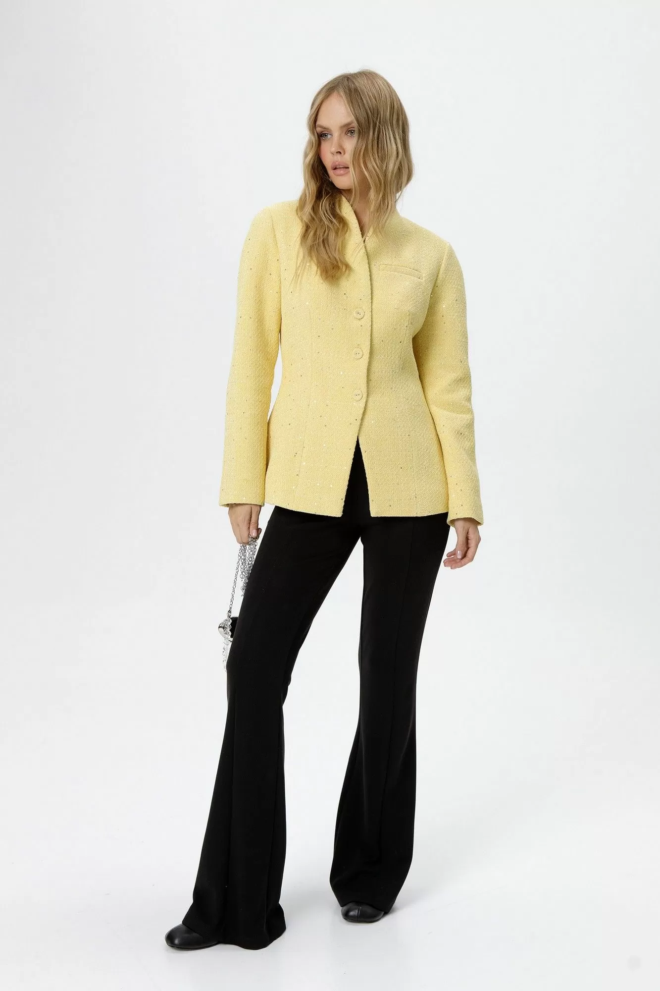 Приталенный жакет из фактурной ткани с акцентными плечами и воротником-стойкой.