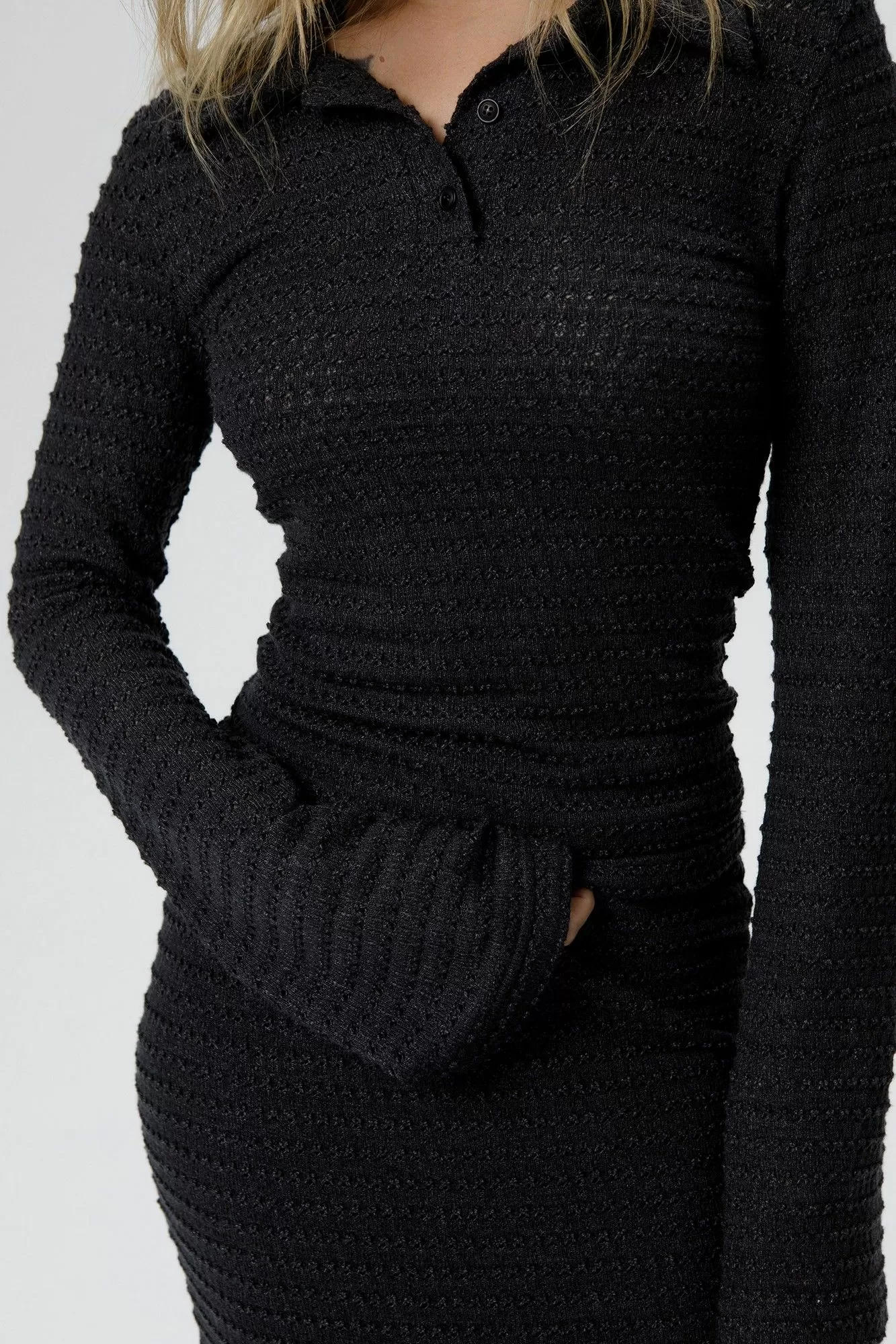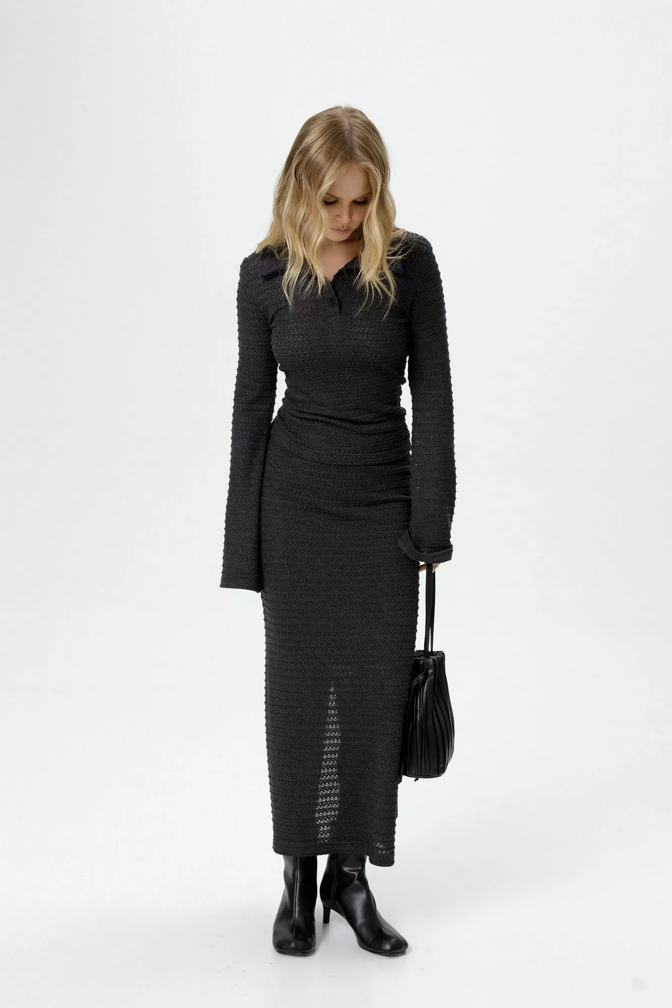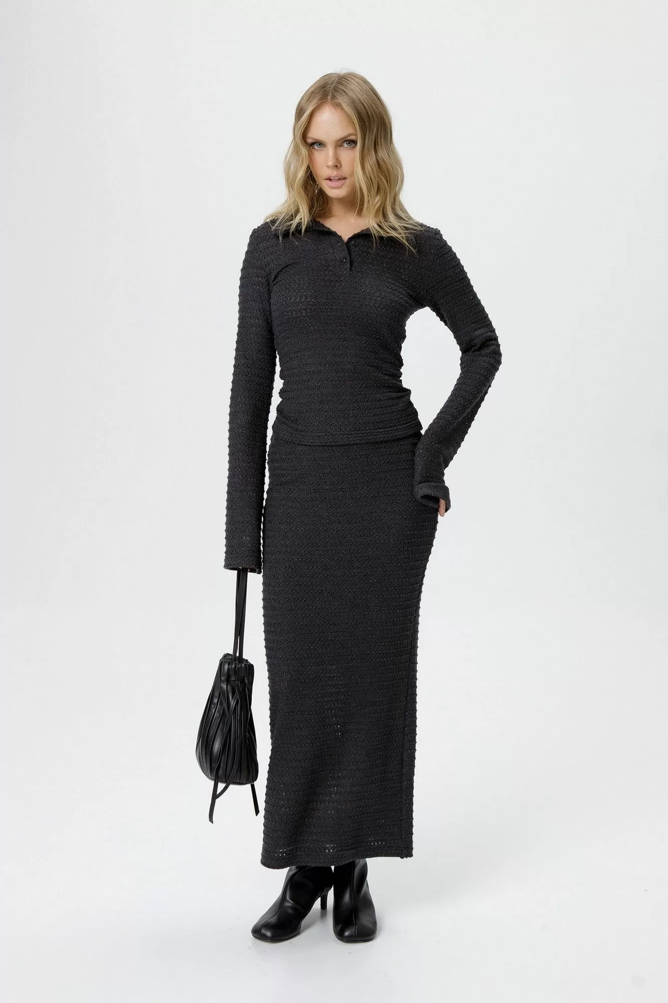 Костюм-двойка из джемпера с воротником-поло и миди-юбки из ажурного трикотажа.