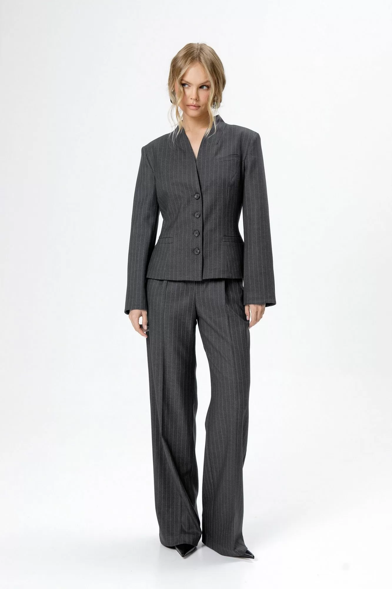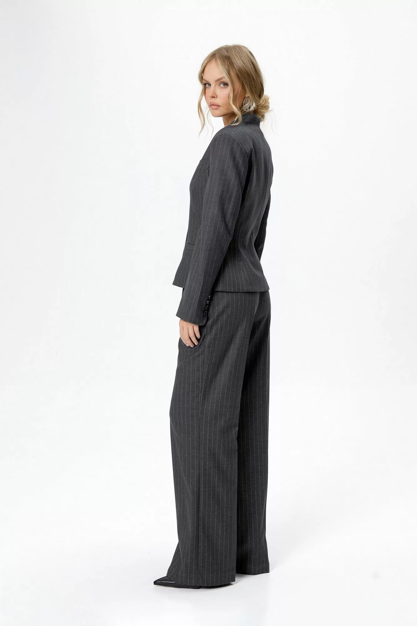 Костюм-двойка из приталенного жакета со съемным шарфиком и широких прямых брюк.