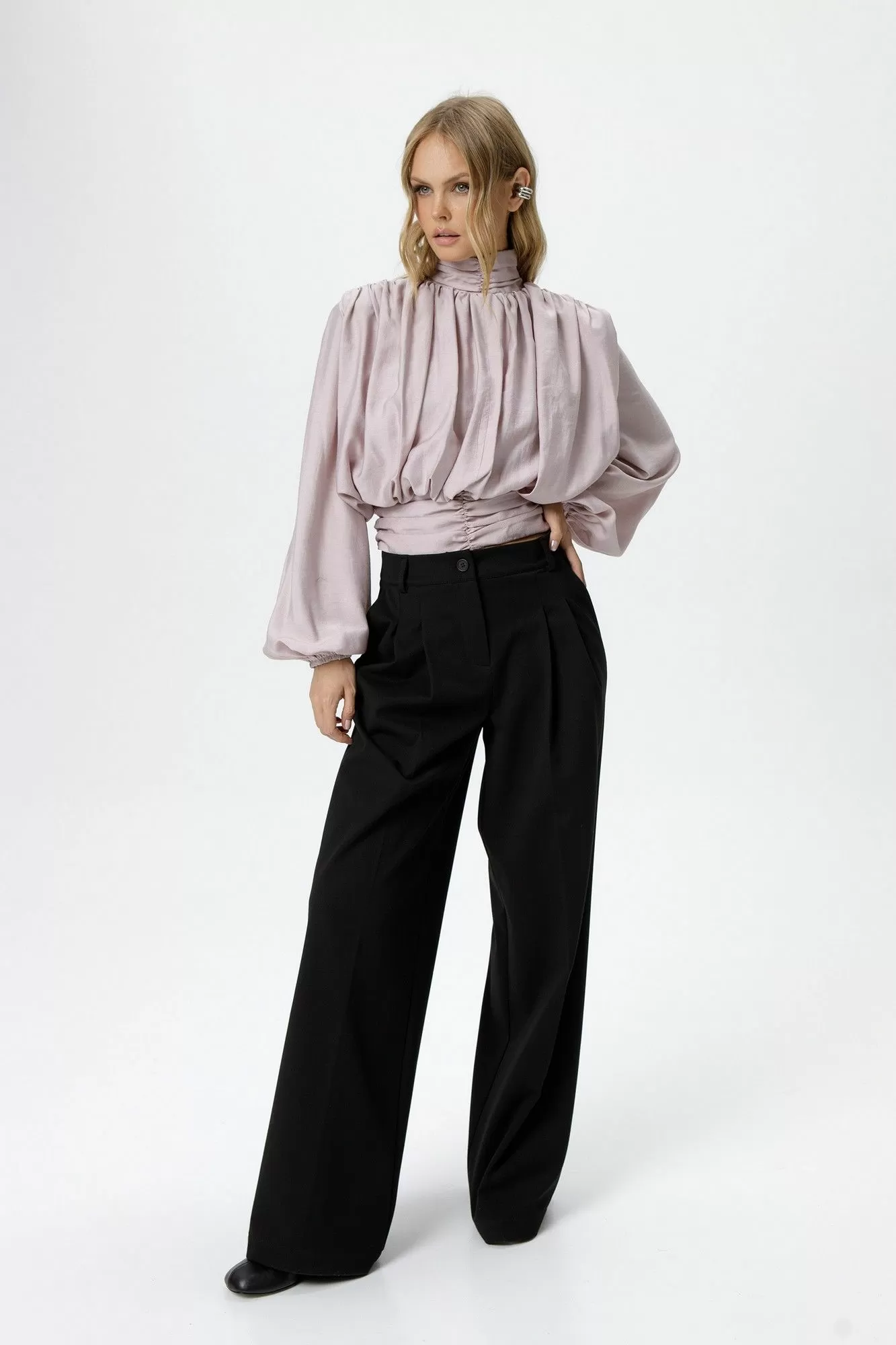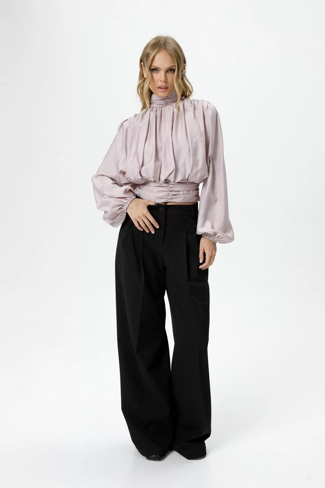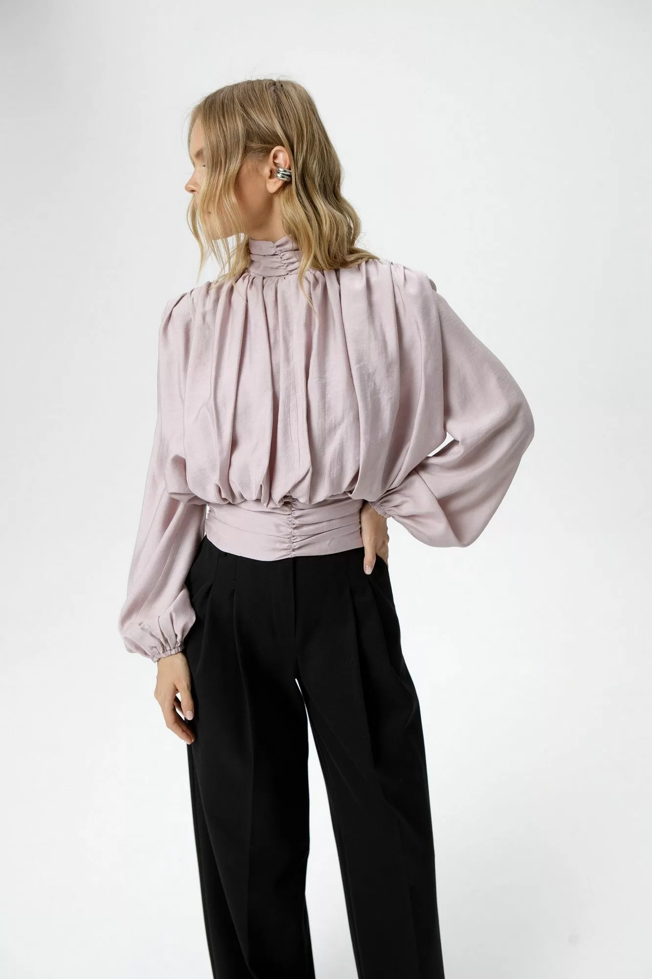 Детали: блуза приталенного силуэта, перед и спинка свободного покроя, пояс блузы со сборкой, расширенные плечи, сборки по плечам и горловине, застёжка на потайную молнию в боковом шве, воротник стойка со сборкой и застёжкой на навесные петли и пуговицы, втачные расширенные к низу рукава с резинкой по низу.