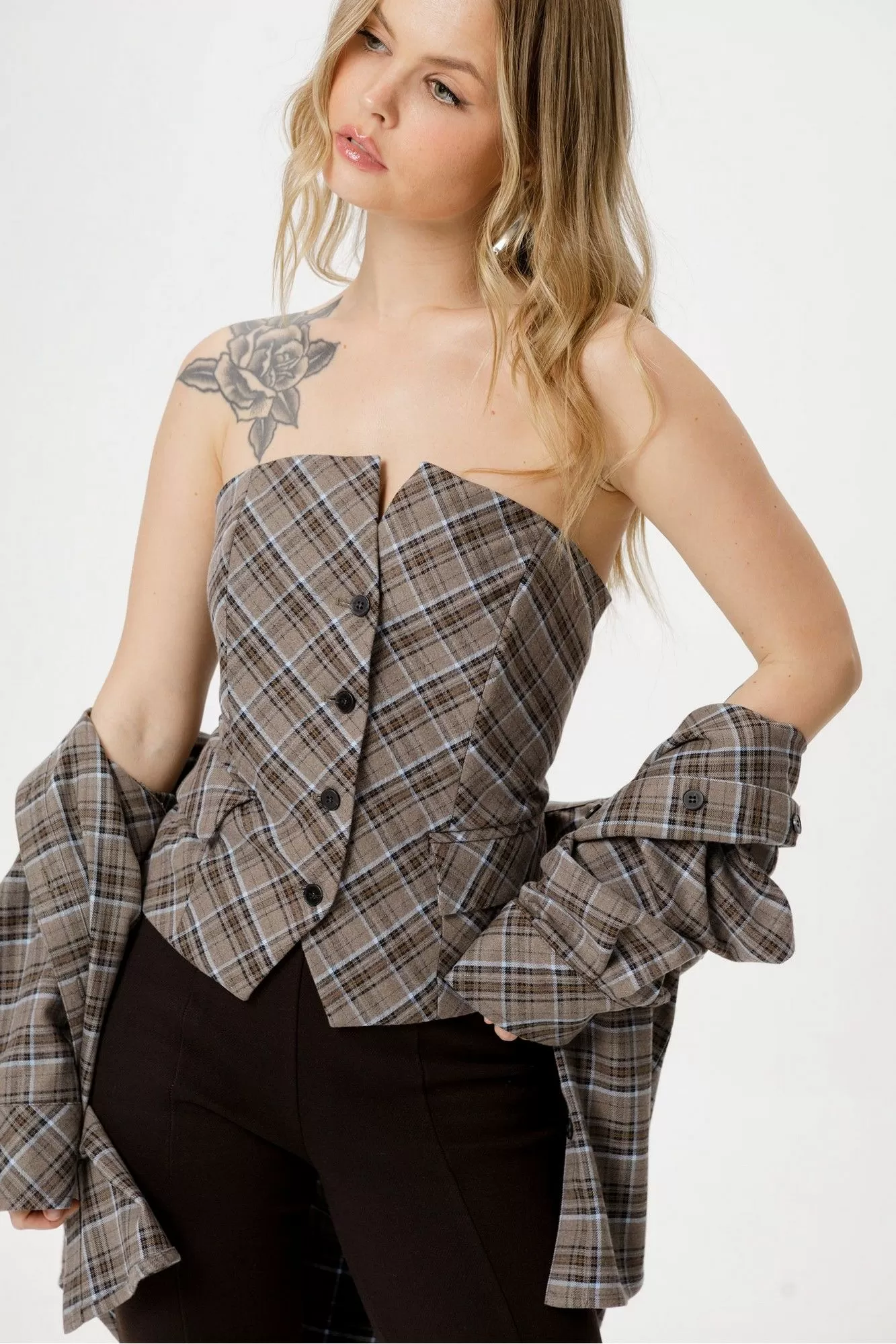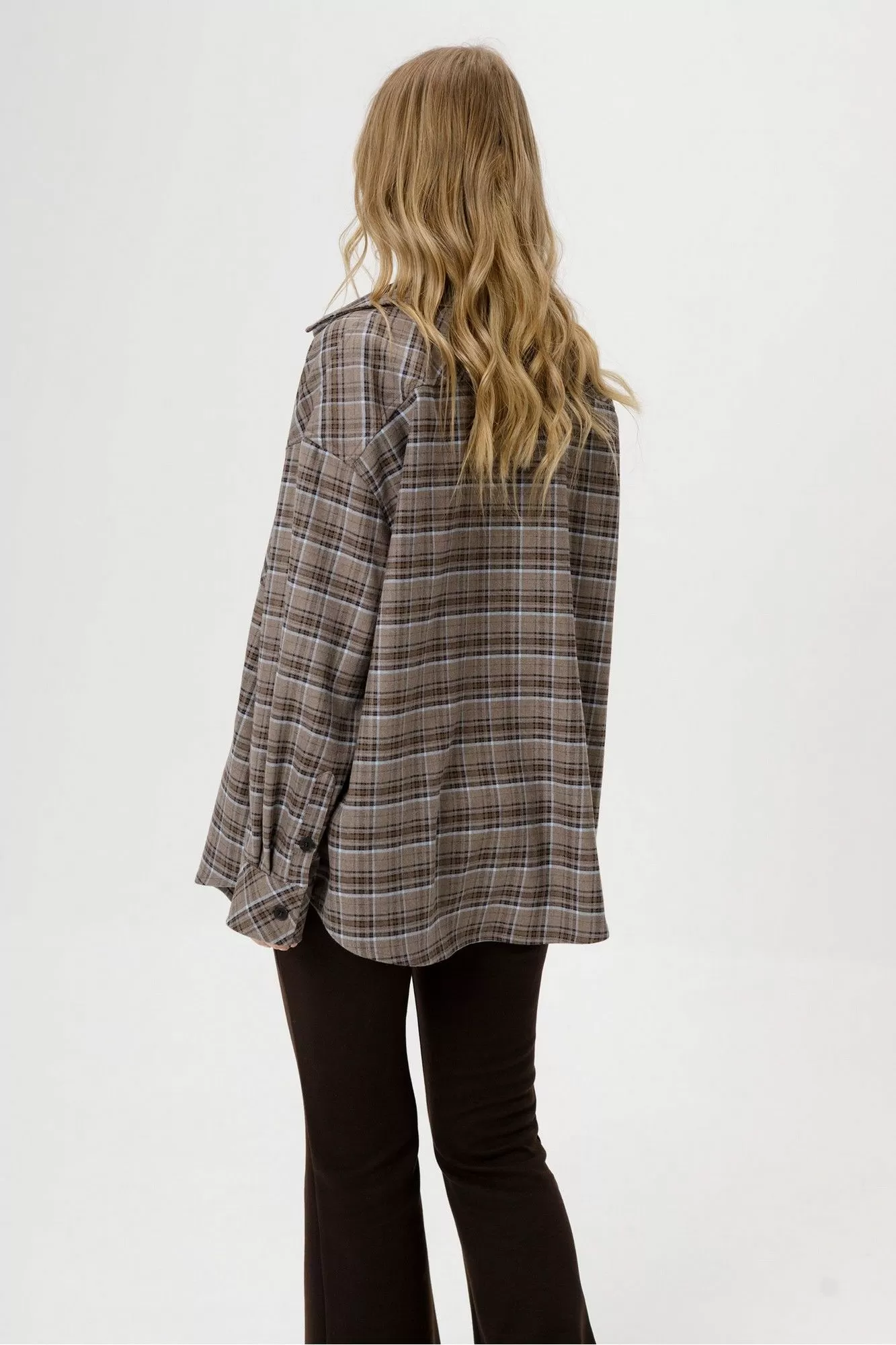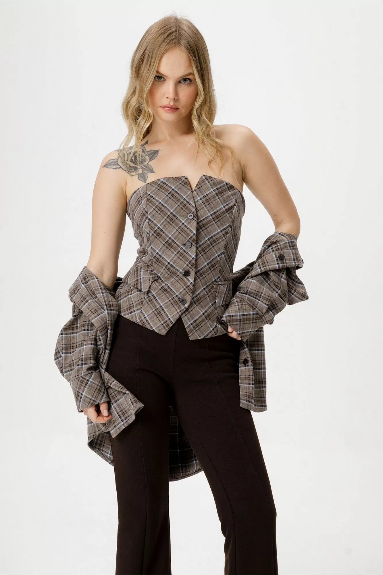 Комплект-тройка из текстильной оверсайз рубашки, топа-корсета в клетку и трикотажных облегающих брюк-клеш.
