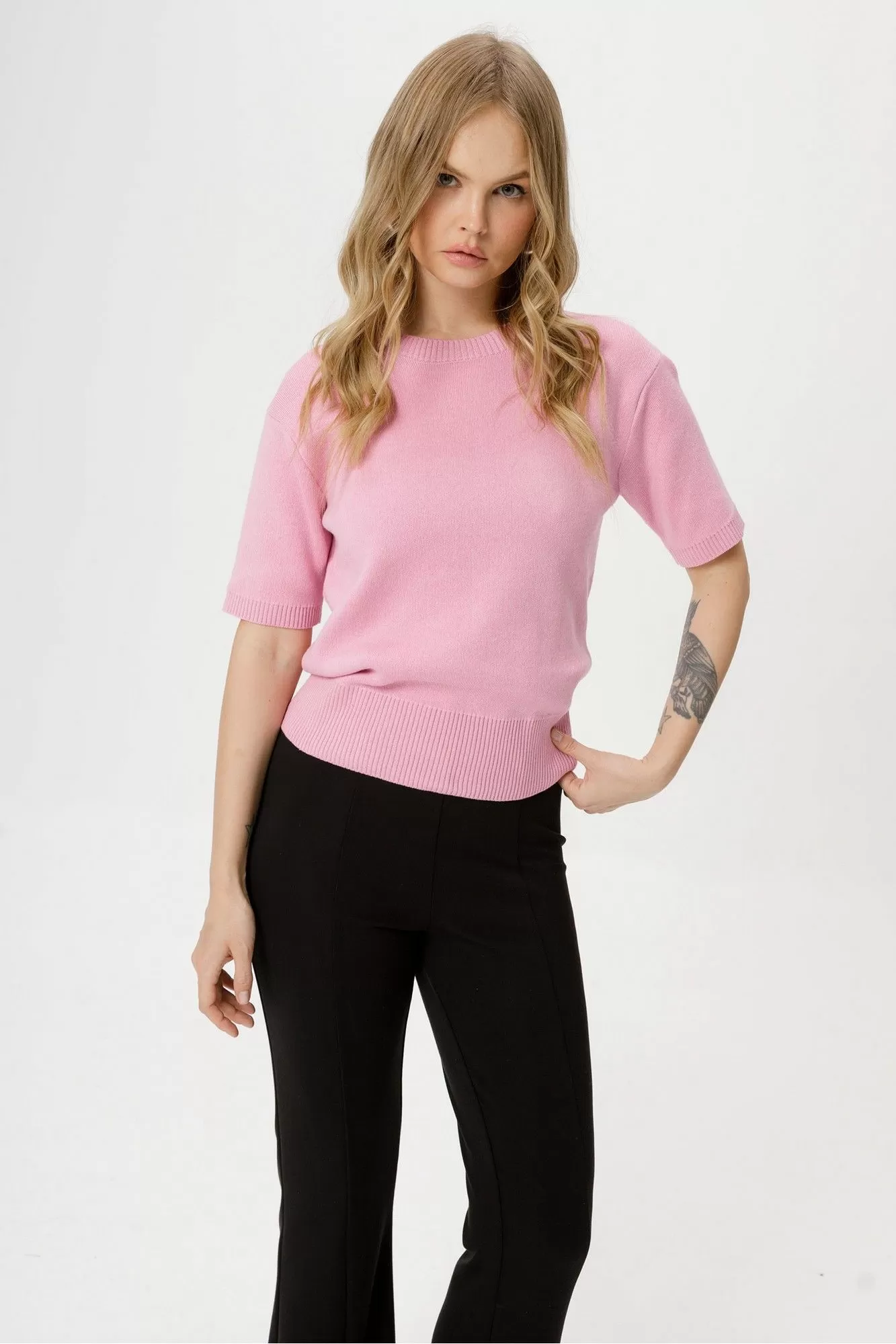 Детали: джемпер прямого силуэта с резинкой по низу, круглая грловина, рукава короткие. Брюки с высокой посадкой, перед с рельефными швами, пояс с резинкой, брюки без карманов.