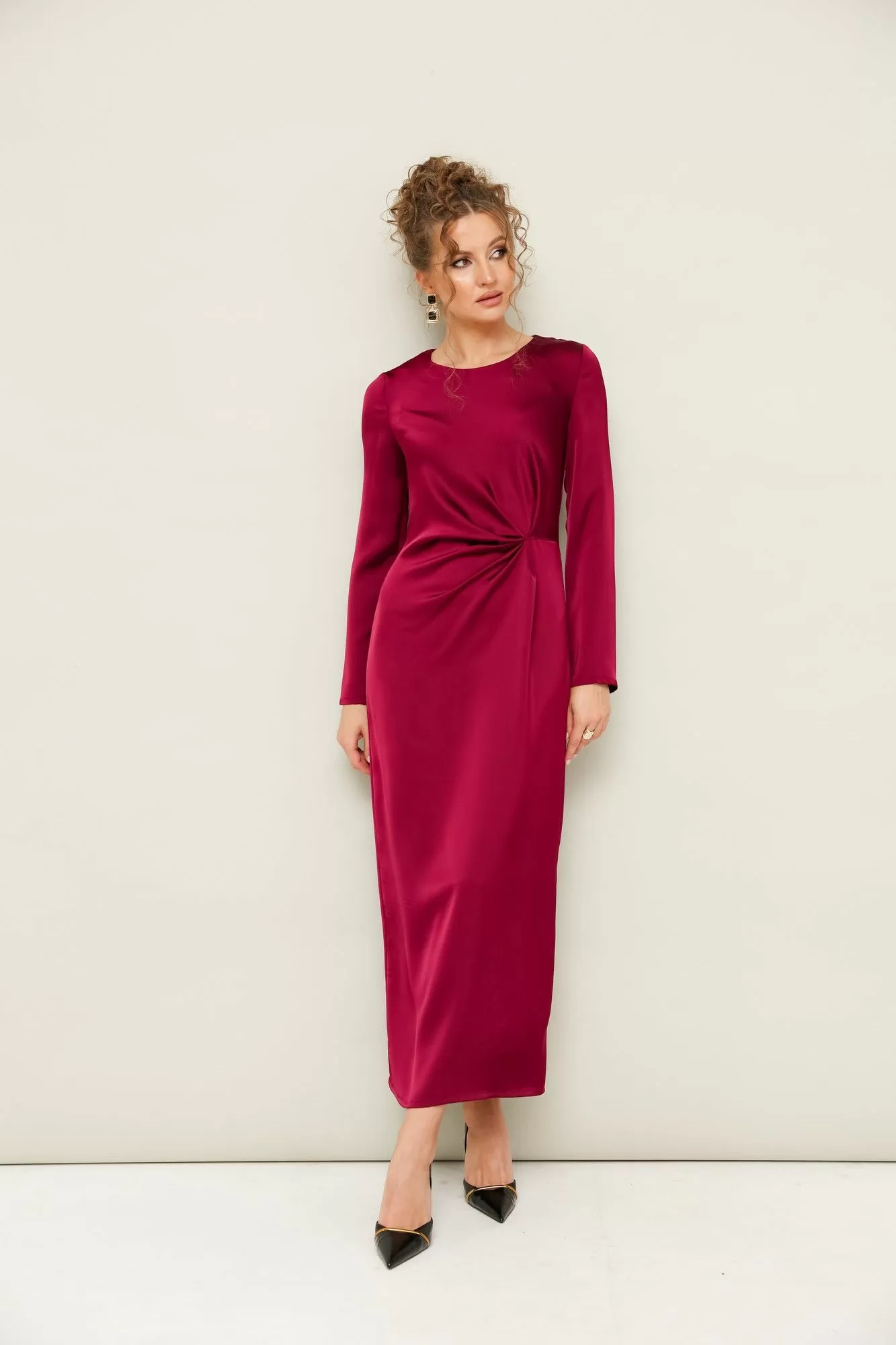 Вечернее платье полуприлегающего силуэта, выполнено из струящейся ткани с благородным матовым блеском. Горловина округлой формы. В области талии заложены складки, плавно переходящие в драпировку. Рукава втачные длинные. Застежка в среднем шве спинки на тесьму молнию. Для удобства движения сзади обработан разрез