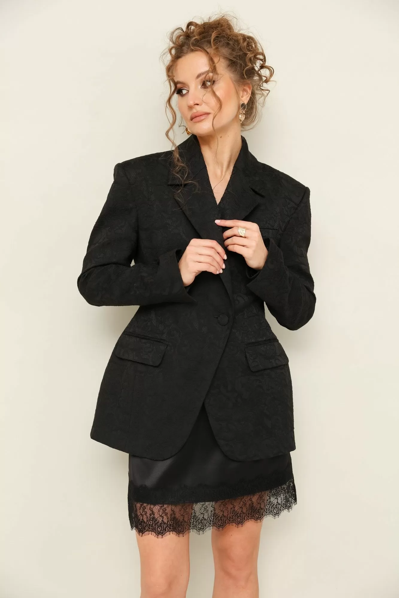 Силуэтный жакет с подчеркнутой линией талии, выполнен из жаккарда. Смещенная застежка на петлю и обтяжную пуговицу. Воротник пиджачного типа с отложными лацканами, край борта скругленный по низу жакета. Спереди обработаны прорезные карманы в рамку с клапанами и нагрудный прорезной карман с листочкой. Рукава втачные, двухшовные с отлетнымм шлицами. Спинка с рельефами и средним швом, переходящим в шлицу. Жакет на подкладке.