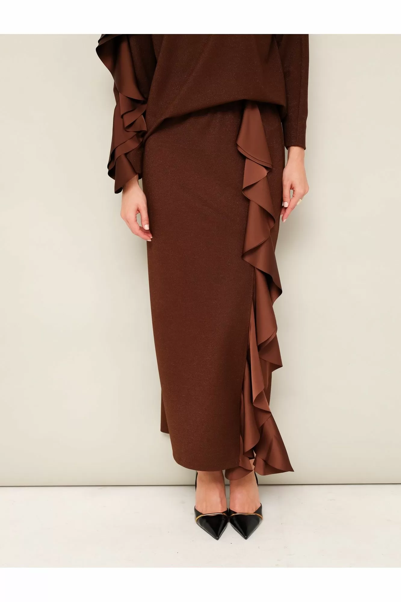 Комплект декорирован двойным сатиновым воланом по плечевому шву, рукаву и по вертикальному подрезу в юбке.