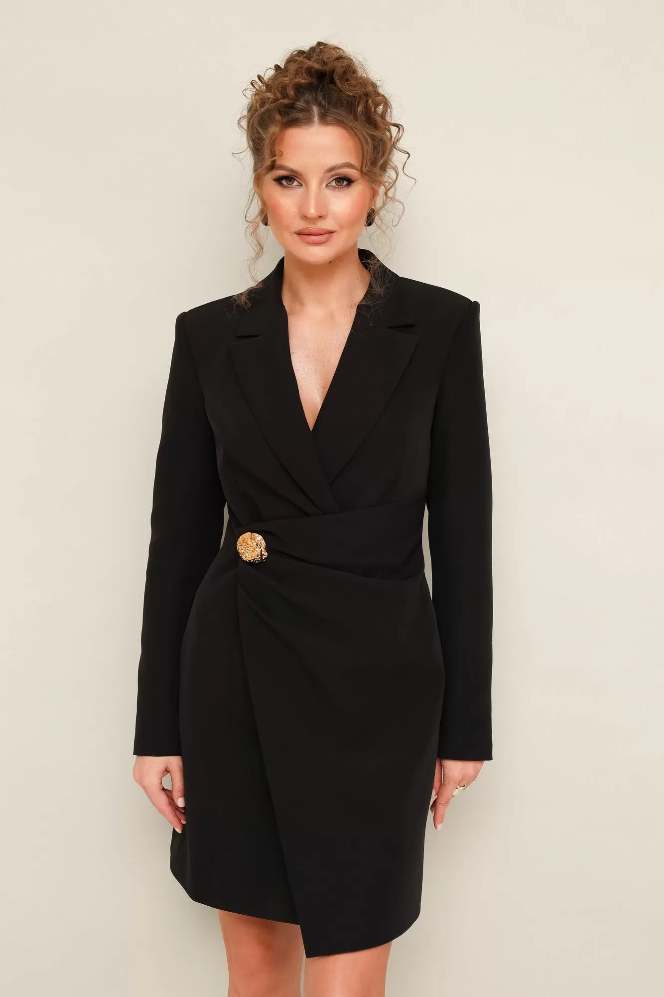 Платье-жакет полуприлегающего кроя, выполнено из костюмной ткани. Воротник пиджачного типа с отложными лацканами. Двубортная застежка на петли и пуговицы. Перед с имитацией запаха с застежкой на акцентную кнопку. Рукава втачные двухшовные. Спинка с рельефами и средним швом. Платье-жакет на подкладке.