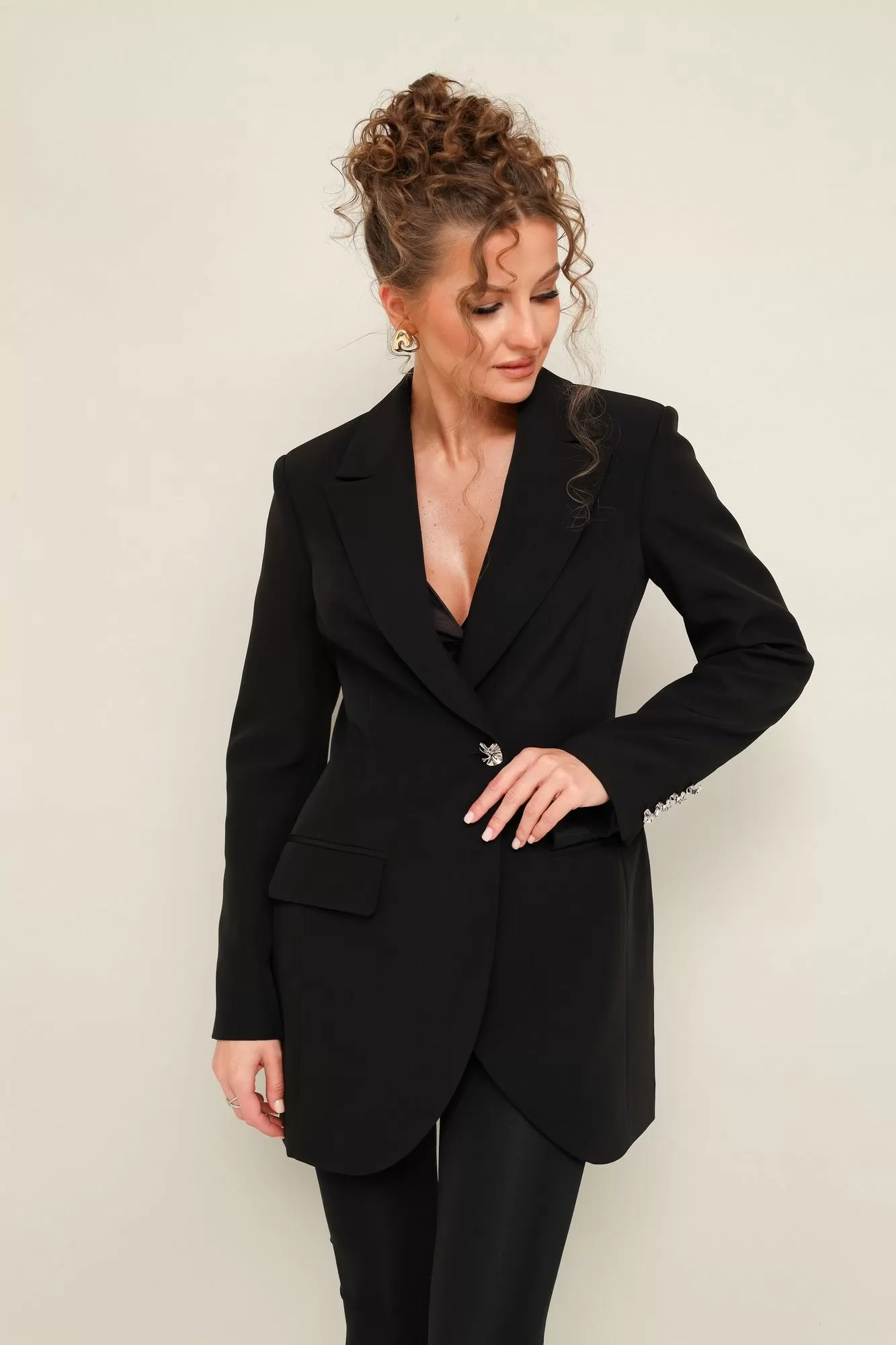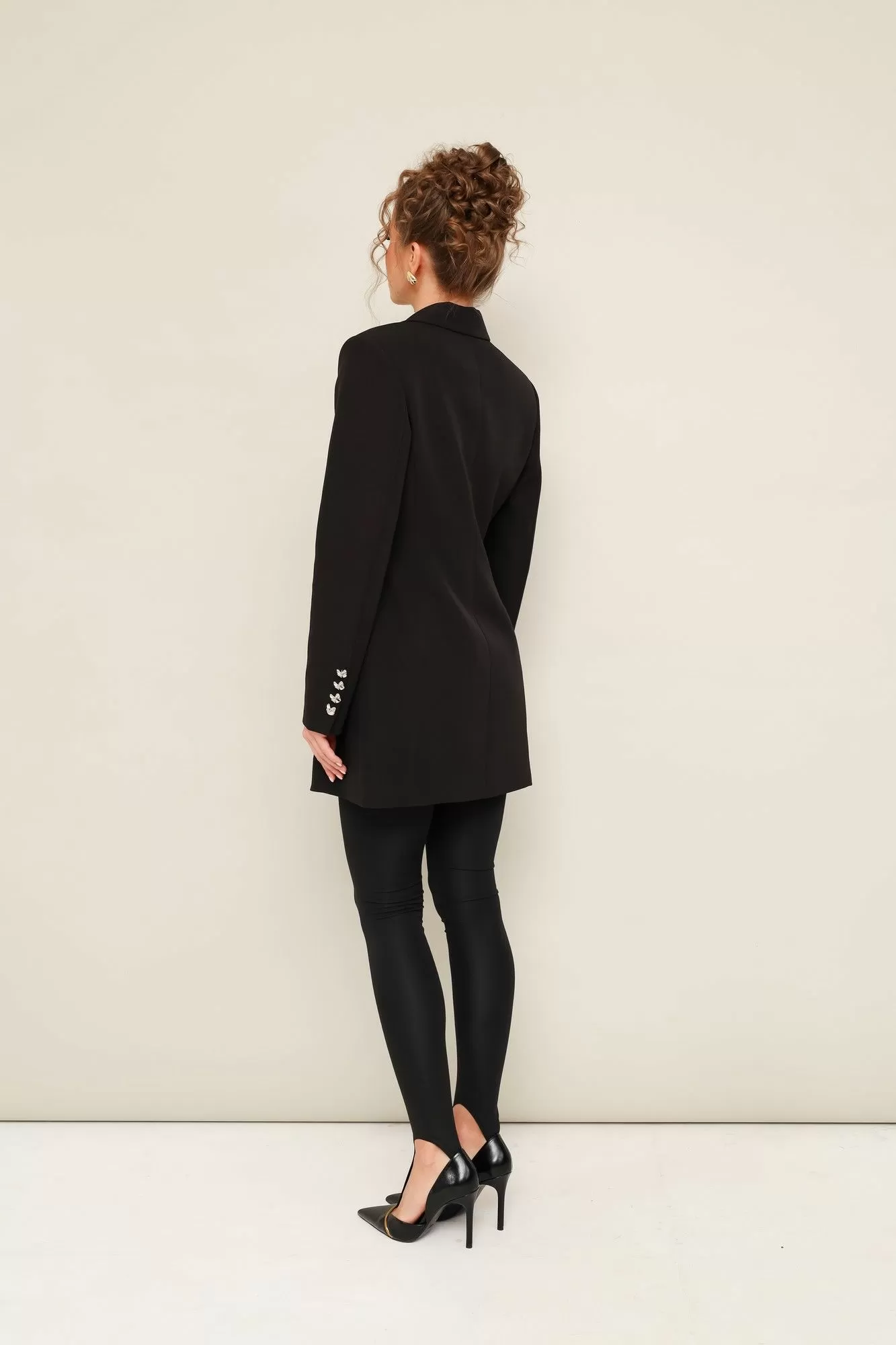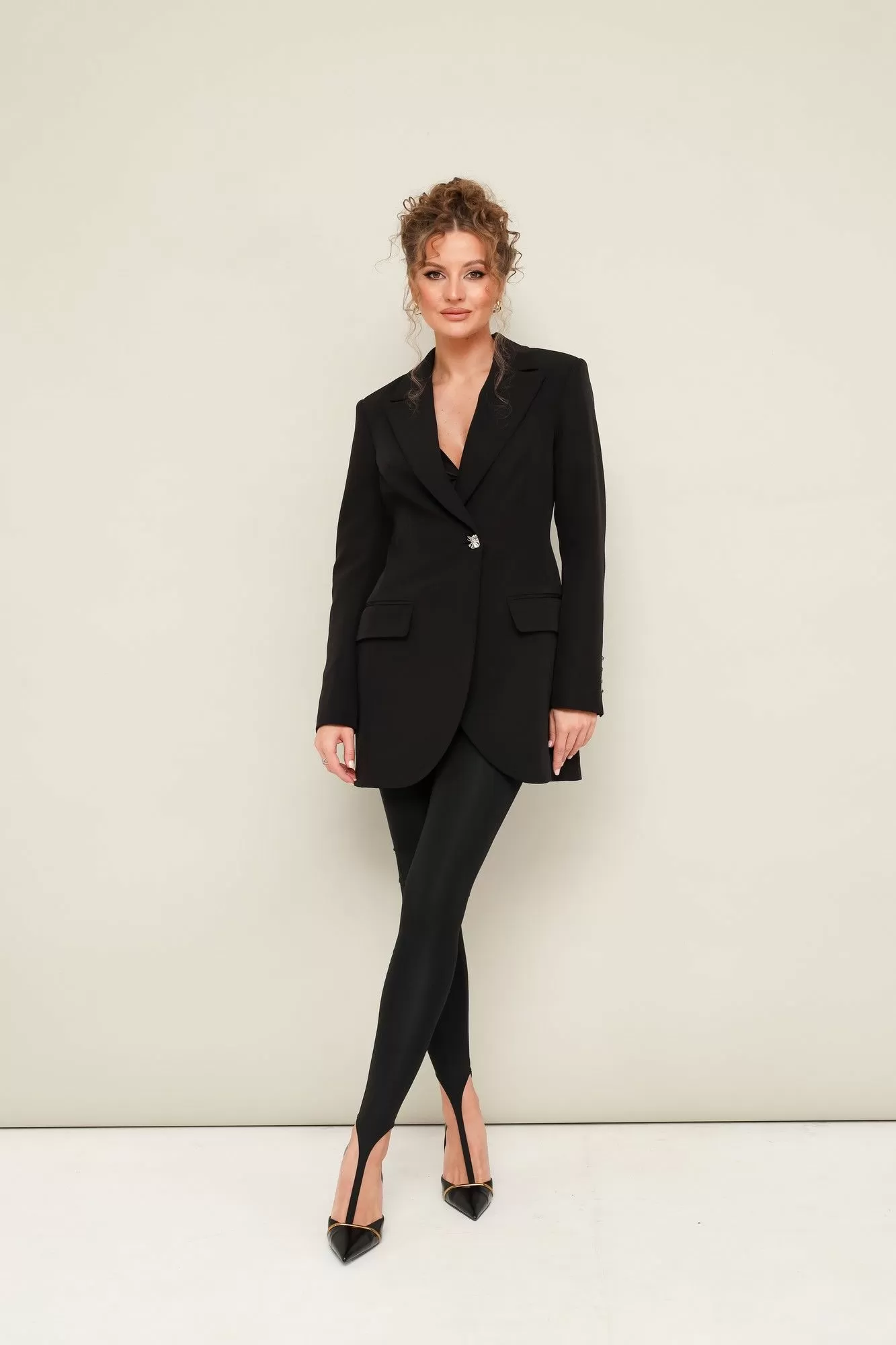 Стильный жакет полуприлегающего силуэта, выполнен из костюмной ткани. Смещенная застежка на петлю и пуговицу. Воротник пиджачного типа с отложными лацканами, край борта скругленный по низу жакета. Спереди обработаны прорезные карманы в рамку с клапанами. Рукава втачные, двухшовные со шлицами с застежкой на петли и пуговицы. Спинка с рельефами и средним швом. Жакет на подкладке.В комплекте прилагаются леггинсы со штрипками.