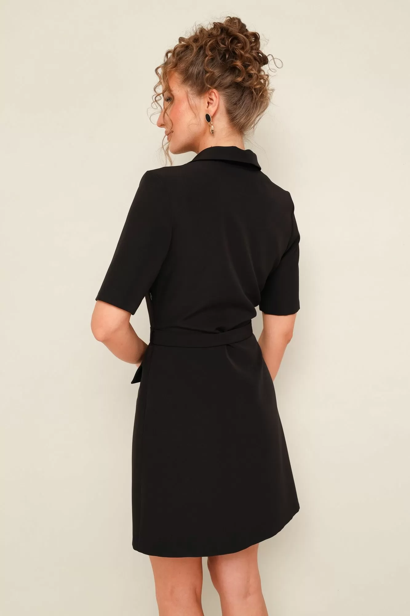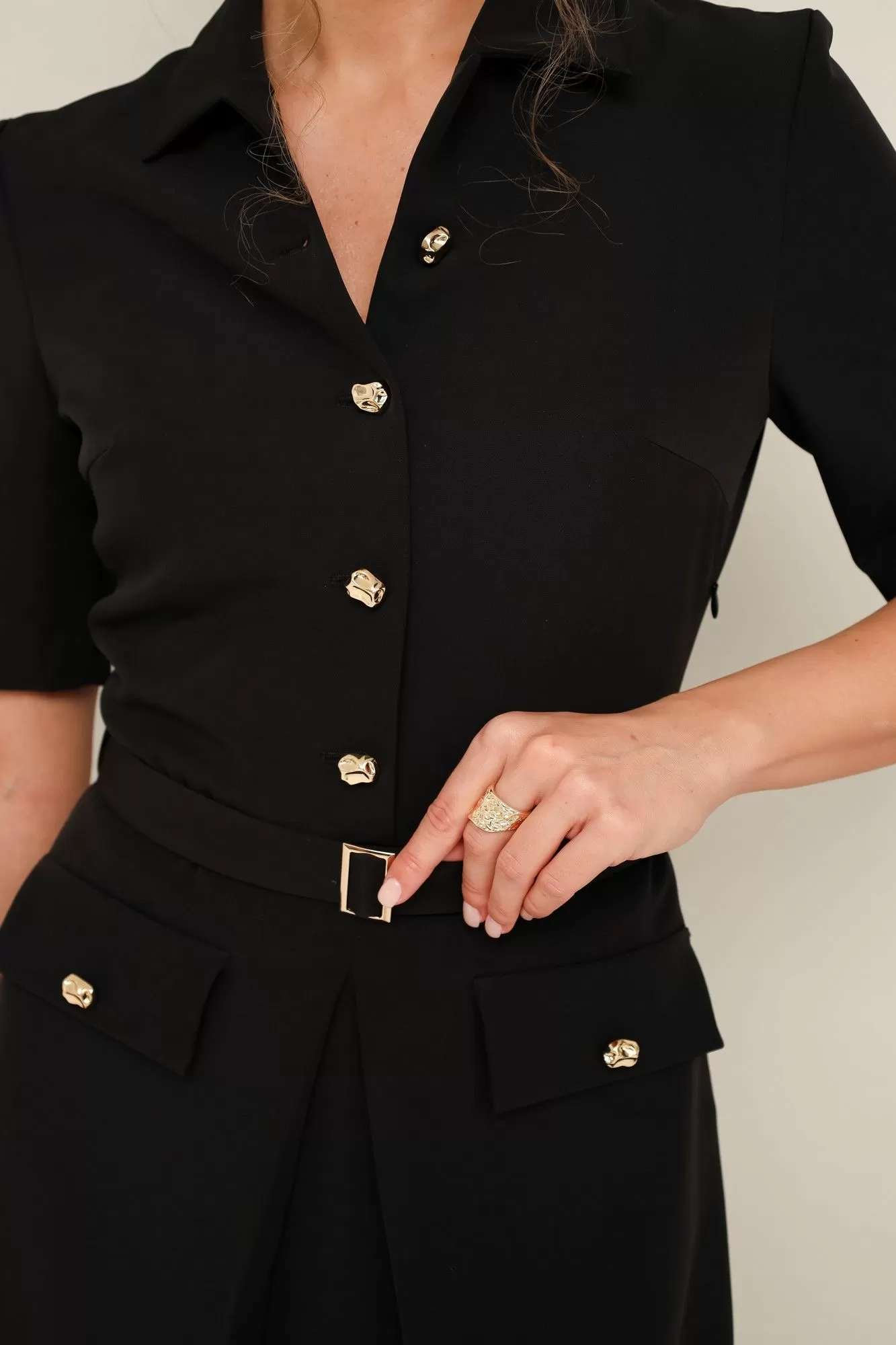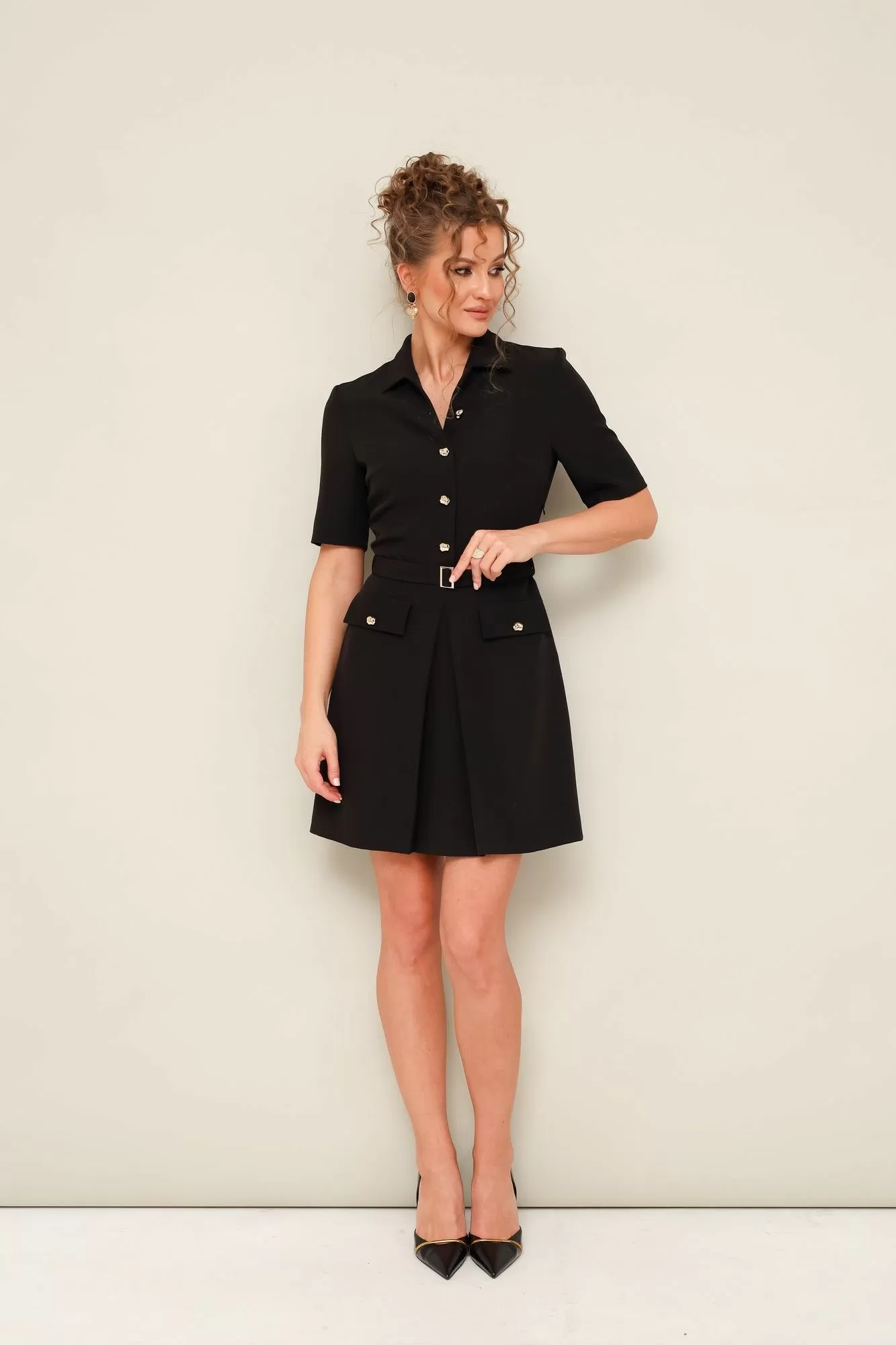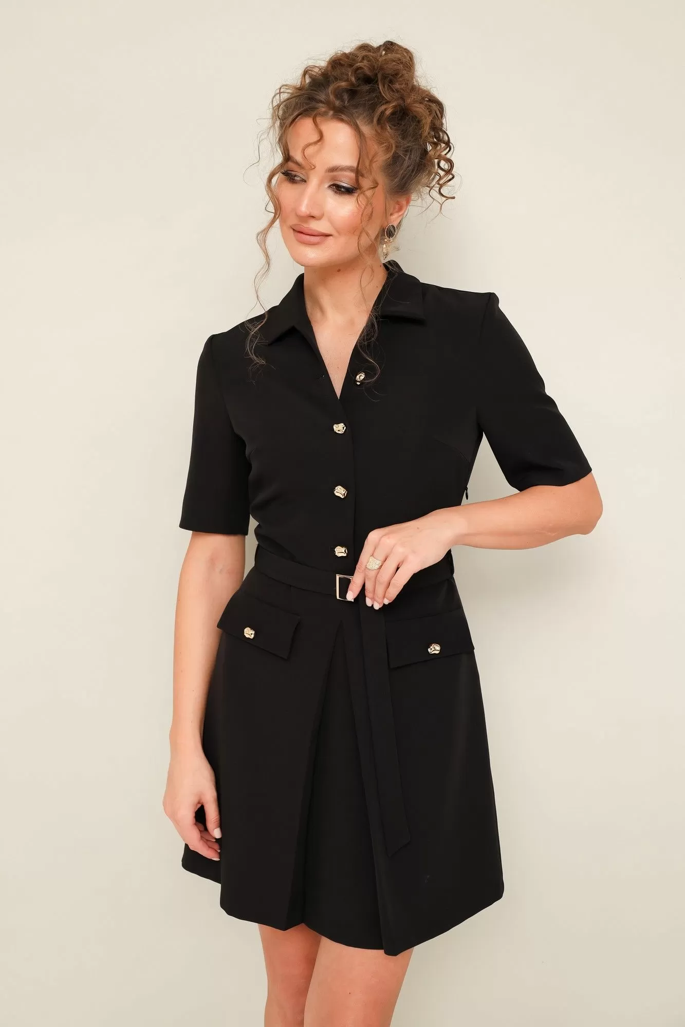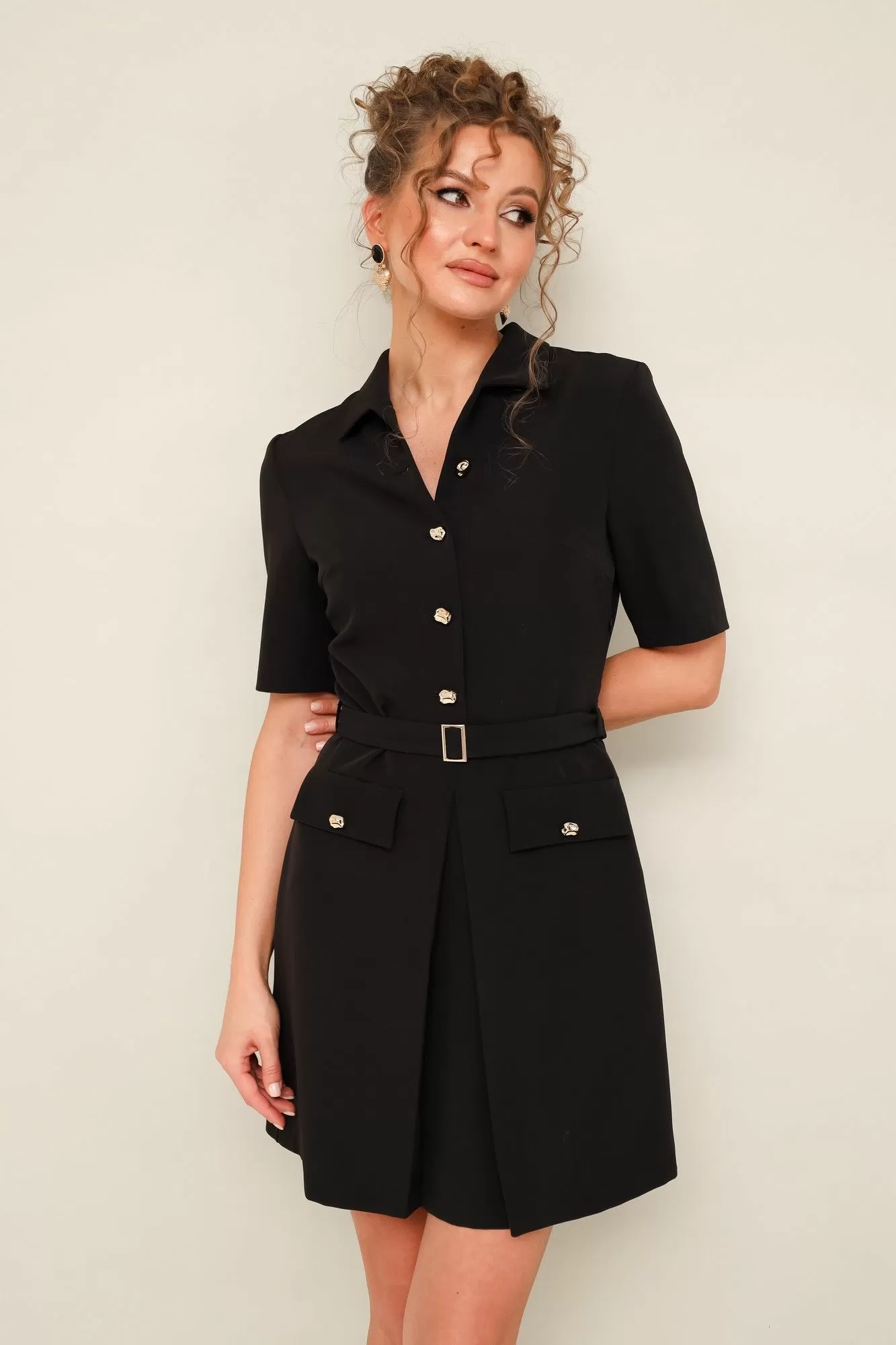 Платье отрезное по линии талии, выполнено из плательной ткани. Горловина с отложным воротником. Лиф с центральной застёжкой на петли и пуговицы. Втачные короткие рукава. Юбка А-образного силуэта, с центральной встречной складкой и с накладными клапанами с пуговицами. В комплекте съемный пояс с пряжкой. По талиии предусмотрены шлевки.