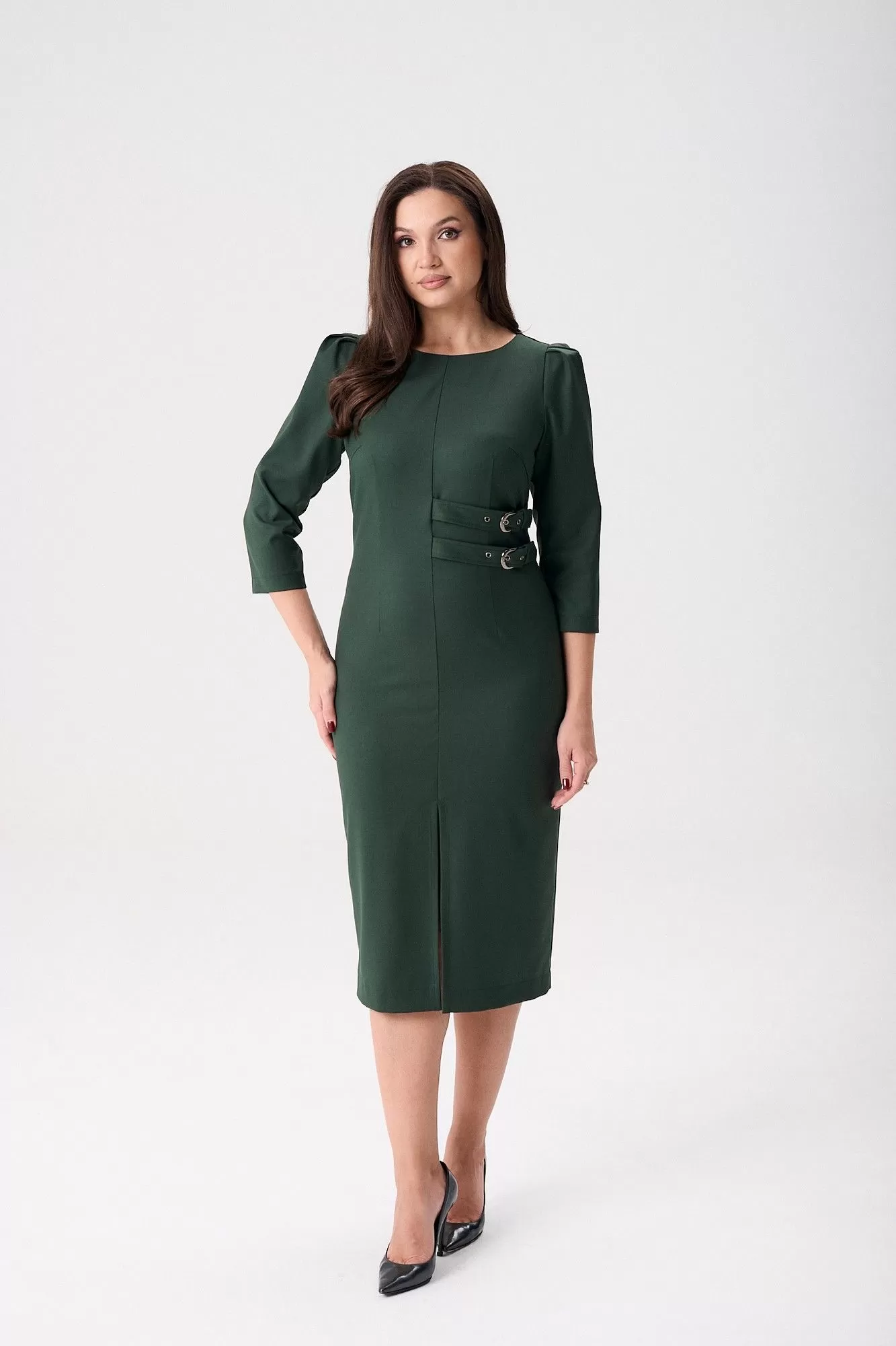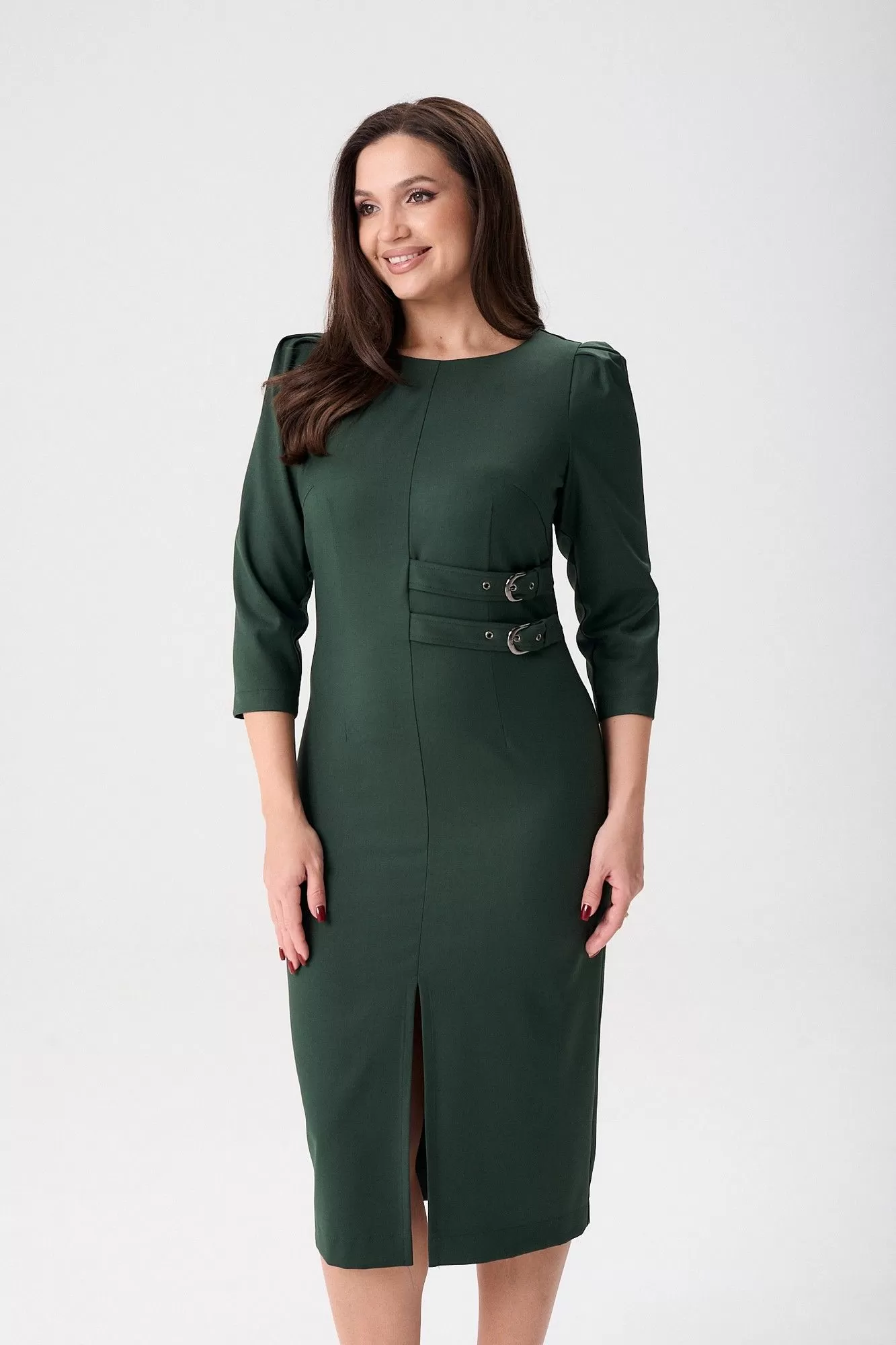 Платье женское прямого силуэта выполнено из плательной ткани. Платье с округлой горловиной. По переду платья расположены талиевые выточки и средний шов, переходящий к низу в разрез, придающий нотку игривости и удобства. Сбоку по переду платья имеется два декоративных хлястика с пряжками. Спинка прямая разрезная на потайную застежку-молнию и талиевыми выточками. Рукав прямой втачной, длиной 7/8, одношовный, со складками по окату.